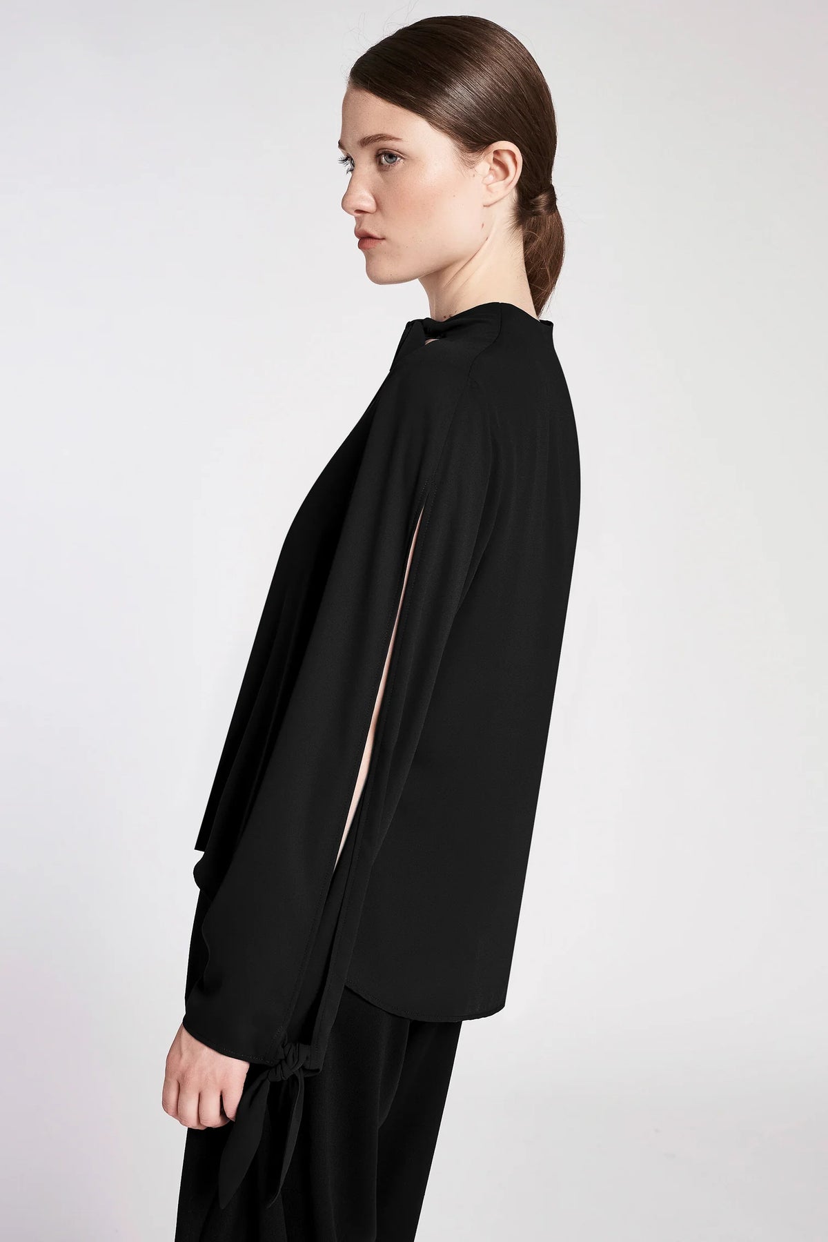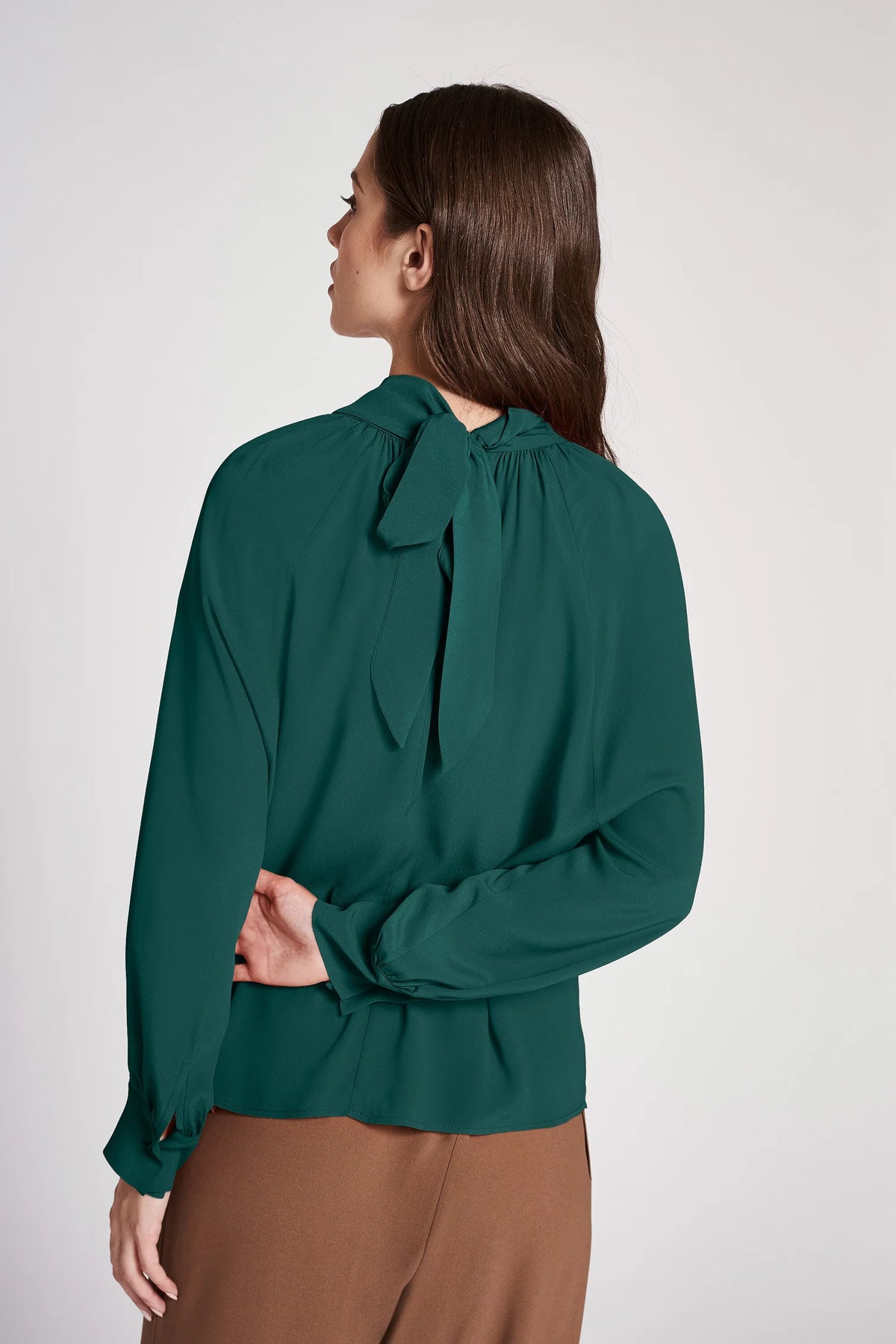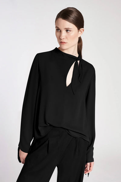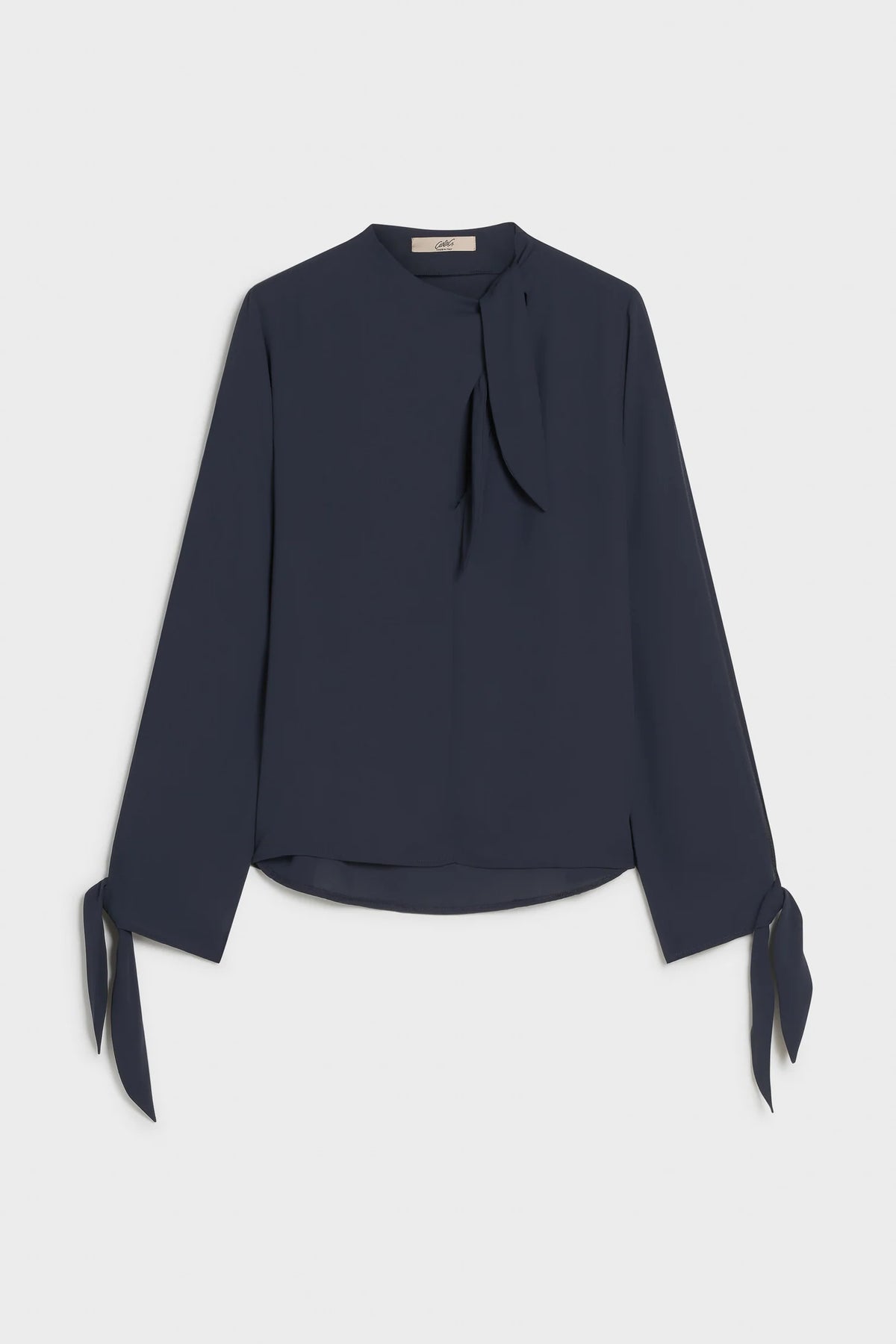 Camicia in crepe de chine con scollo a nodo che diventa nastro da annodare dietro. Maniche ampie con polsini chiusi da bottoni in madreperla. Lunghezza ai fianchi.