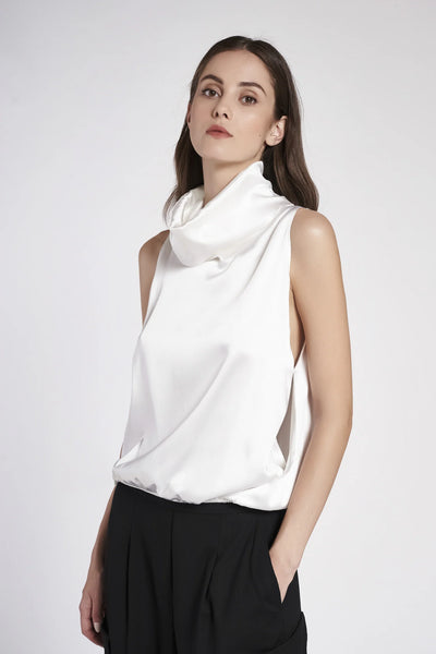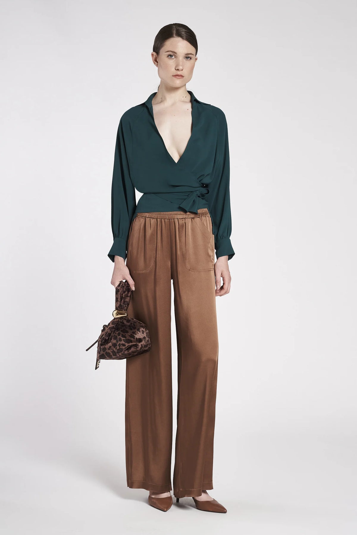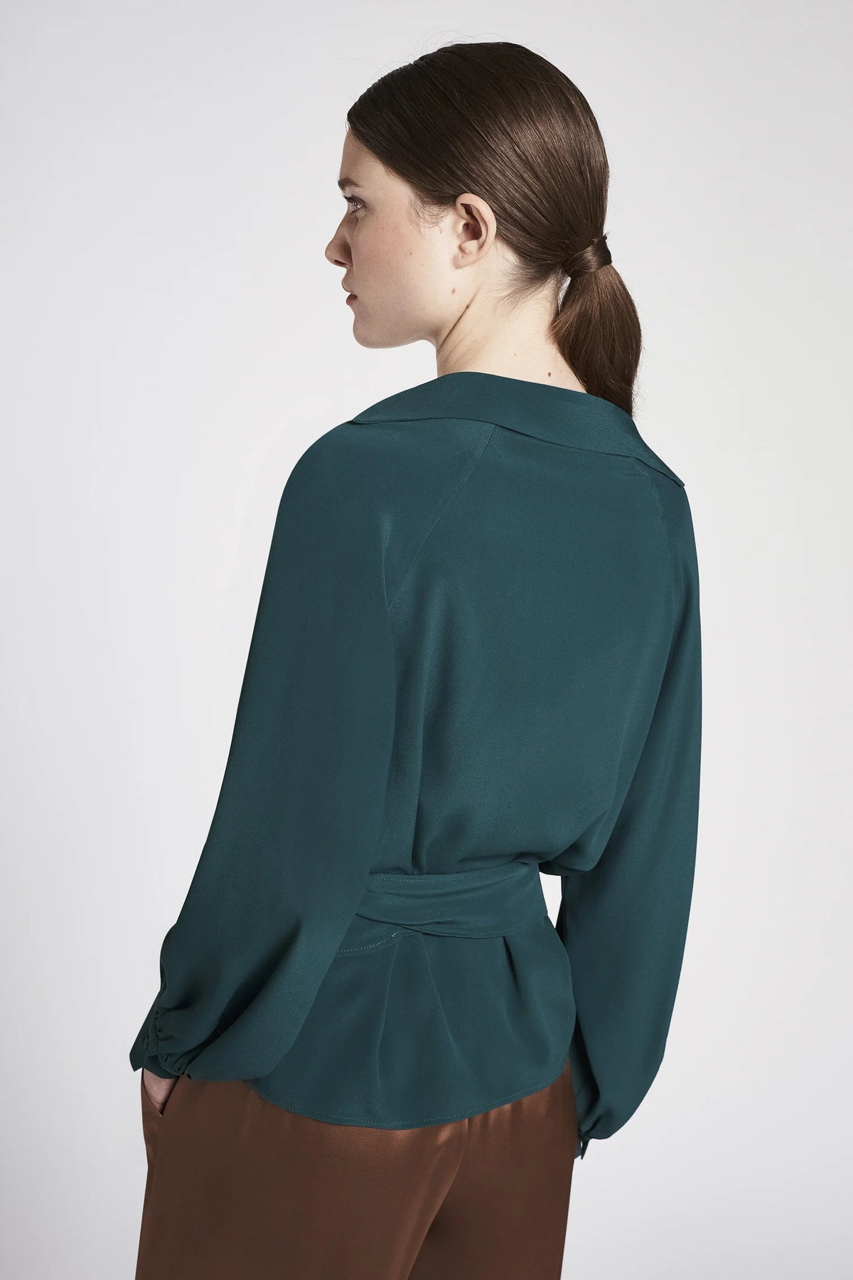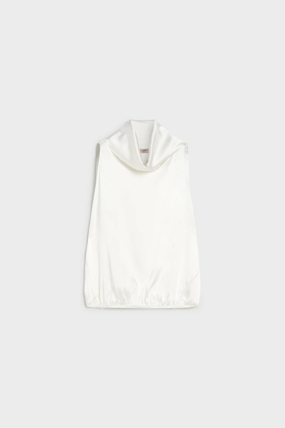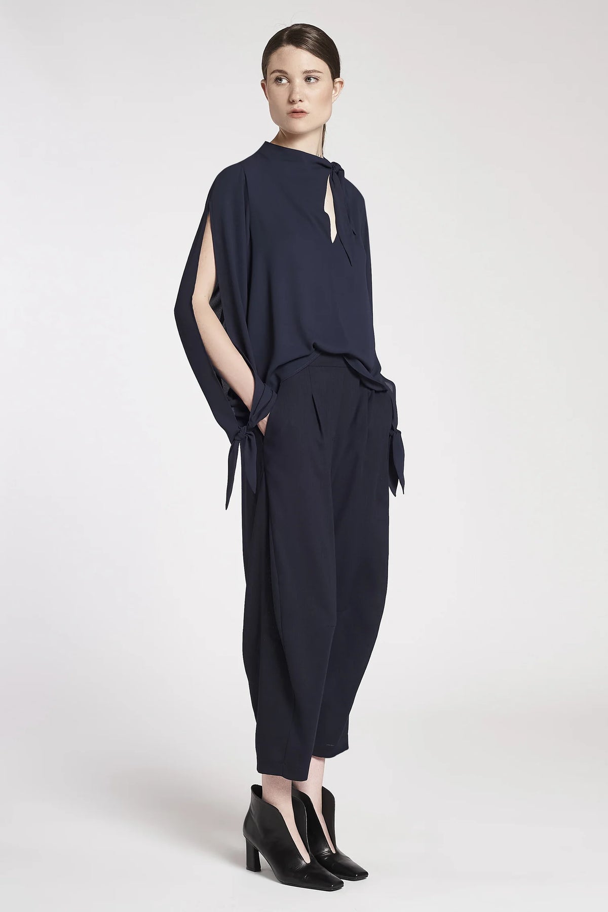 Camicia in crepe de chine con scollo a nodo che diventa nastro da annodare dietro. Maniche ampie con polsini chiusi da bottoni in madreperla. Lunghezza ai fianchi.