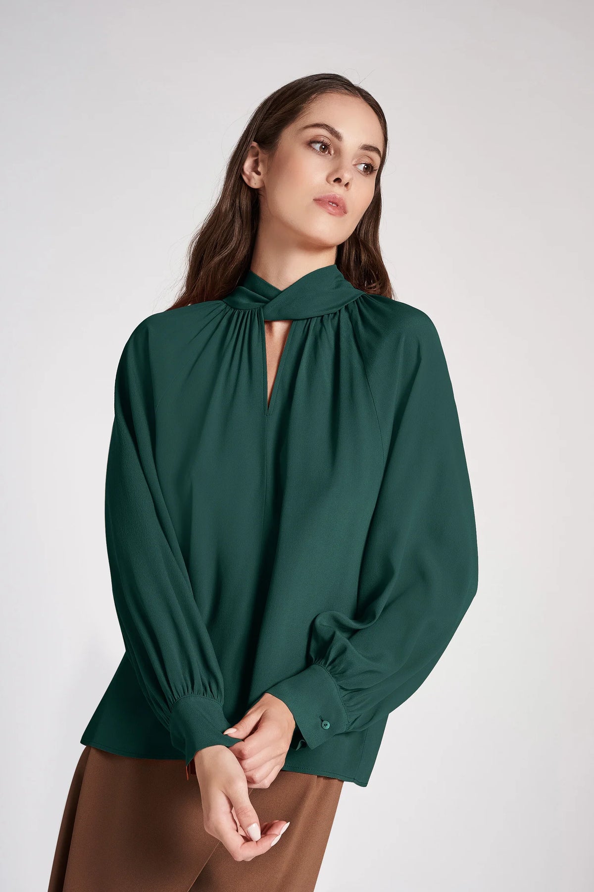 Camicia a maniche lunghe in crepe. Collo alto che diventa nastro da annodare dietro e rouche sul davanti. Maniche arricciate nel fondo con polsini e bottoni in madreperla, lunghezza ai fianchi.