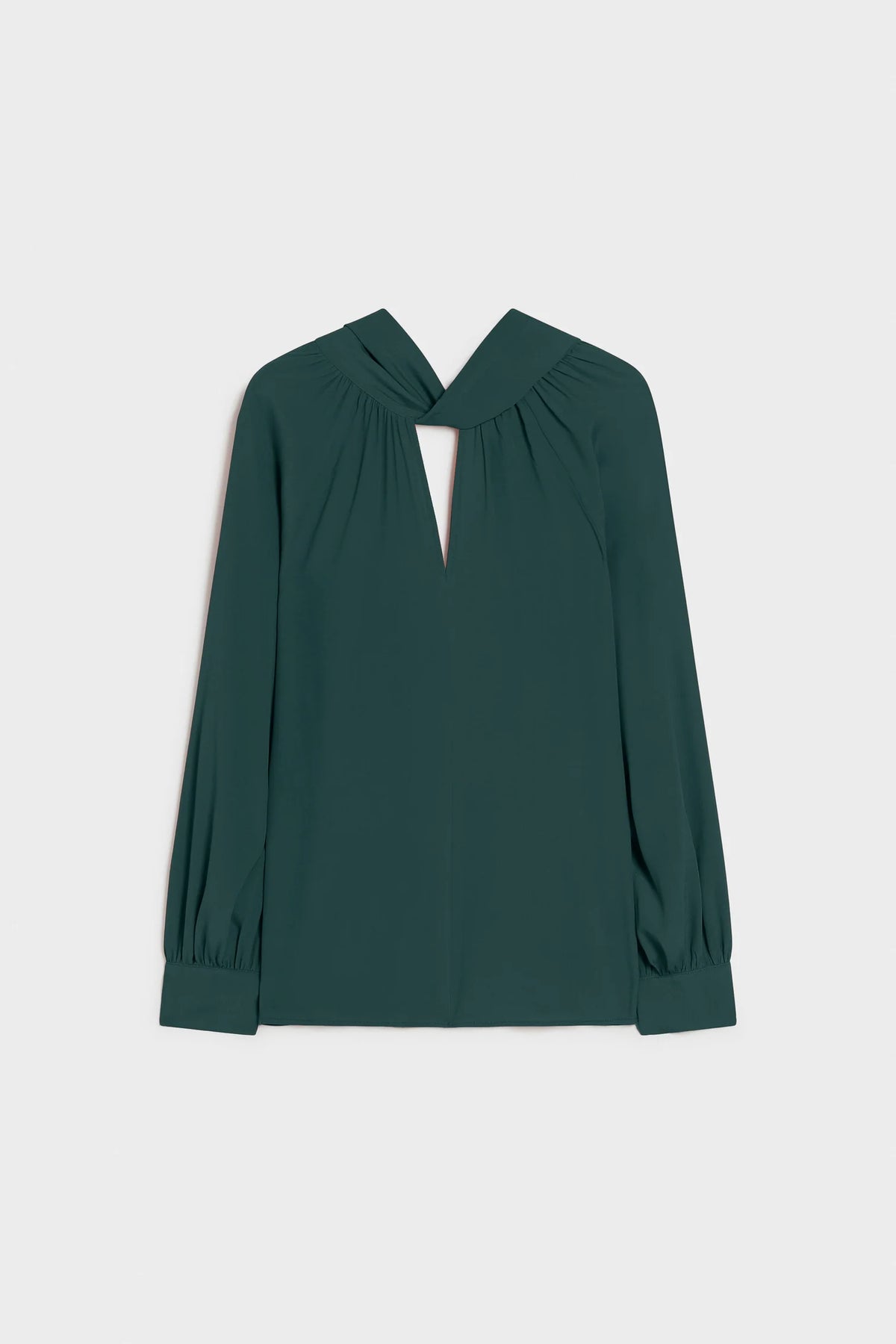 Camicia a maniche lunghe in crepe. Doppio collo ad anello da poter indossare sul davanti o dietro. Maniche ampie e polsini chiusi da bottoni in madreperla. Fondo davanti più corto e spacchetti laterali. Lunghezza sotto i fianchi.