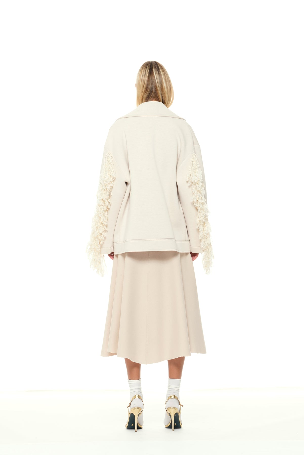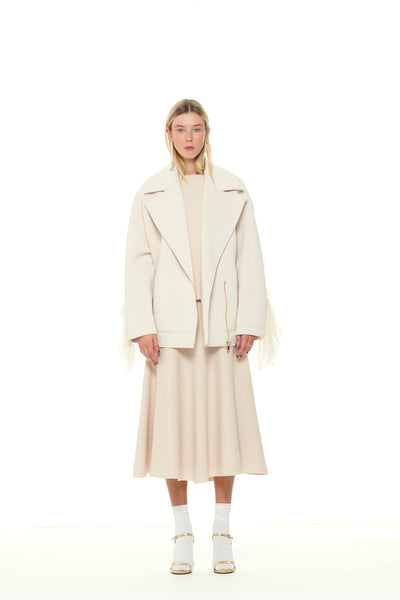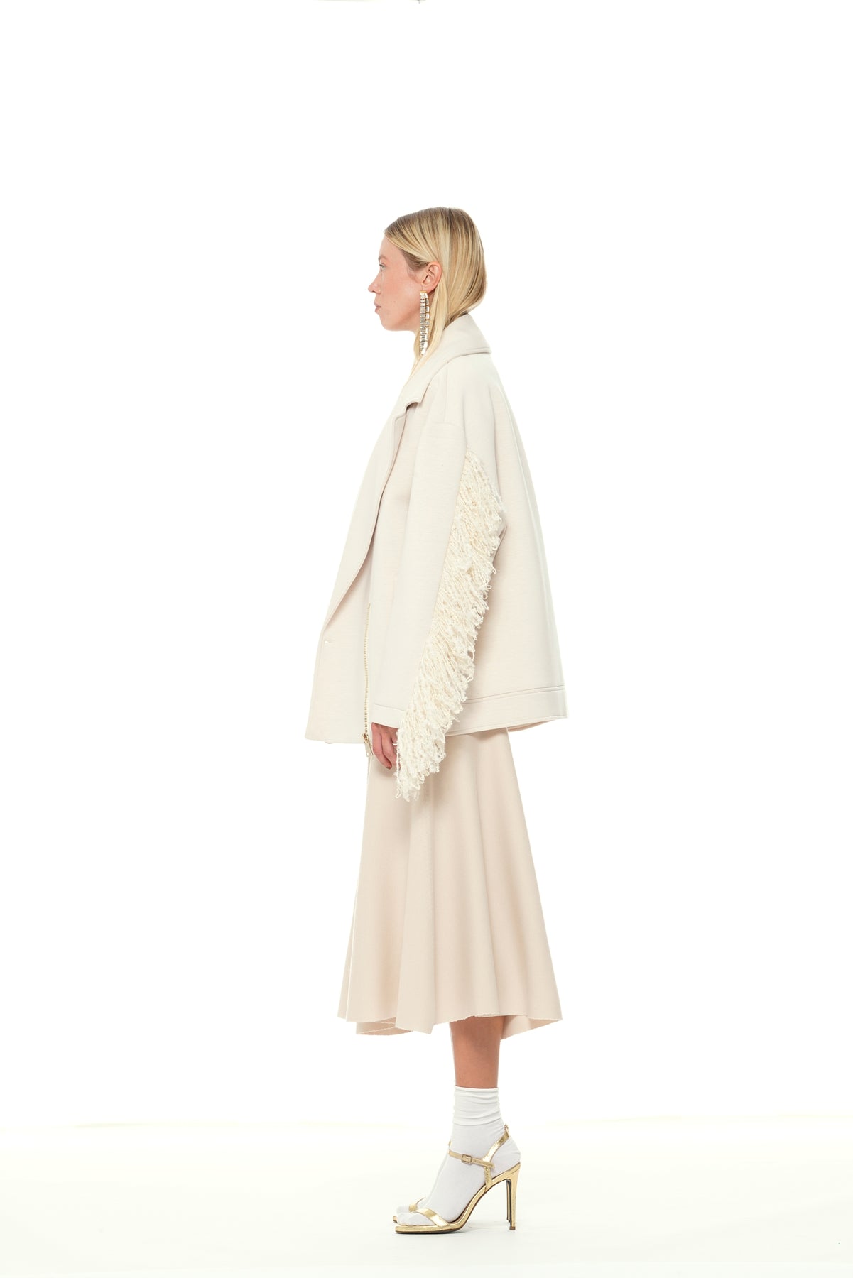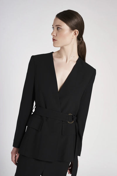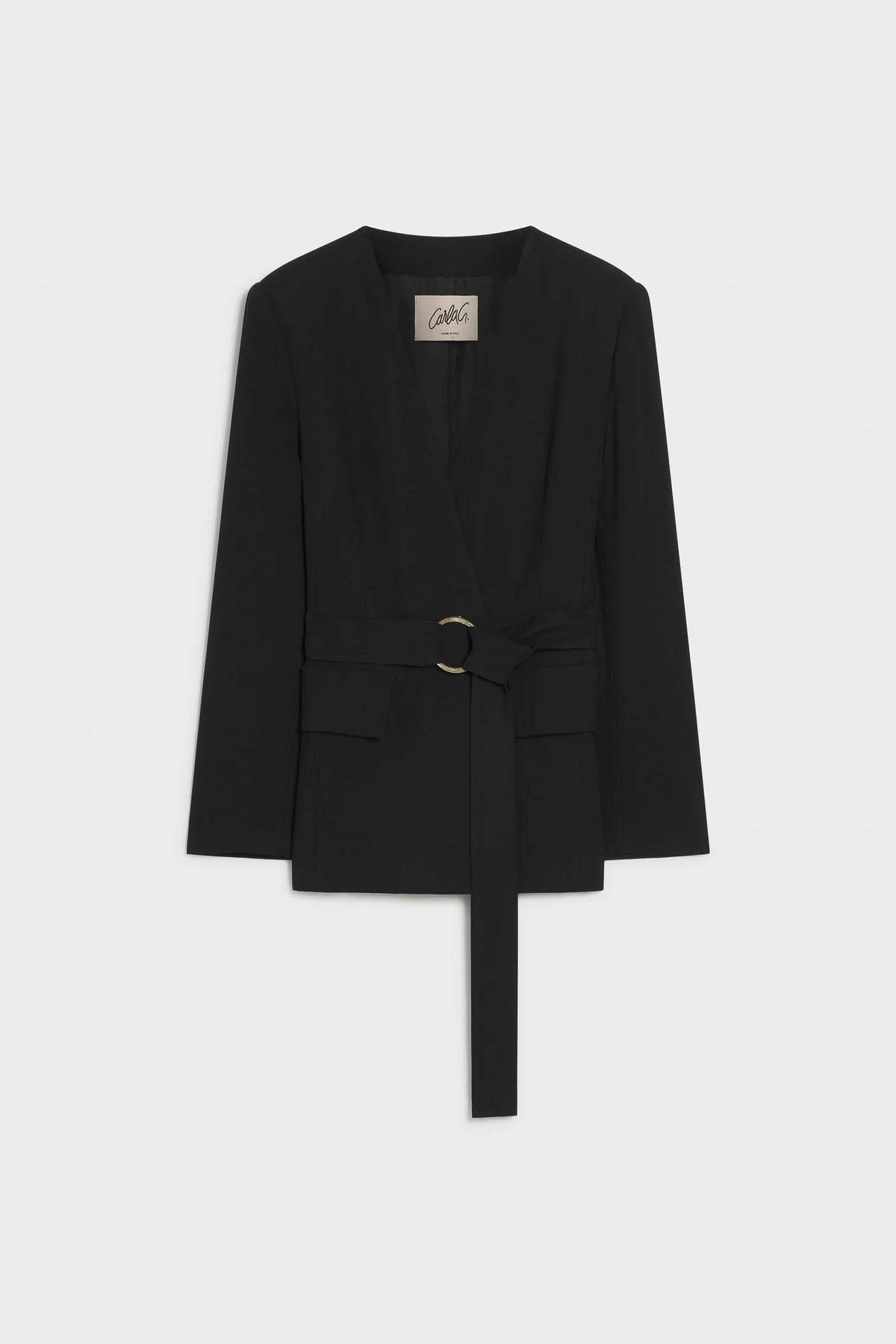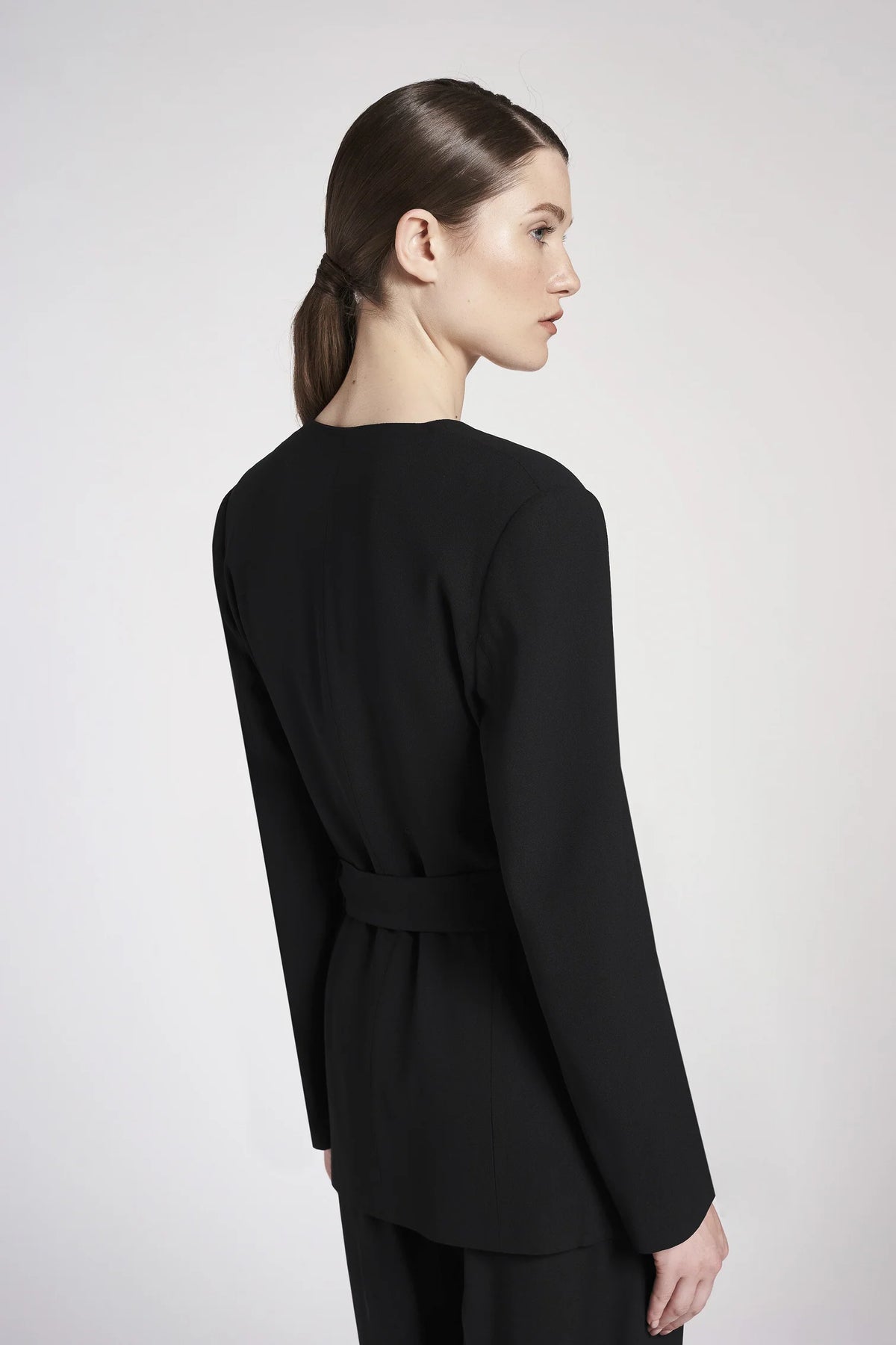 Giacca foderata senza collo in crepe di viscosa. Allacciaura doppio petto chiusa da bottoni automatici, passanti in vita e cintura a nastro con anella in metallo. Patte applicate effetto tasca e spacchetti laterali. Lunghezza sotto ai fianchi