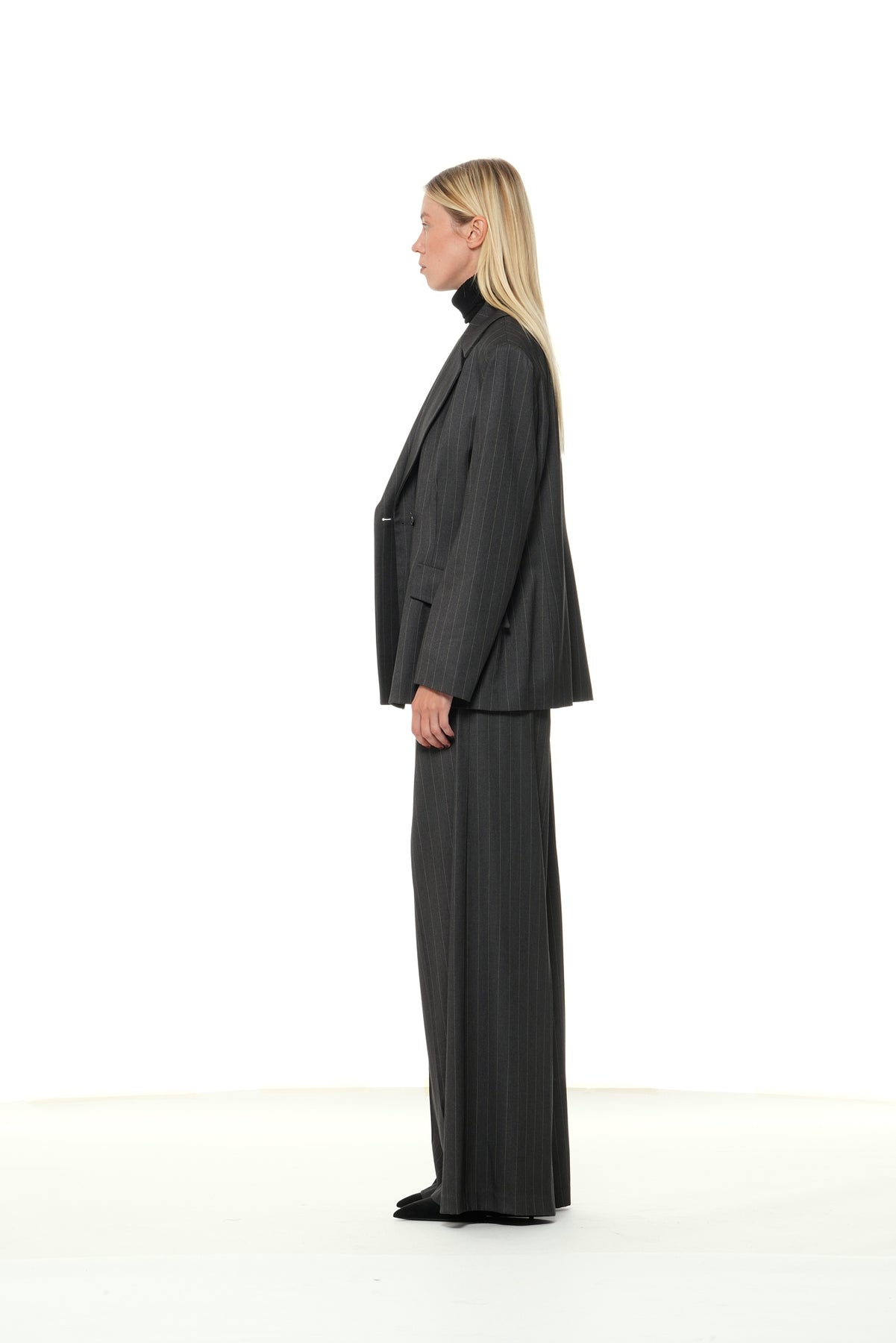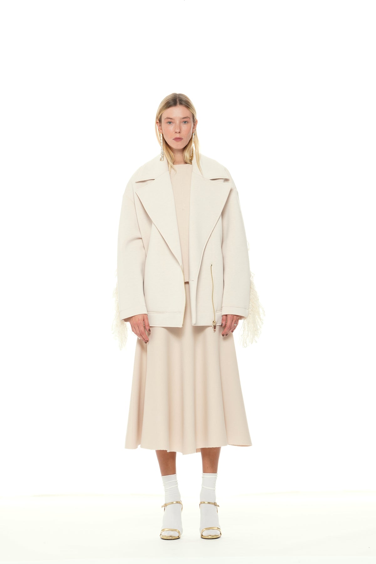 Lo spirito “officer” di Patrizia Pepe si reinventa nei volumi essenziali della giacca aderente con collo alla coreana in punto stoffa stretch. Strutturata e dal design scultoreo, avvolge la silhouette con grinta. Pensata in total look con la mini gonna coordinata, crea un look statement dove maschile e femminile si fondono in un gioco di contrasti glamour.