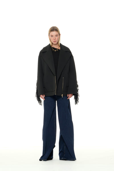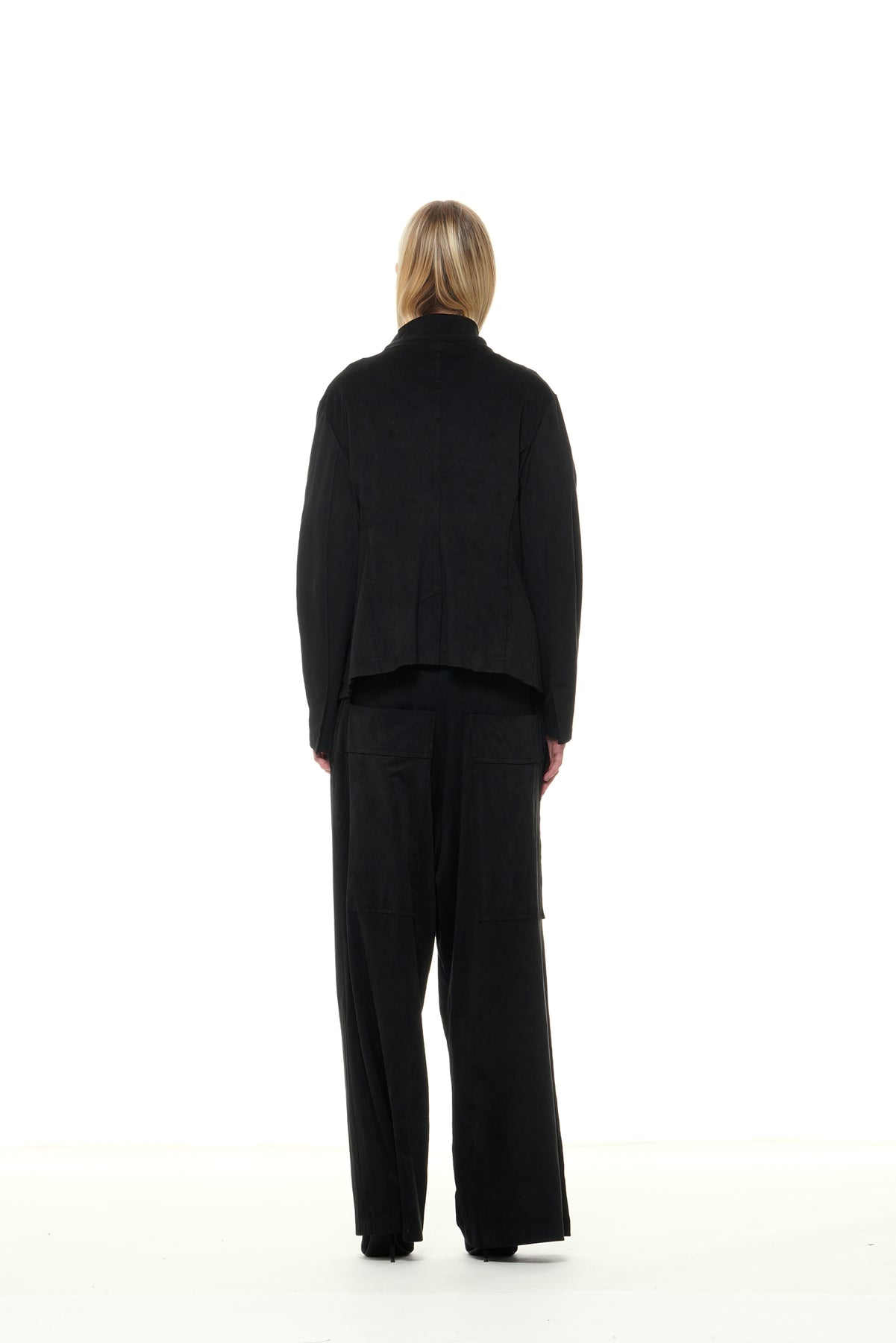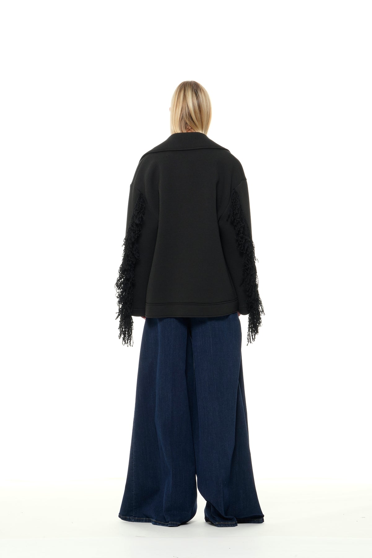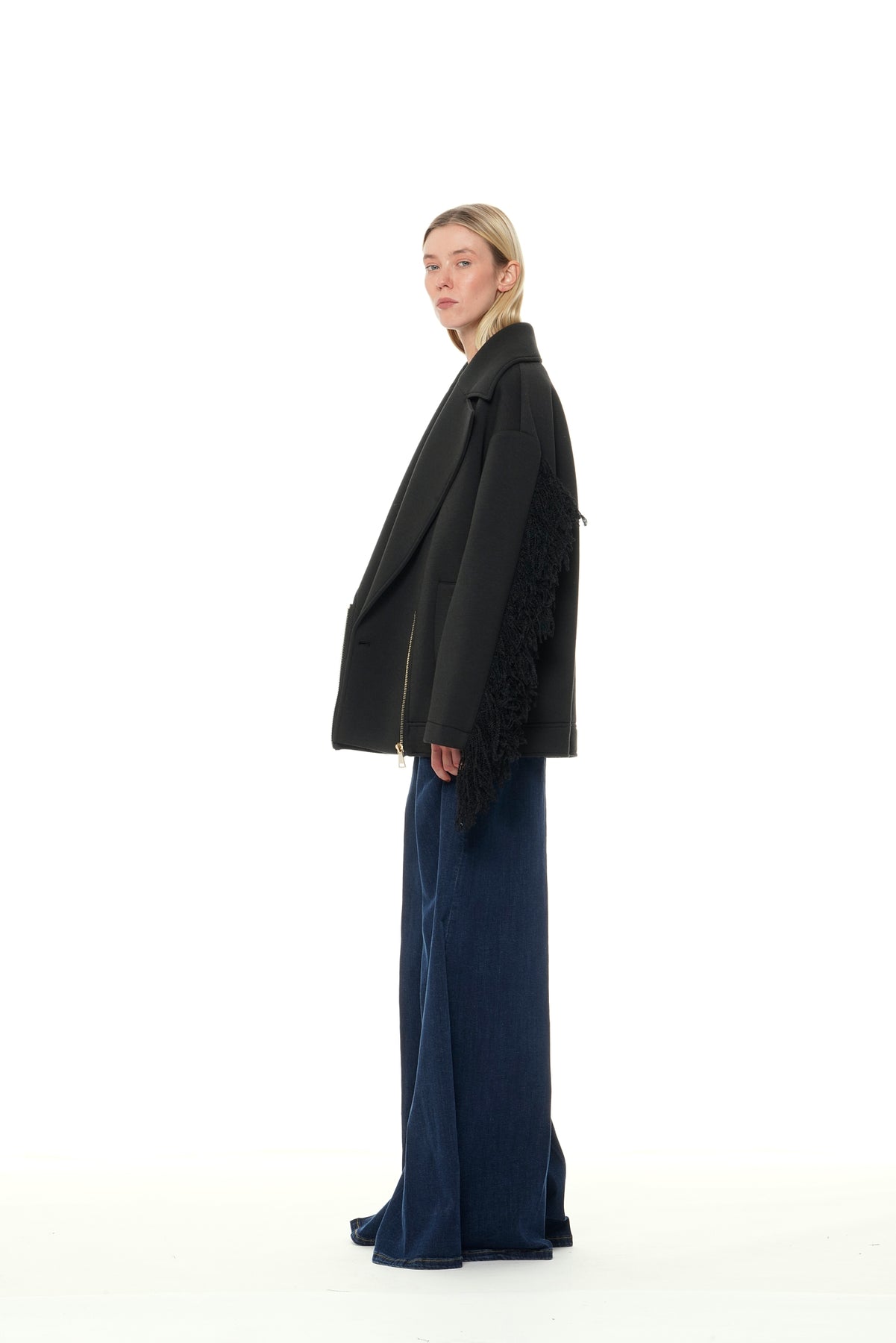 Giacca oversize in tessuto strutturato nero, ispirata allo stile utility. Il design si distingue per le quattro maxi tasche applicate sul davanti e le cuciture a vista che ne evidenziano la costruzione.