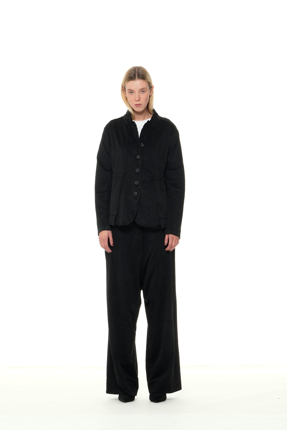 Giacca sfoderata in jersey elasticizzato. Collo alla coreana e allacciatura asimmetrica chiusa da bottoni in madreperla. Patte applicate effetto tasca. Lunghezza sotto i fianchi.