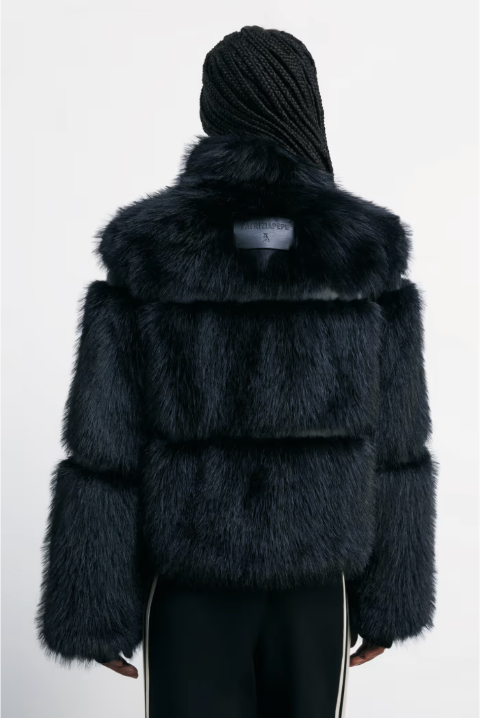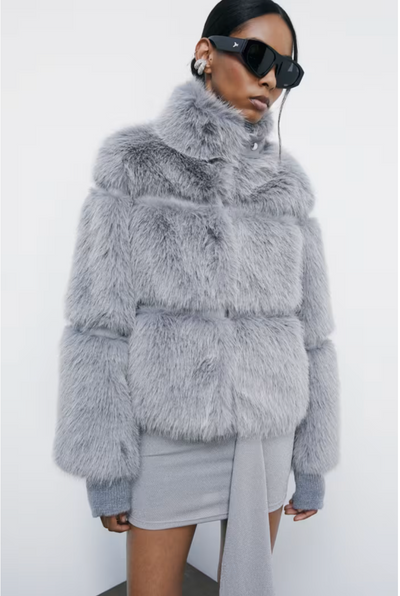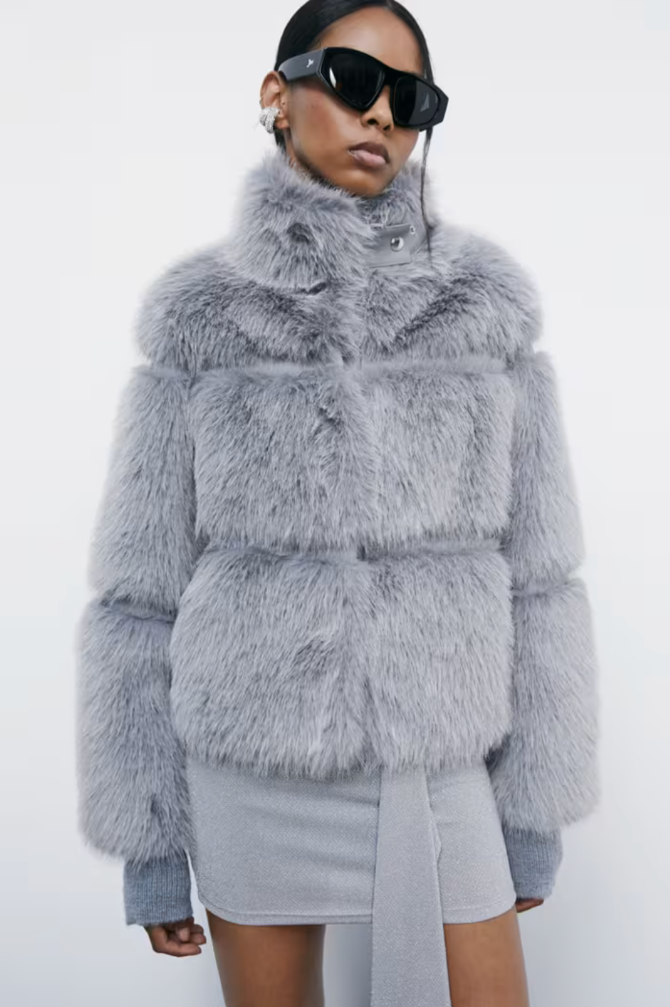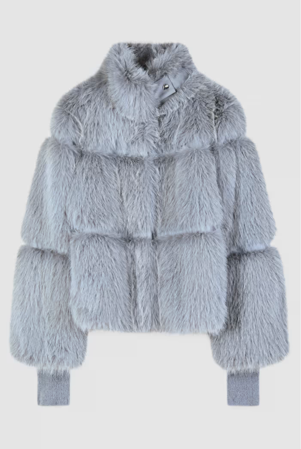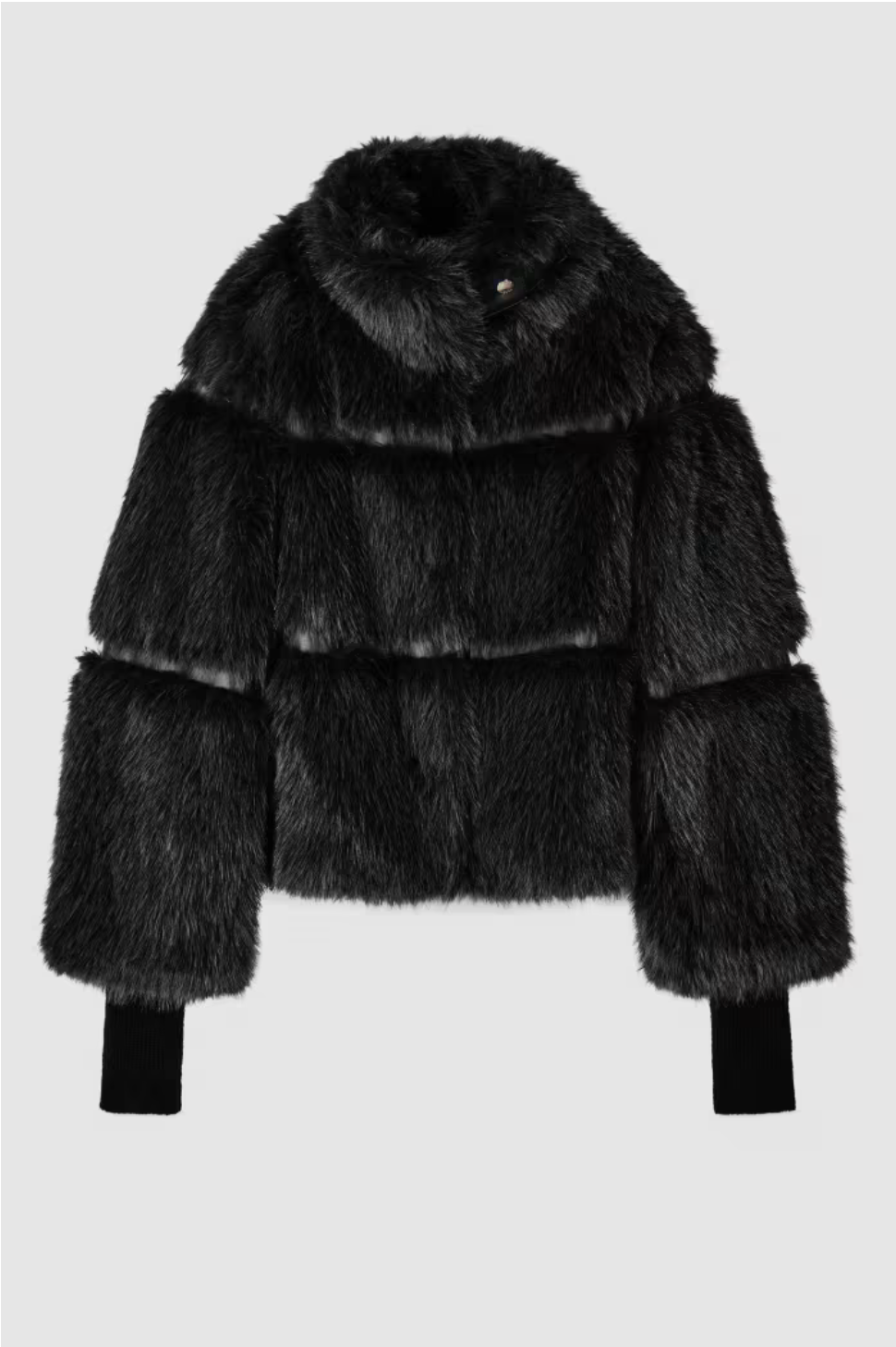 Cappotto fluffy corto con design a collo alto. I polsi in maglia assicurano calore, mentre gli inserti in tessuto spalmato definiscono le maniche e il profilo della chiusura a bottoni. Morbido e voluminoso, aggiunge carattere a look casual glam, perfetto con denim wide leg e stivali con tacco.