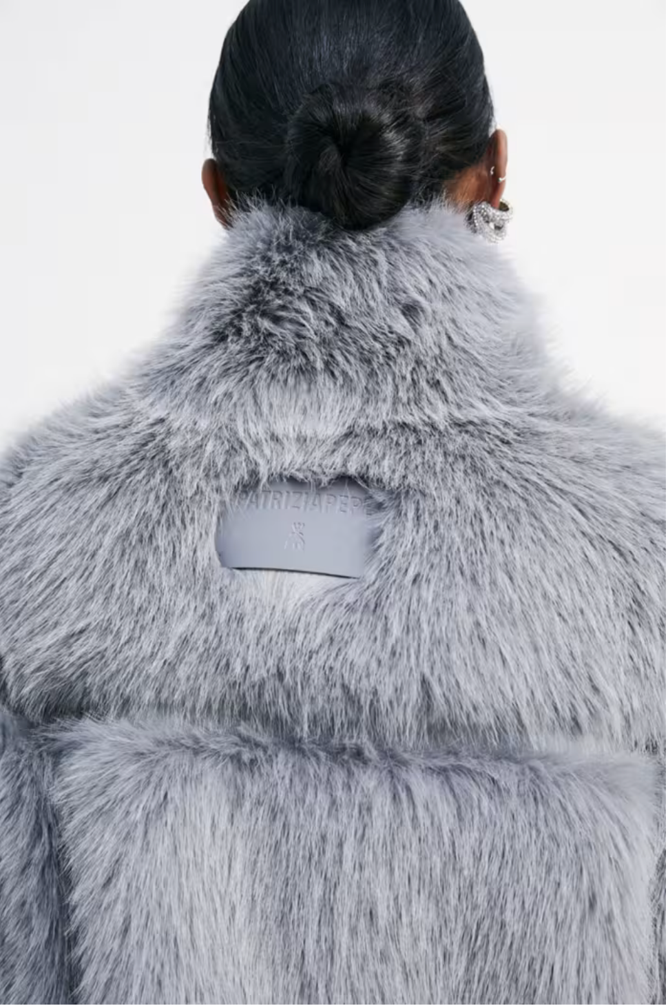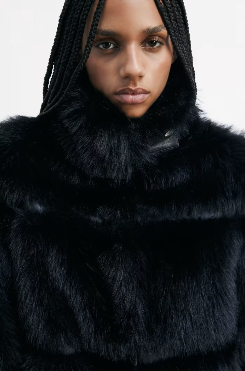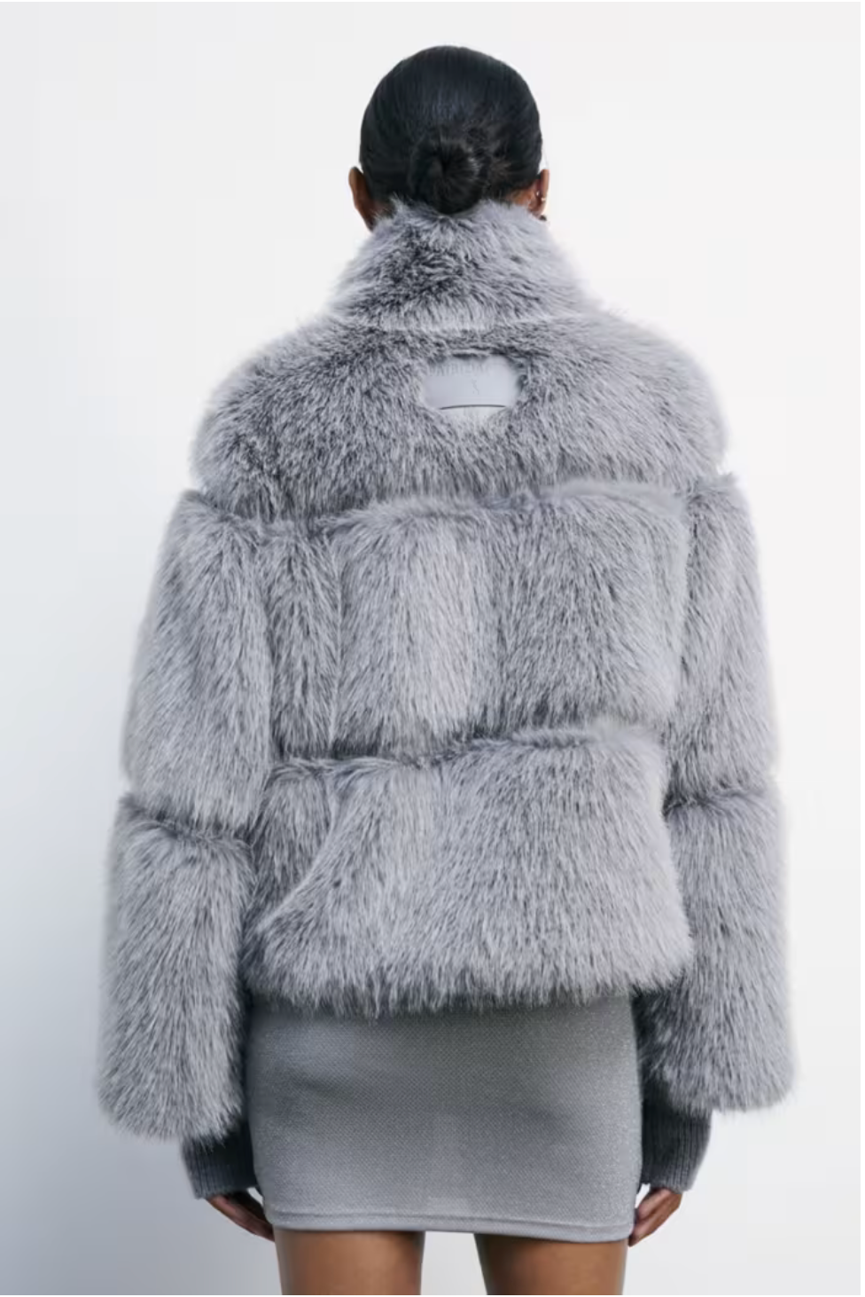 Cappotto fluffy corto con design a collo alto. I polsi in maglia assicurano calore, mentre gli inserti in tessuto spalmato definiscono le maniche e il profilo della chiusura a bottoni. Morbido e voluminoso, aggiunge carattere a look casual glam, perfetto con denim wide leg e stivali con tacco.