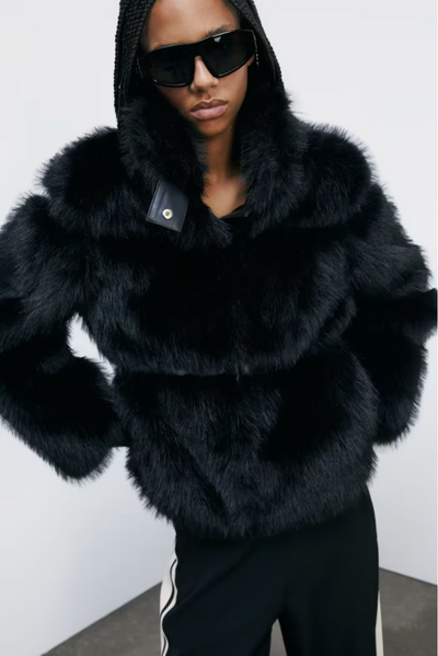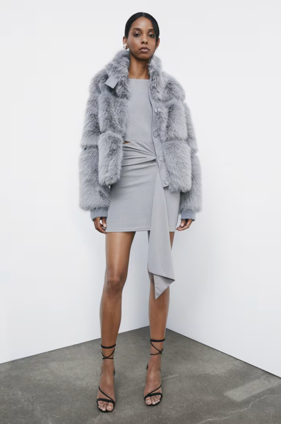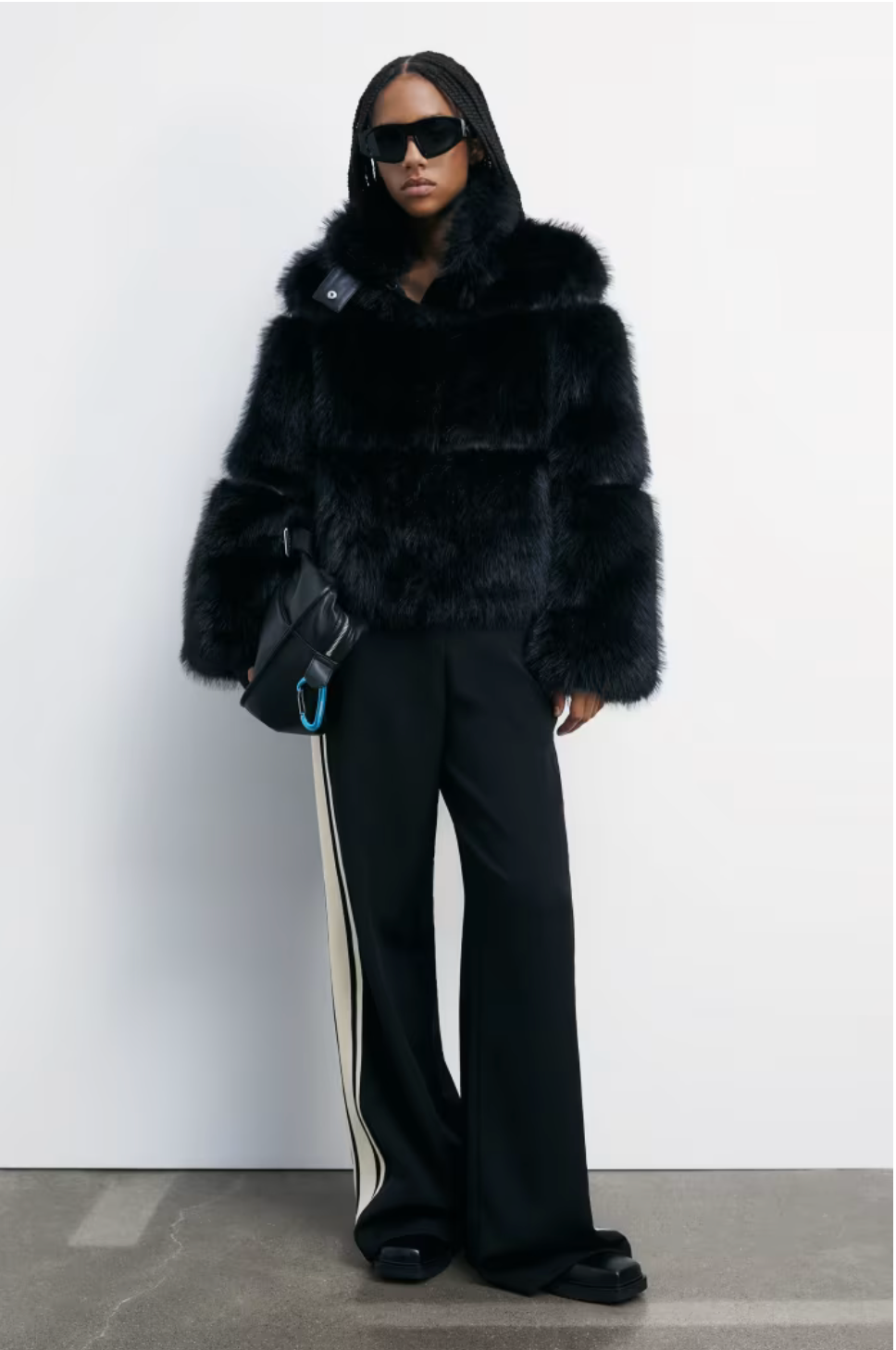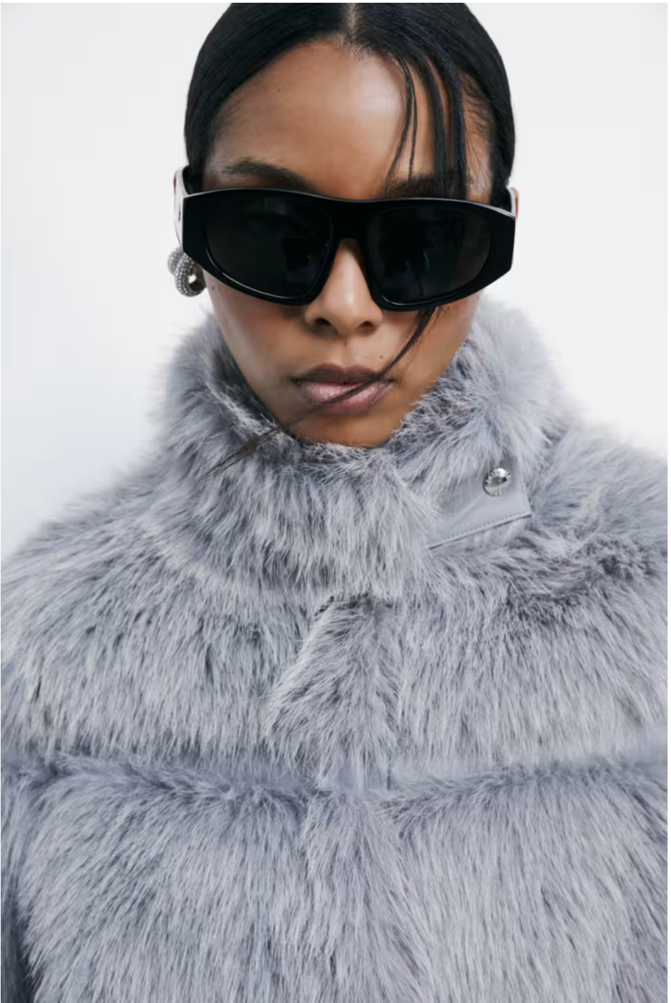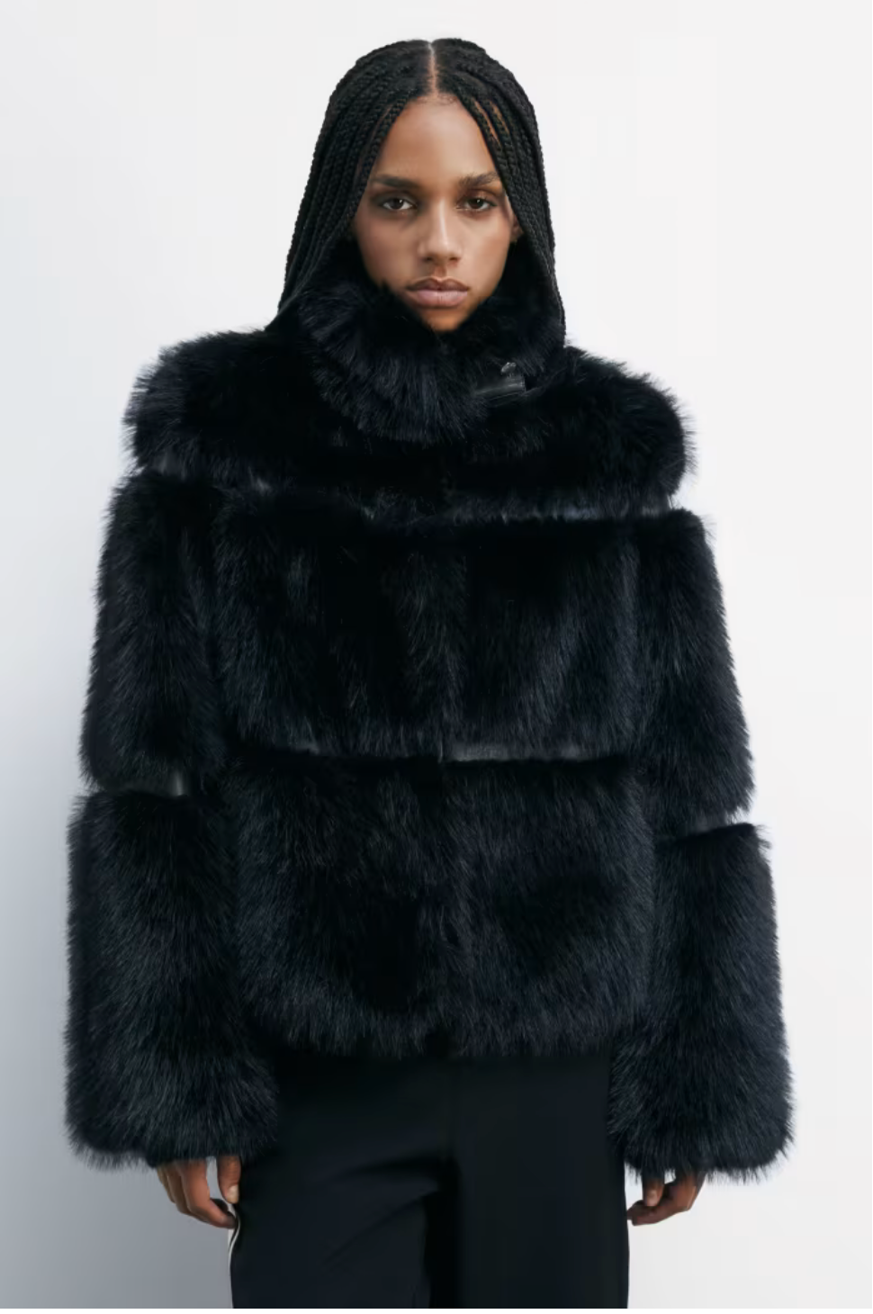 Cappotto fluffy corto con design a collo alto. I polsi in maglia assicurano calore, mentre gli inserti in tessuto spalmato definiscono le maniche e il profilo della chiusura a bottoni. Morbido e voluminoso, aggiunge carattere a look casual glam, perfetto con denim wide leg e stivali con tacco.