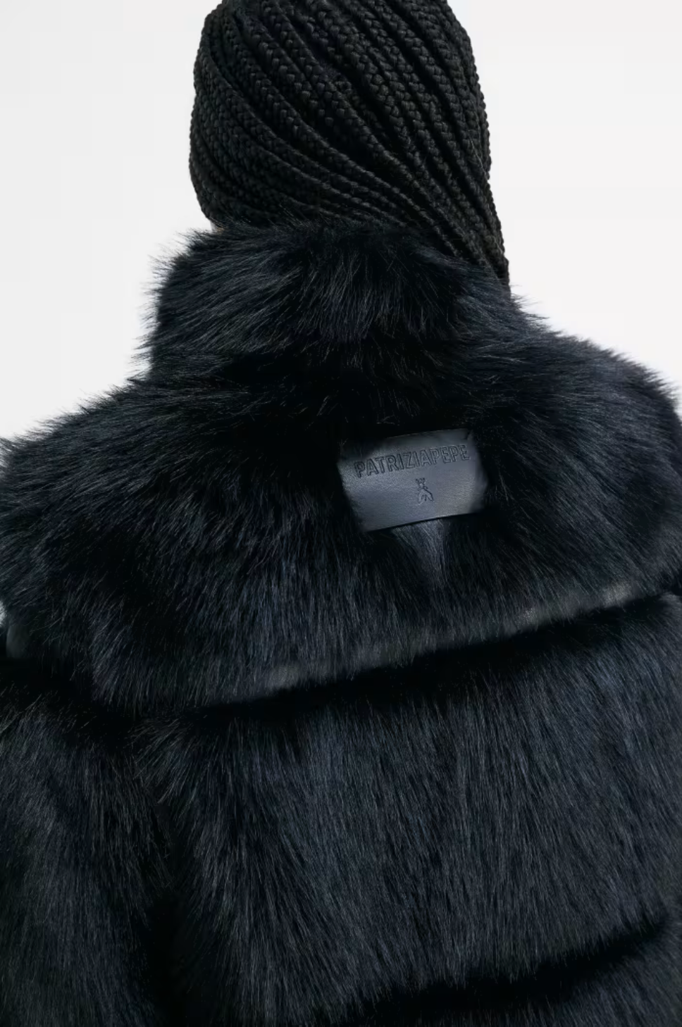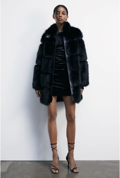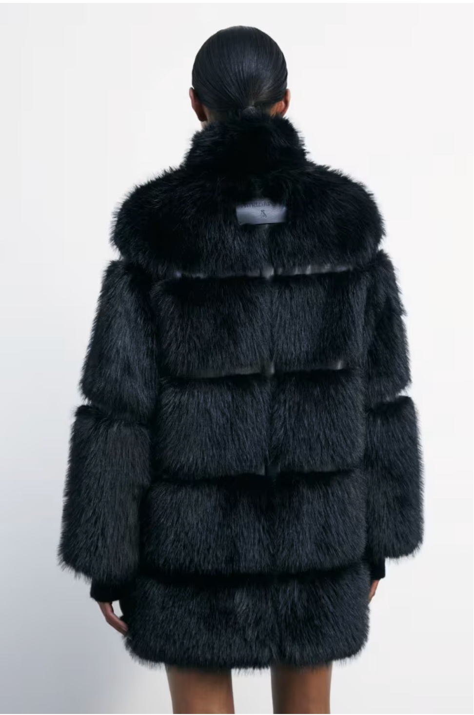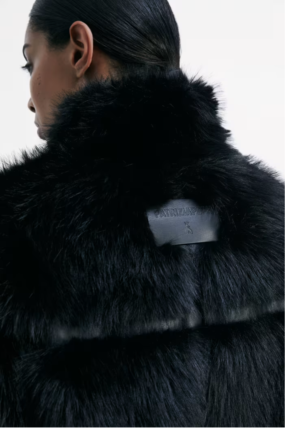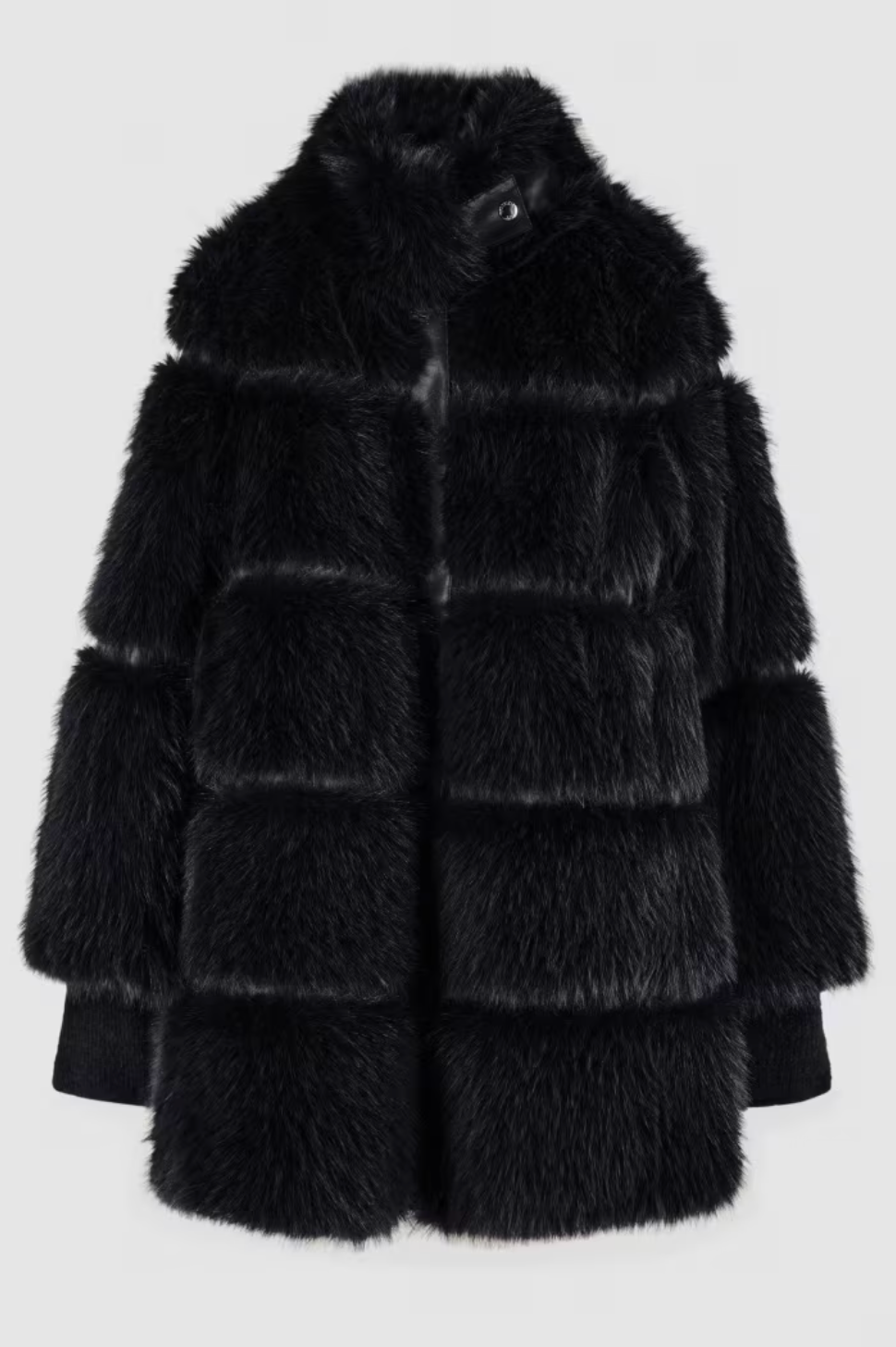 Cappotto fluffy con design midi a collo alto. I polsi in maglia assicurano calore, mentre gli inserti in tessuto spalmato definiscono le maniche e il profilo della chiusura a bottoni. Morbido e voluminoso, aggiunge carattere a look da sera, perfetto con un mini dress e gli stivali alti.