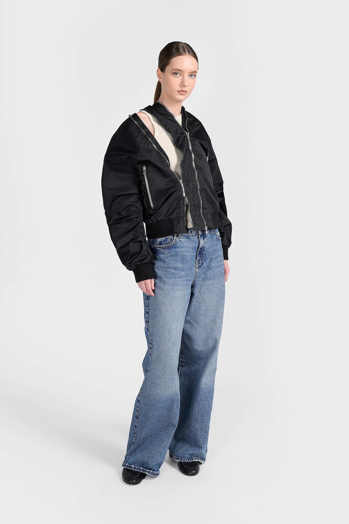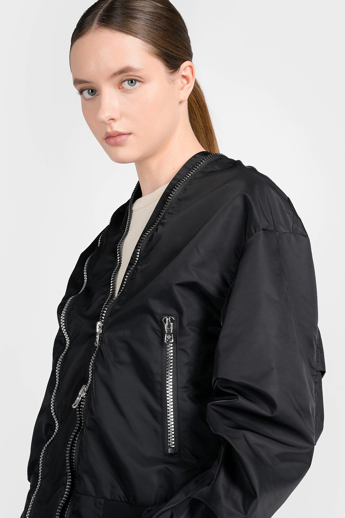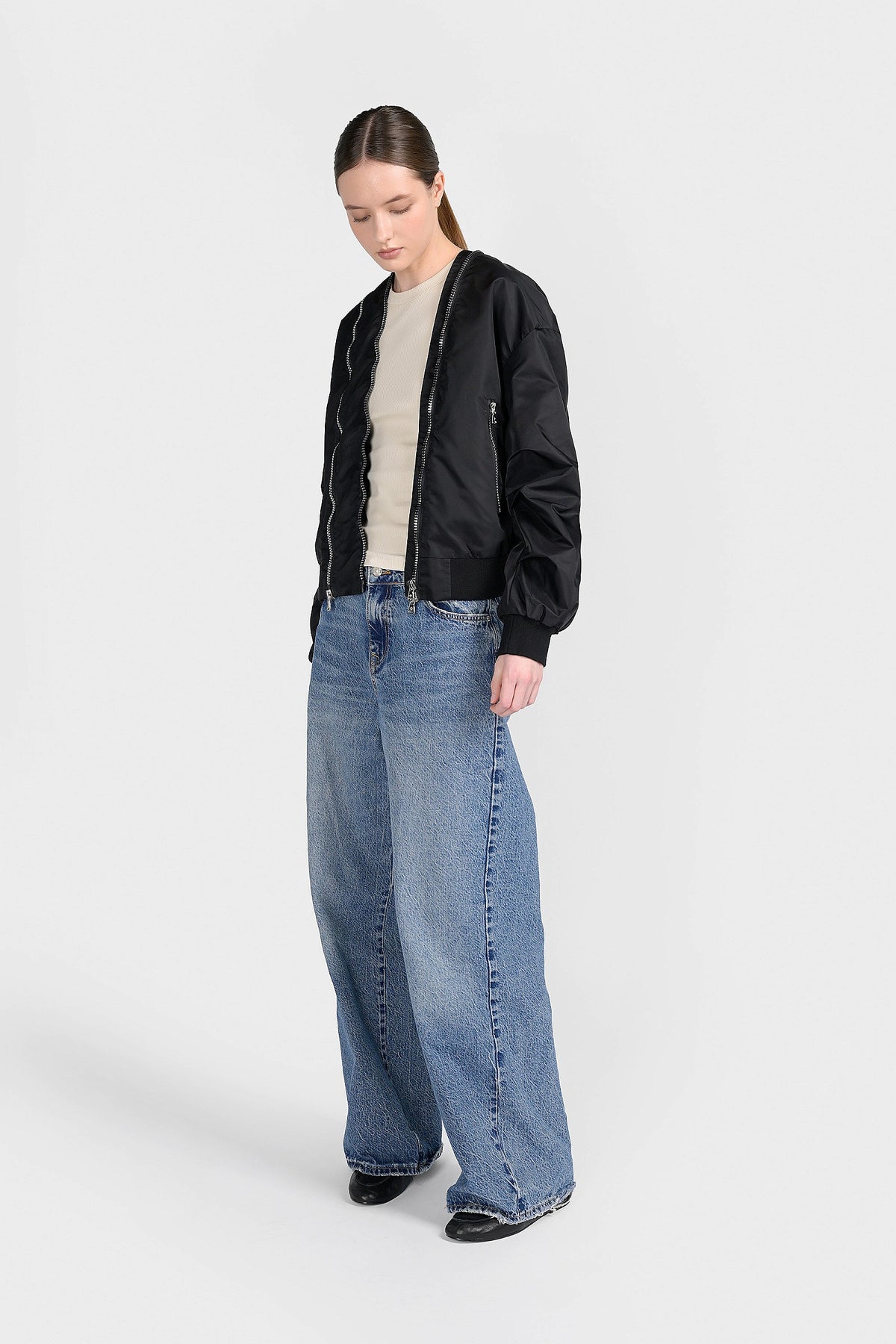 Un capo iconico reinterpretato in chiave contemporanea. Questo bomber nero si distingue per la sua silhouette pulita e leggermente over, pensata per adattarsi con naturalezza a look quotidiani e layering più ricercati.