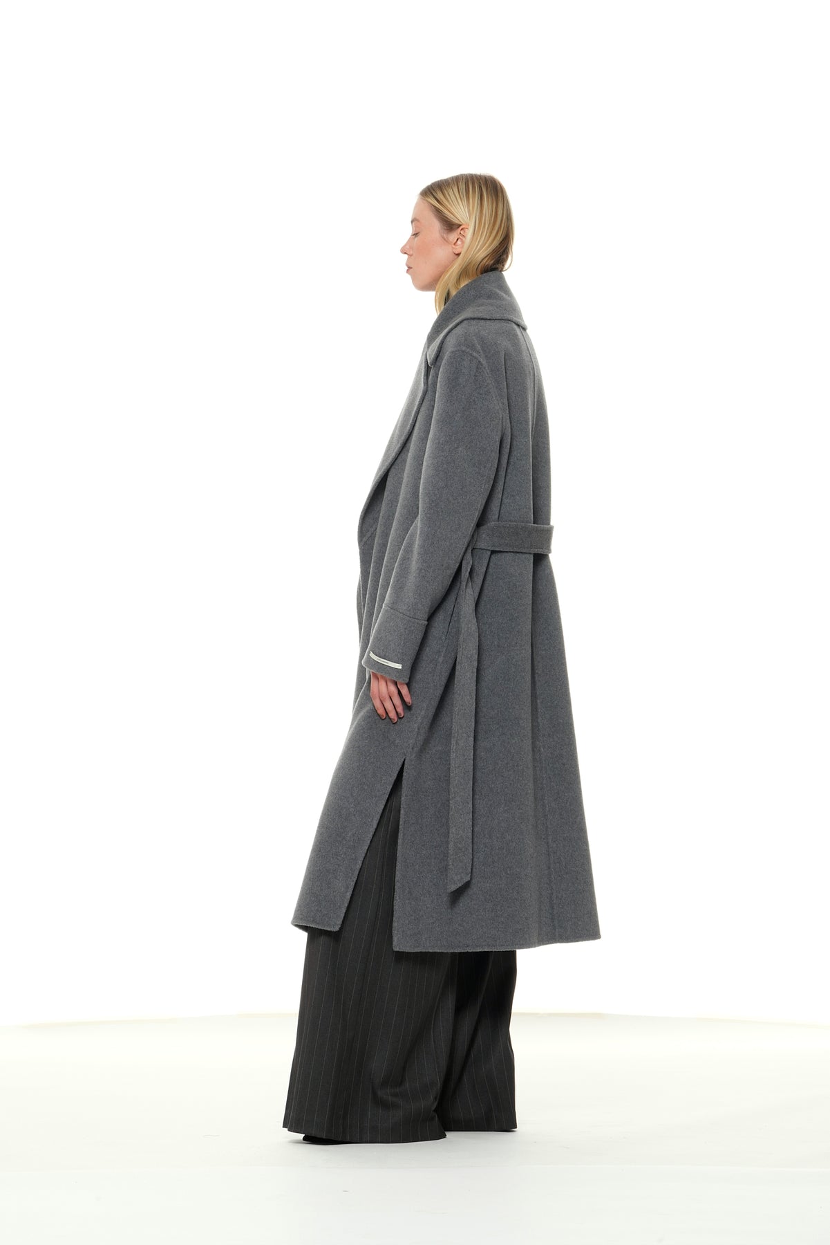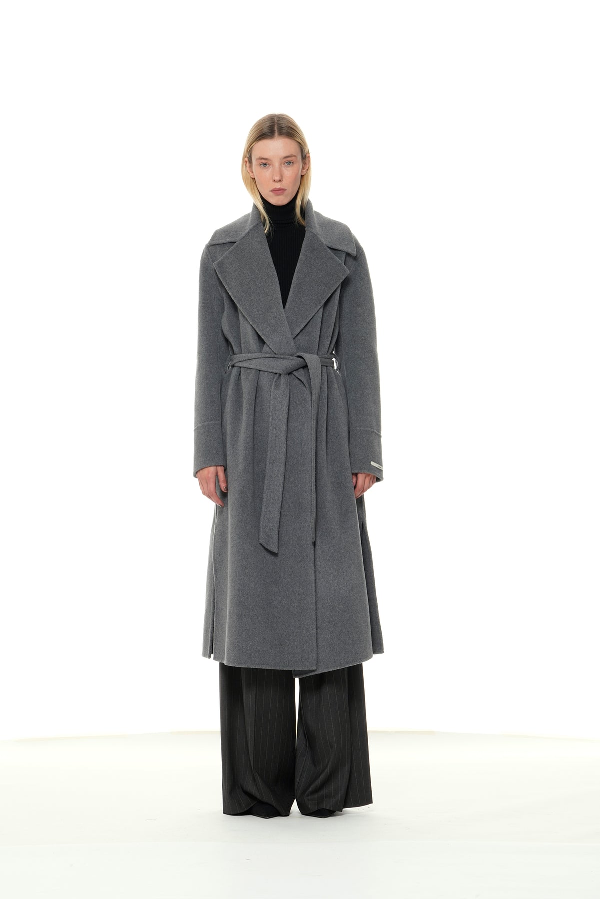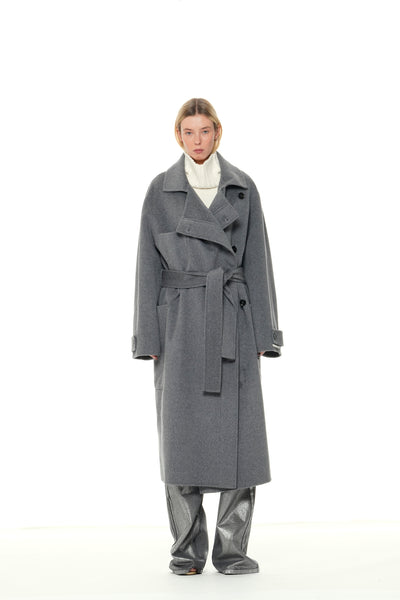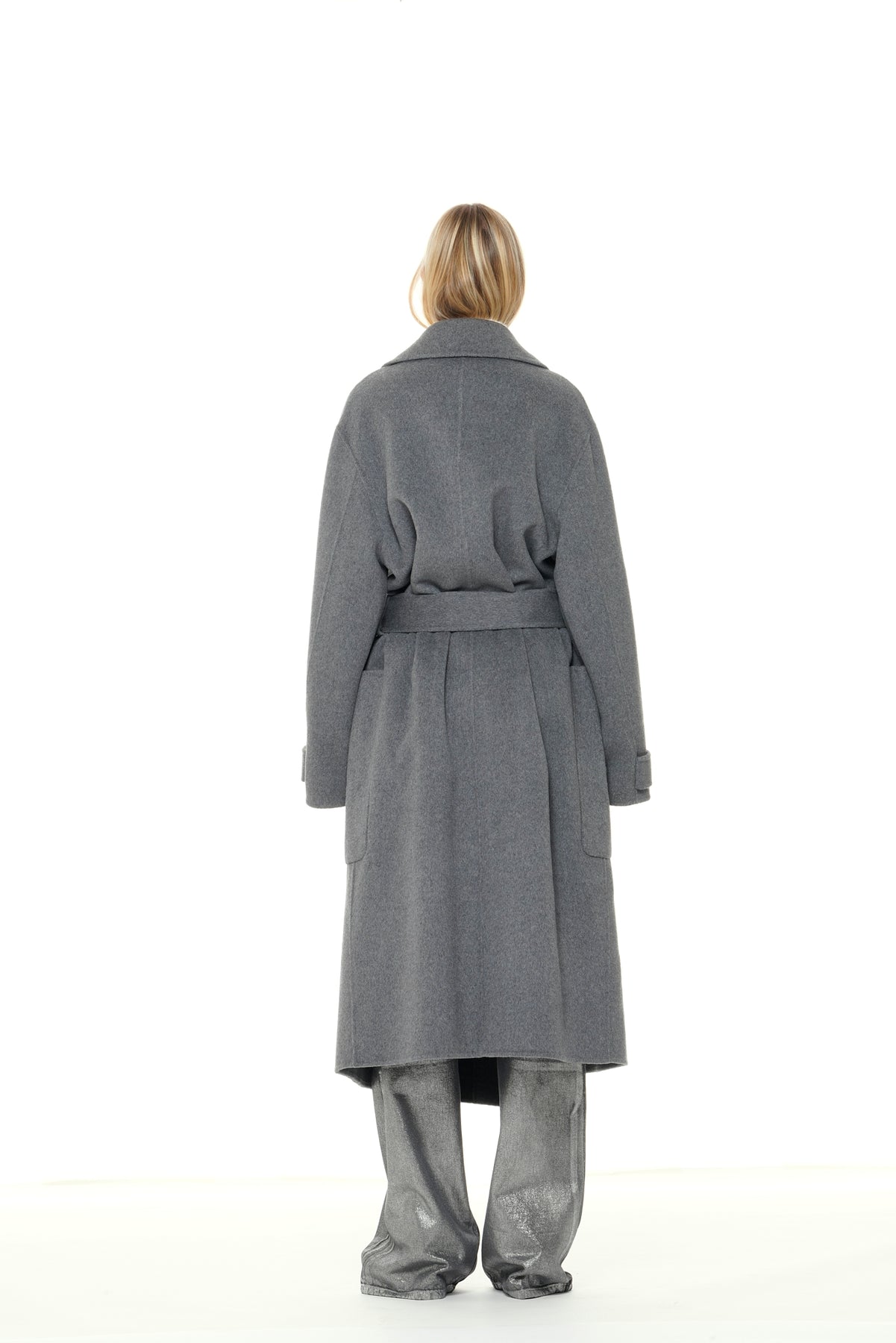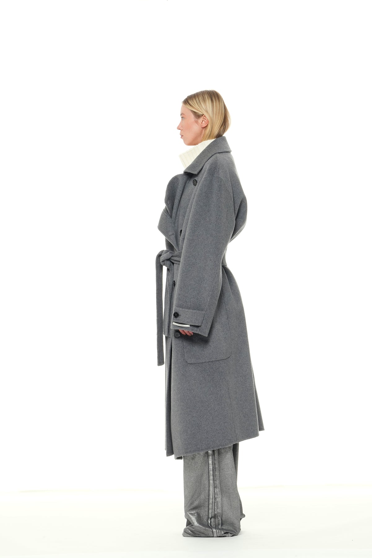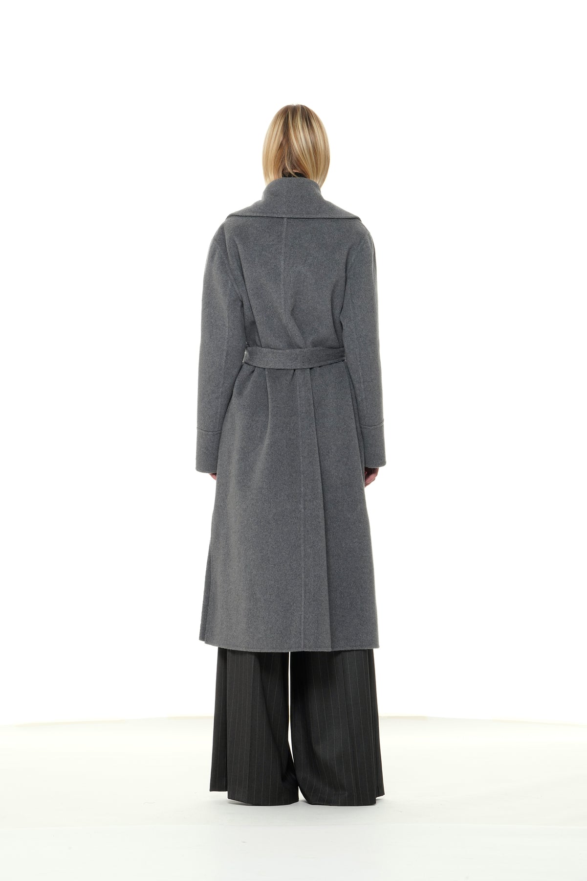 Cappotto modello lungo grigio doppiopetto, con cintura in vita come chiusura.