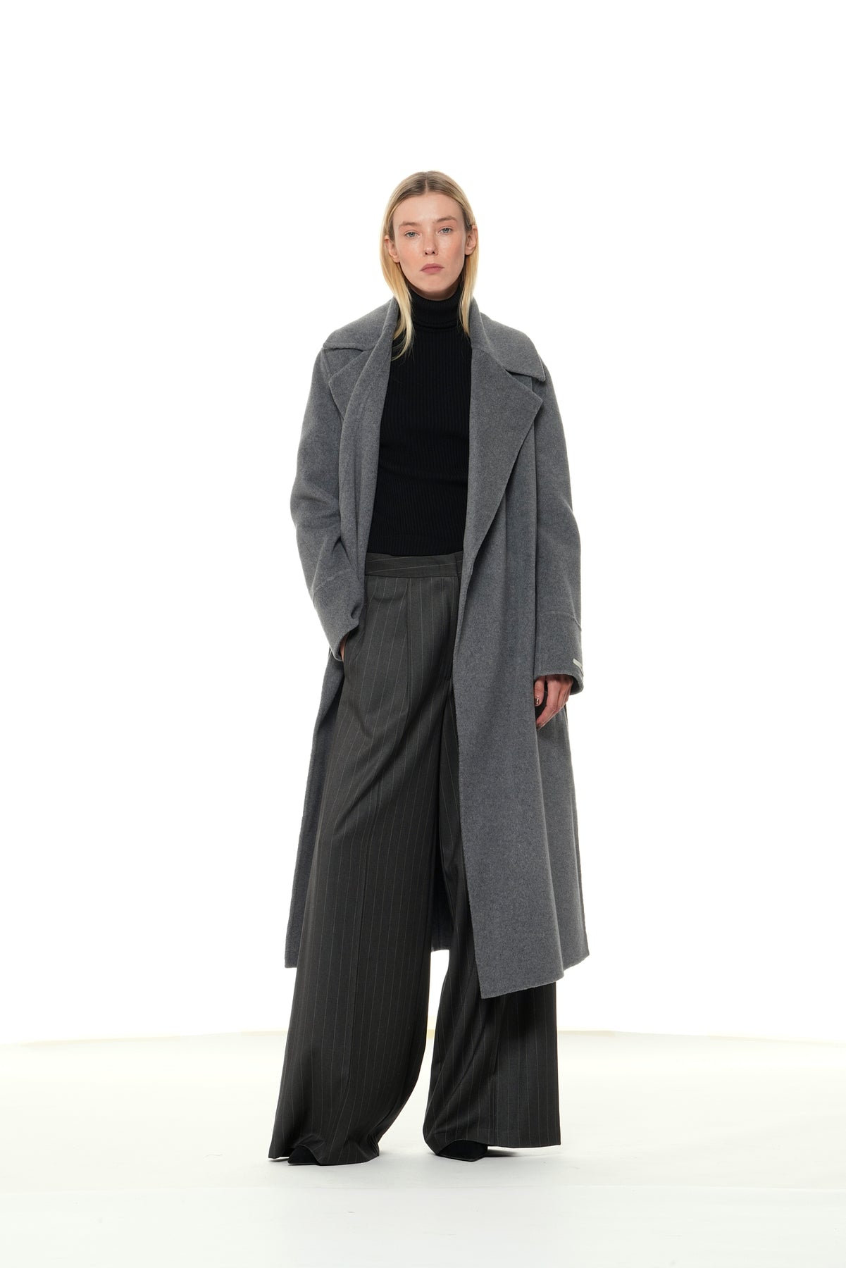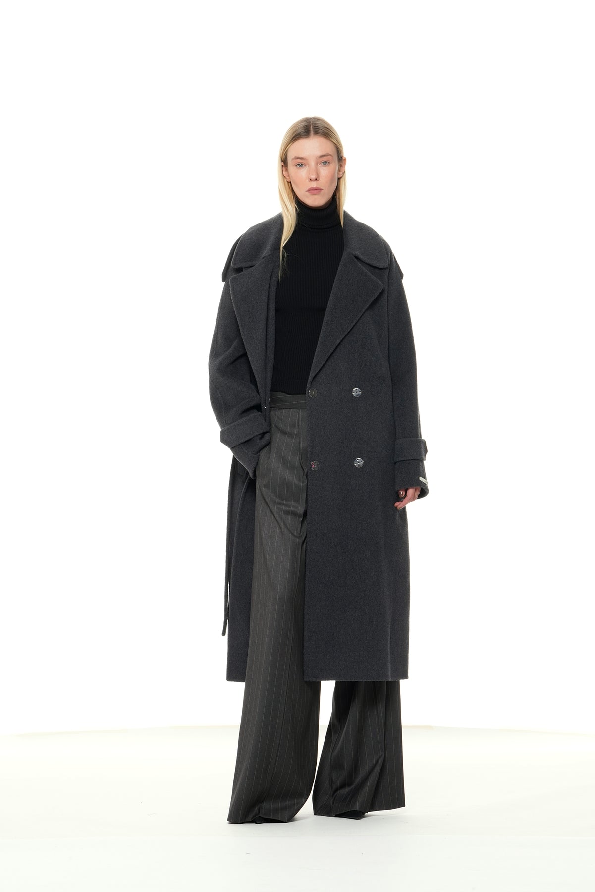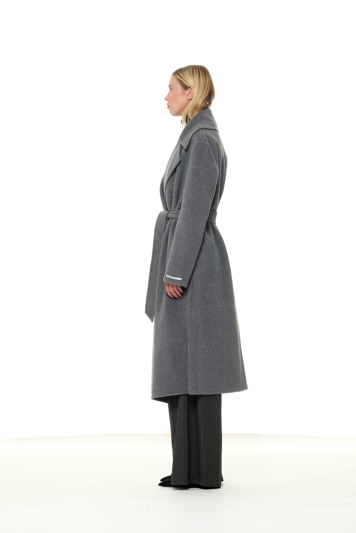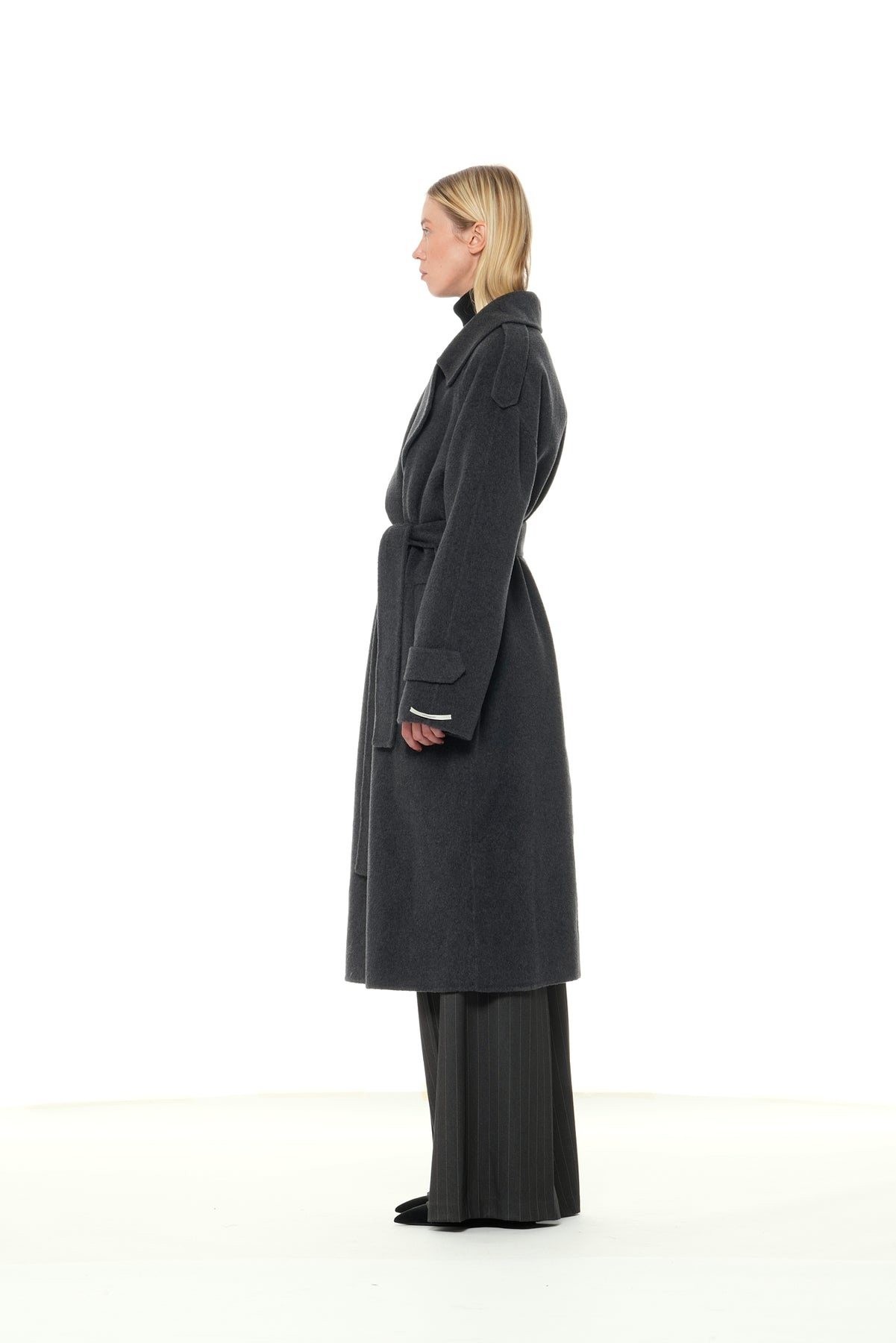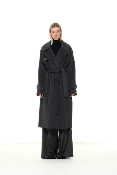 Cappotto modello lungo grigio doppiopetto, con cintura in vita come chiusura.