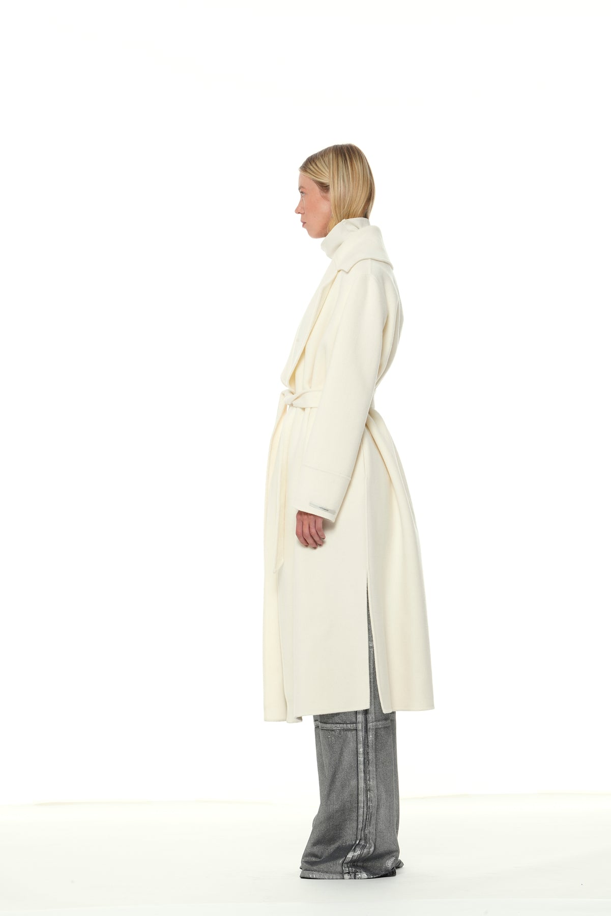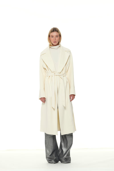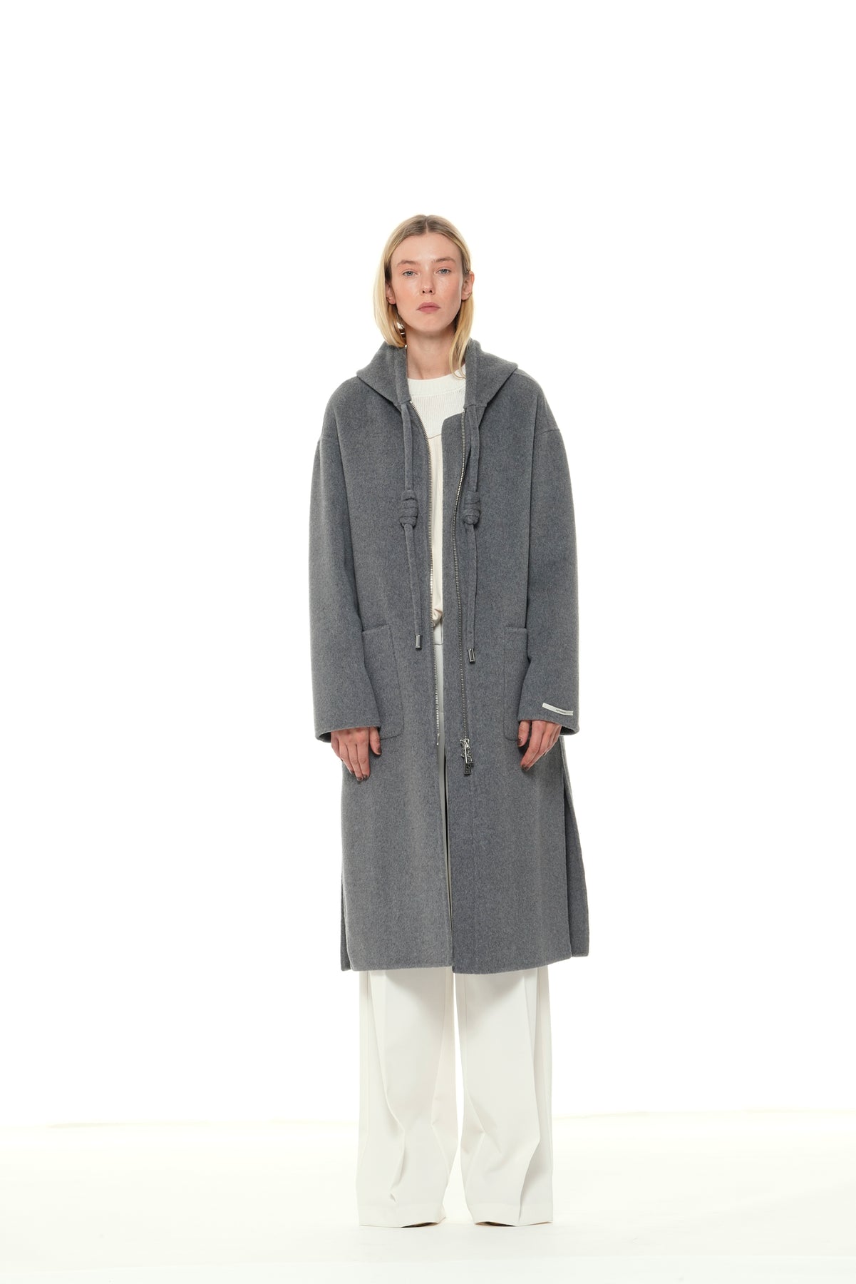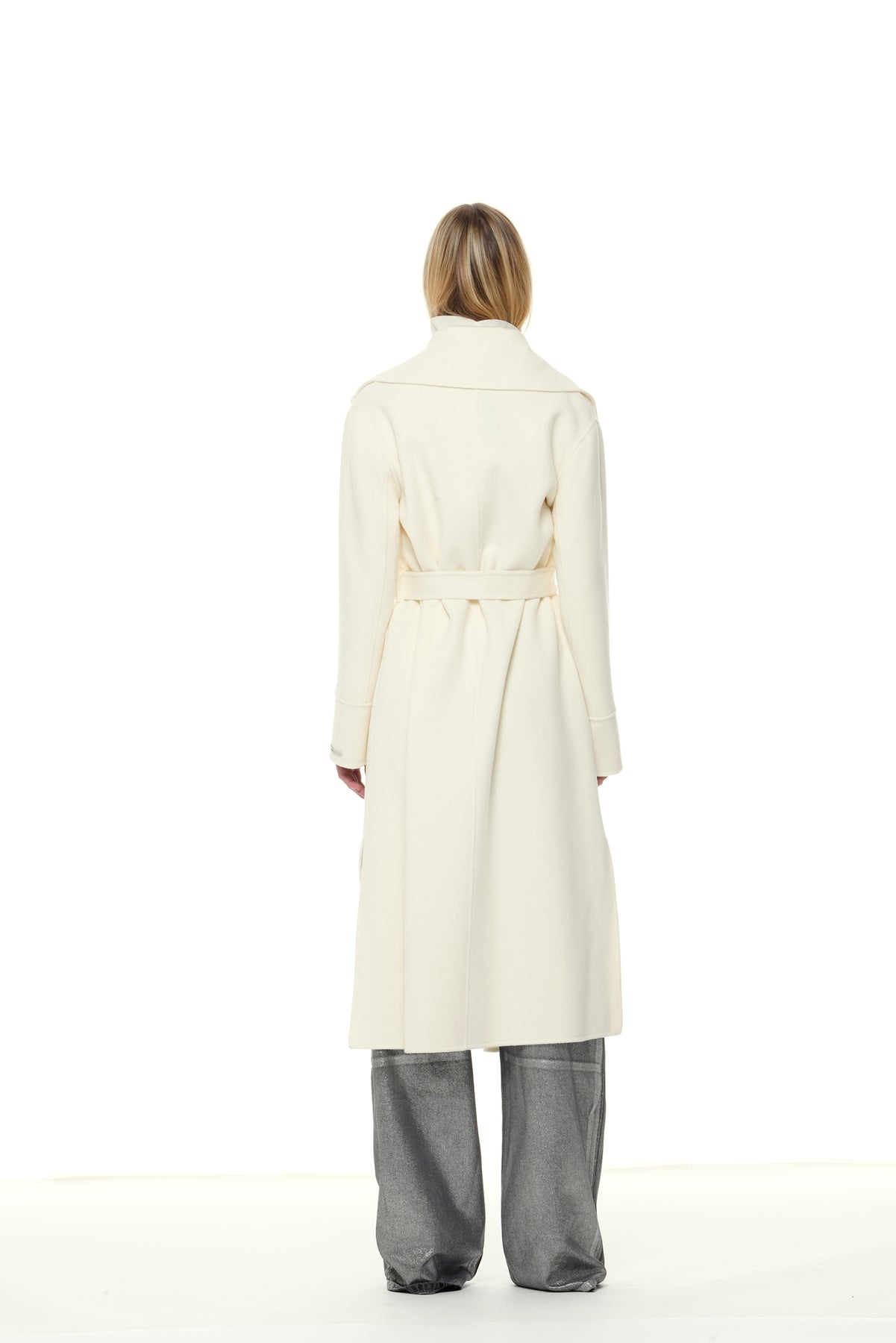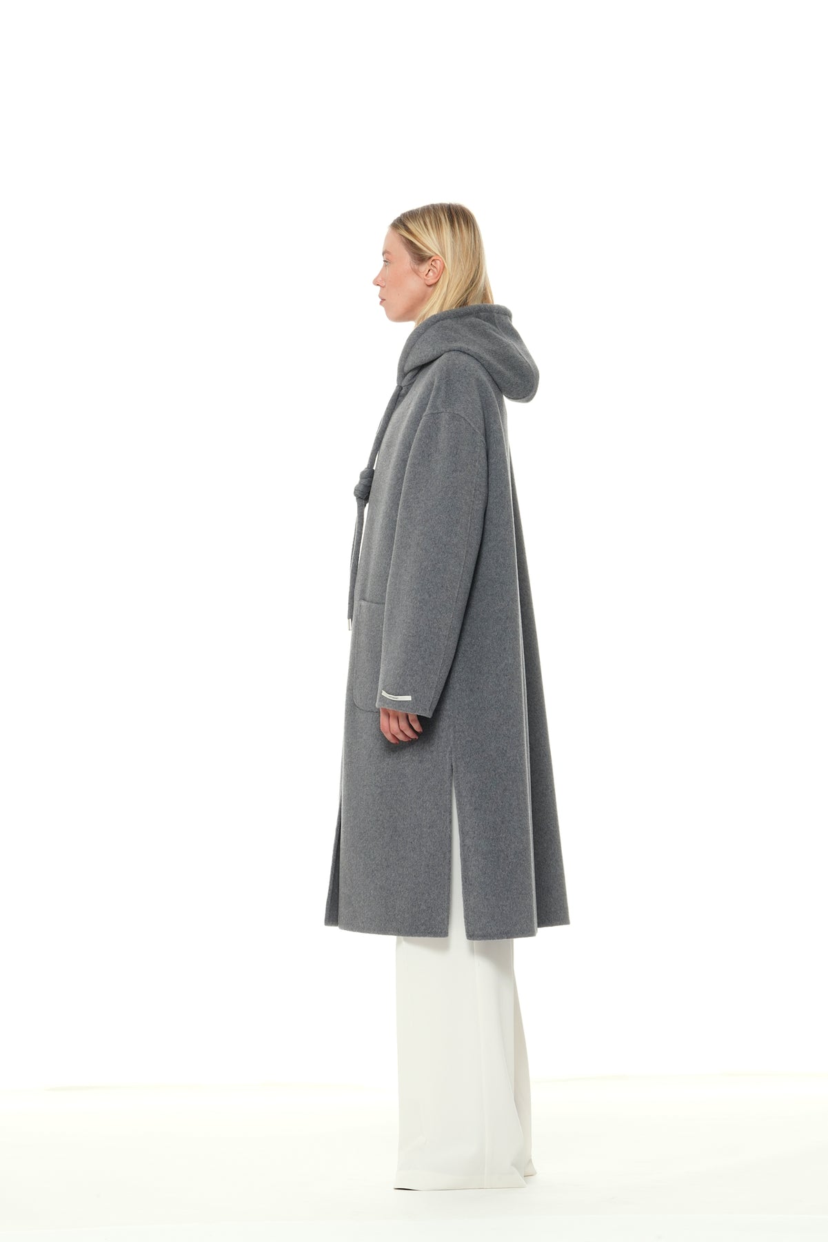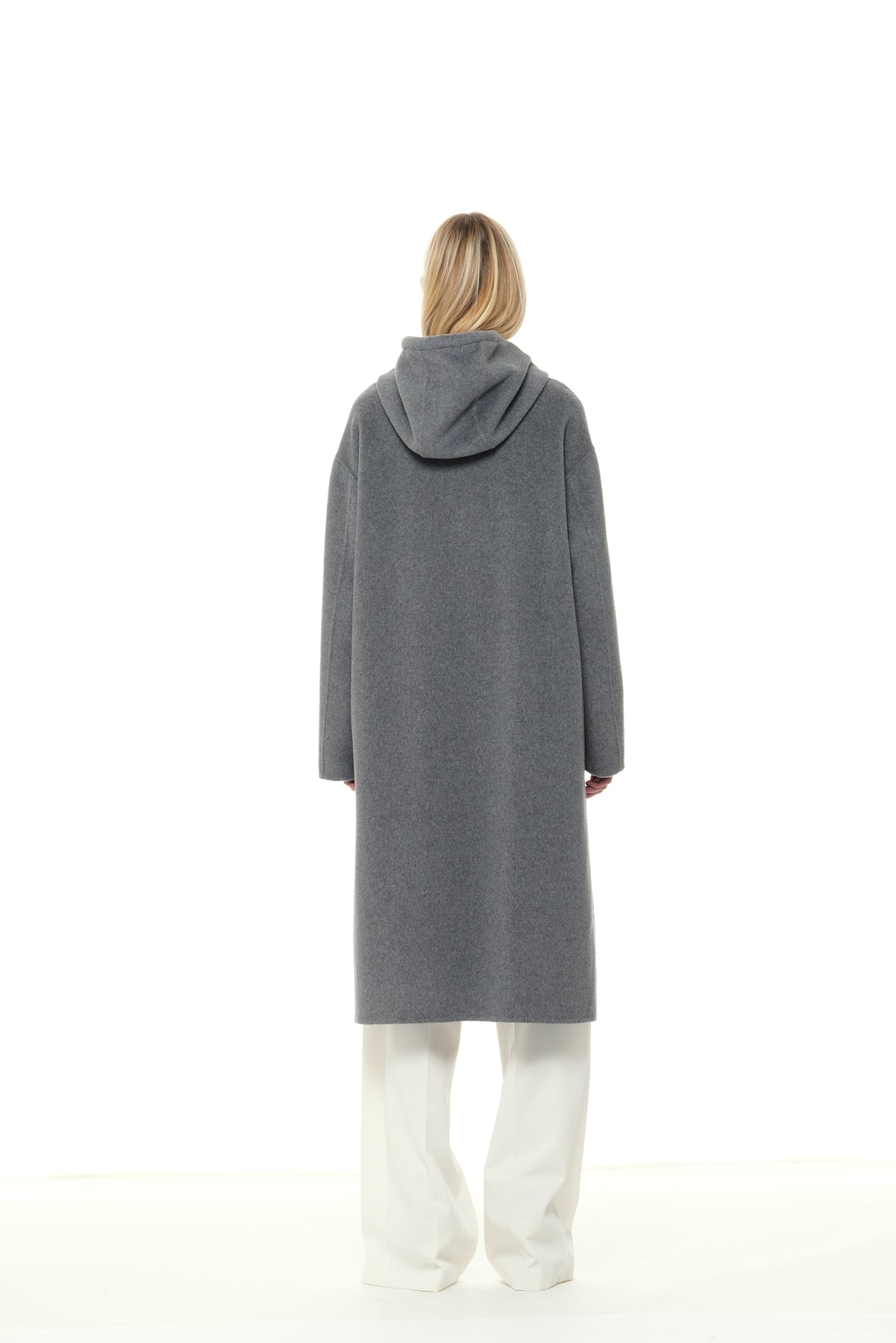 Cappotto modello lungo grigio doppiopetto, con cintura in vita come chiusura.