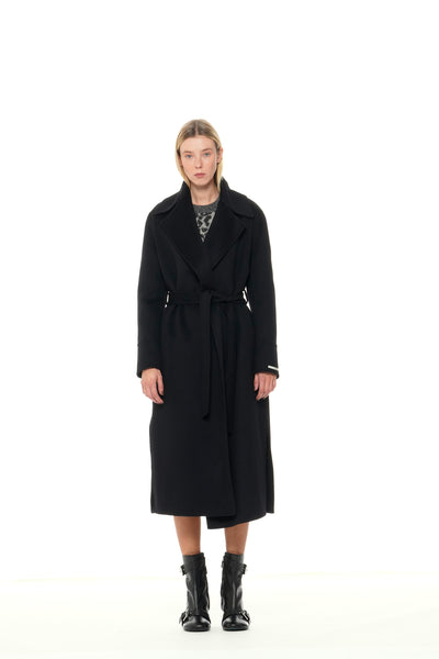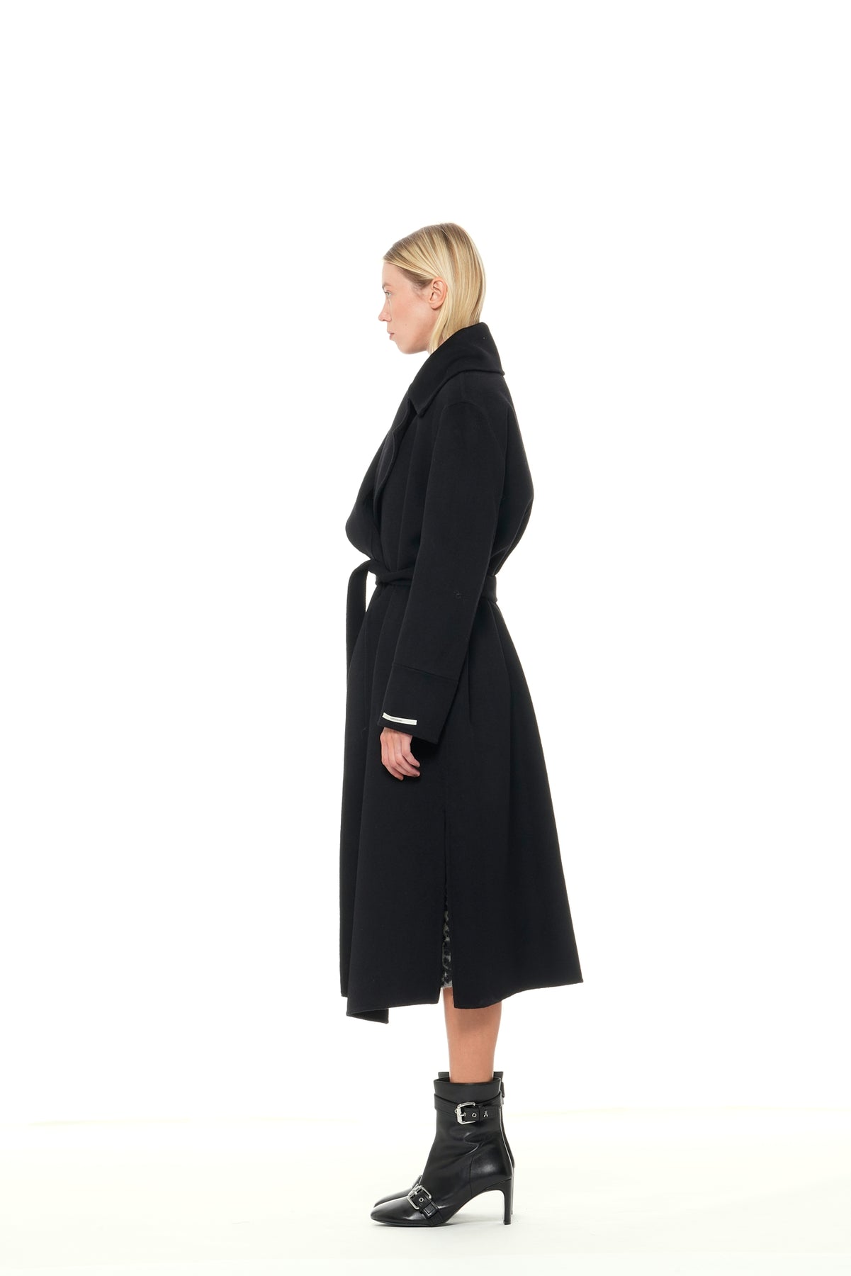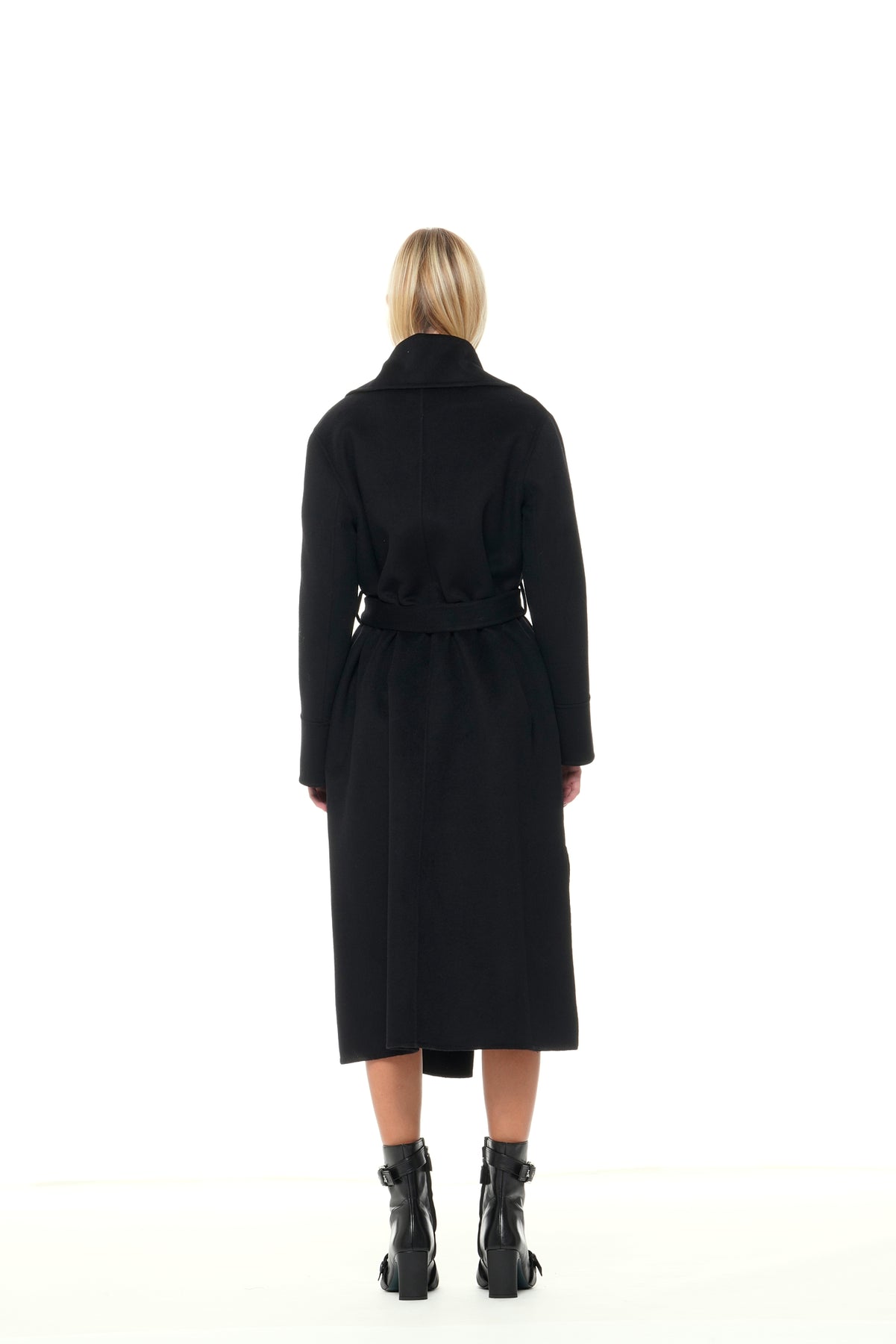 Cappotto modello lungo in lana double nero. Cintura in vita come chiusura. Vestibilità morbida
