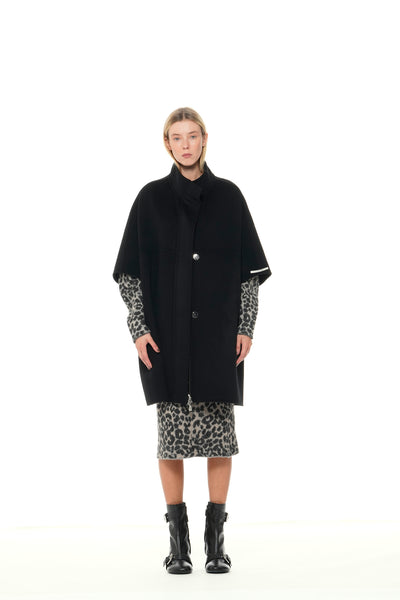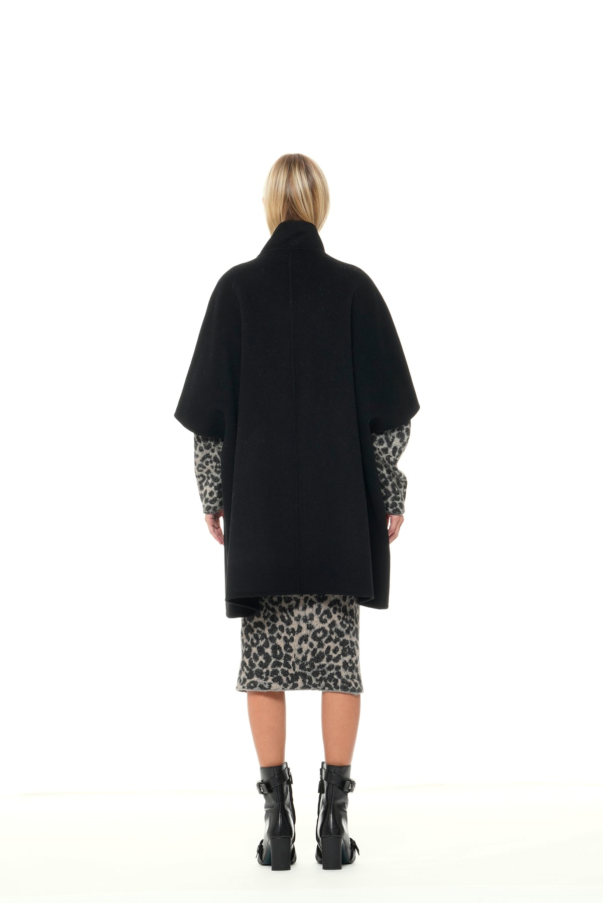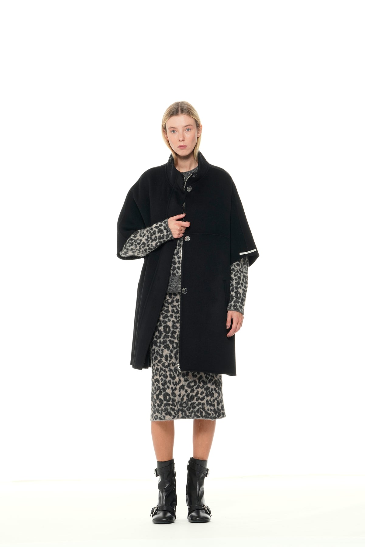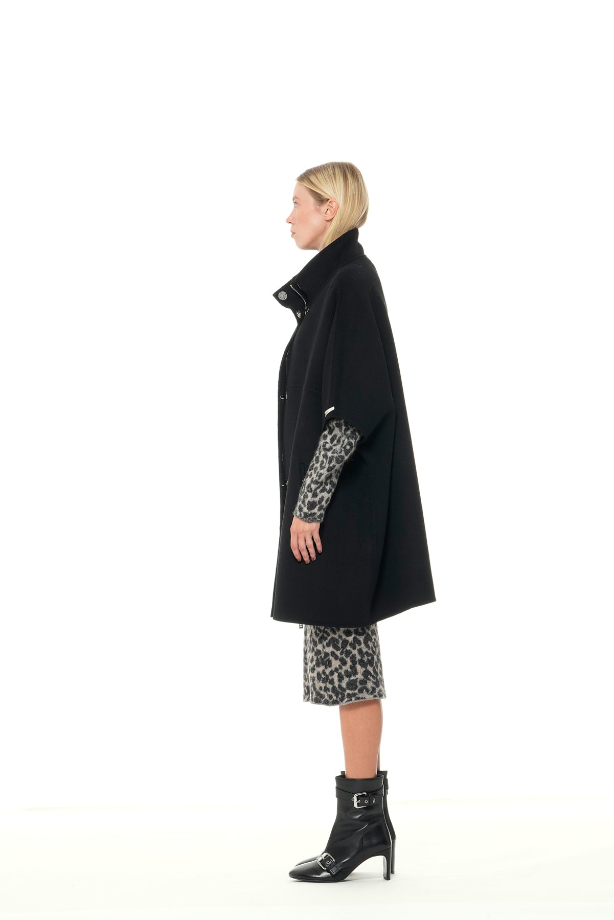 Cappotto modello lungo in lana double nero. Cintura in vita come chiusura. Vestibilità morbida