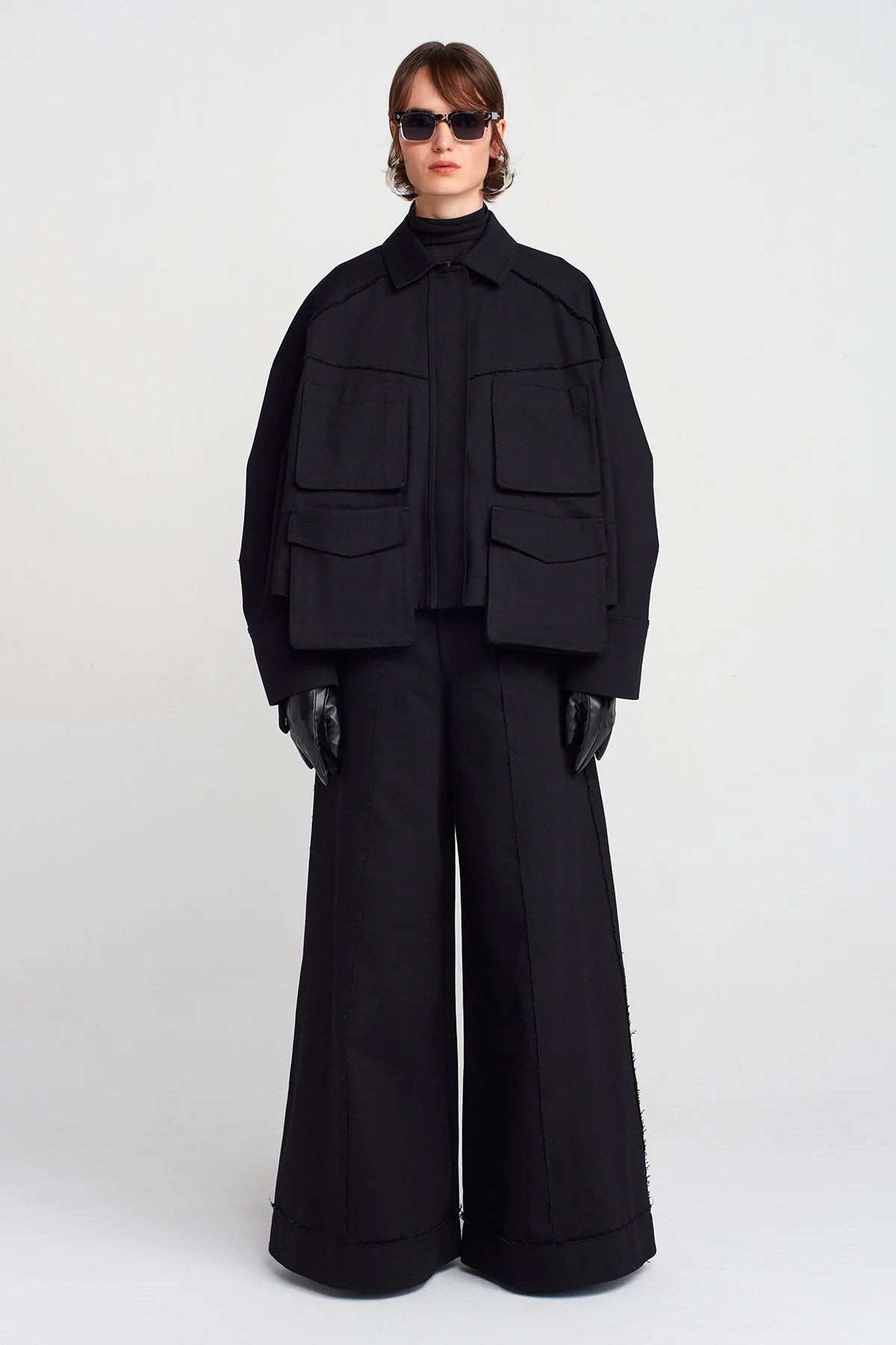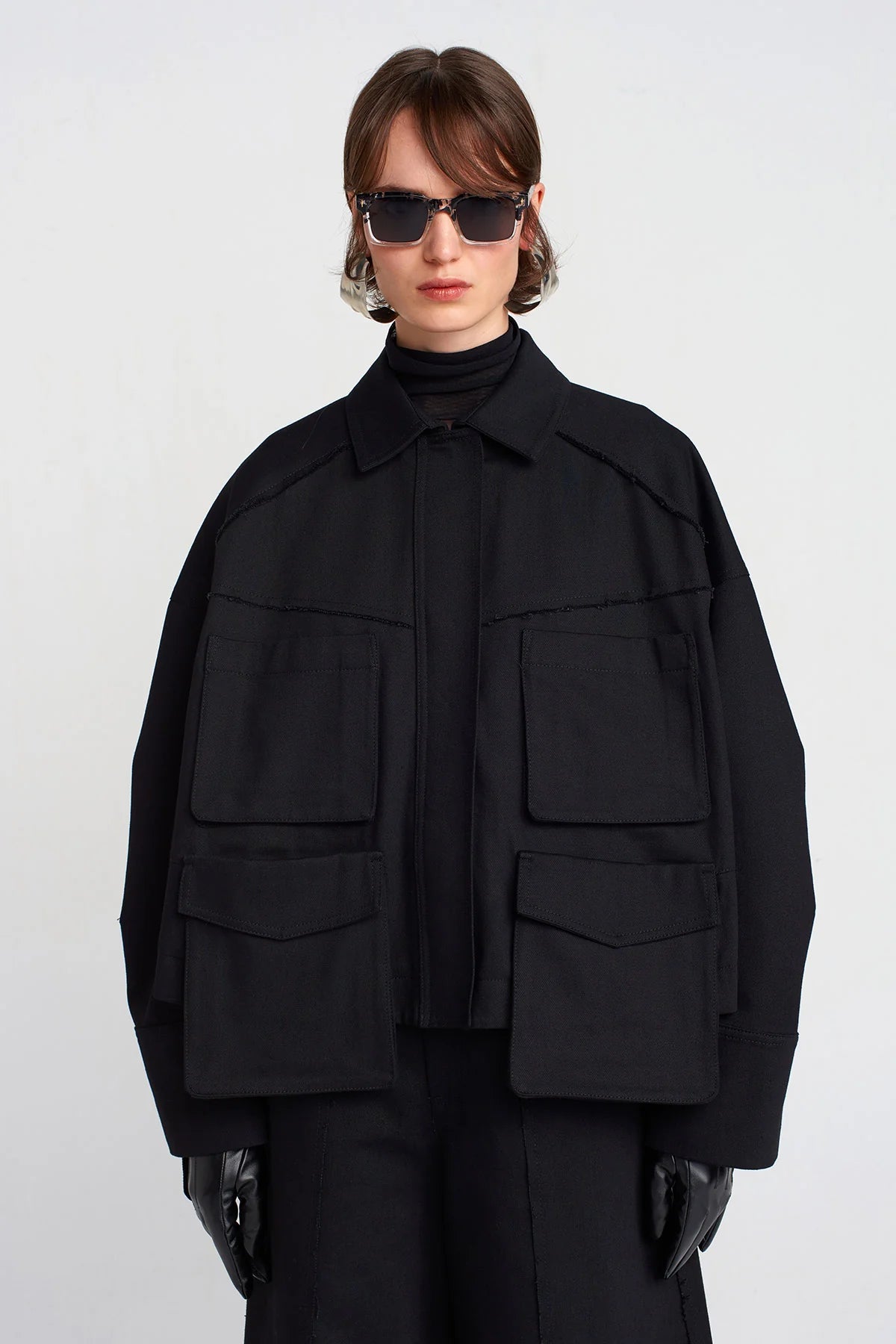 Giacca oversize in tessuto strutturato nero, ispirata allo stile utility. Il design si distingue per le quattro maxi tasche applicate sul davanti e le cuciture a vista che ne evidenziano la costruzione.