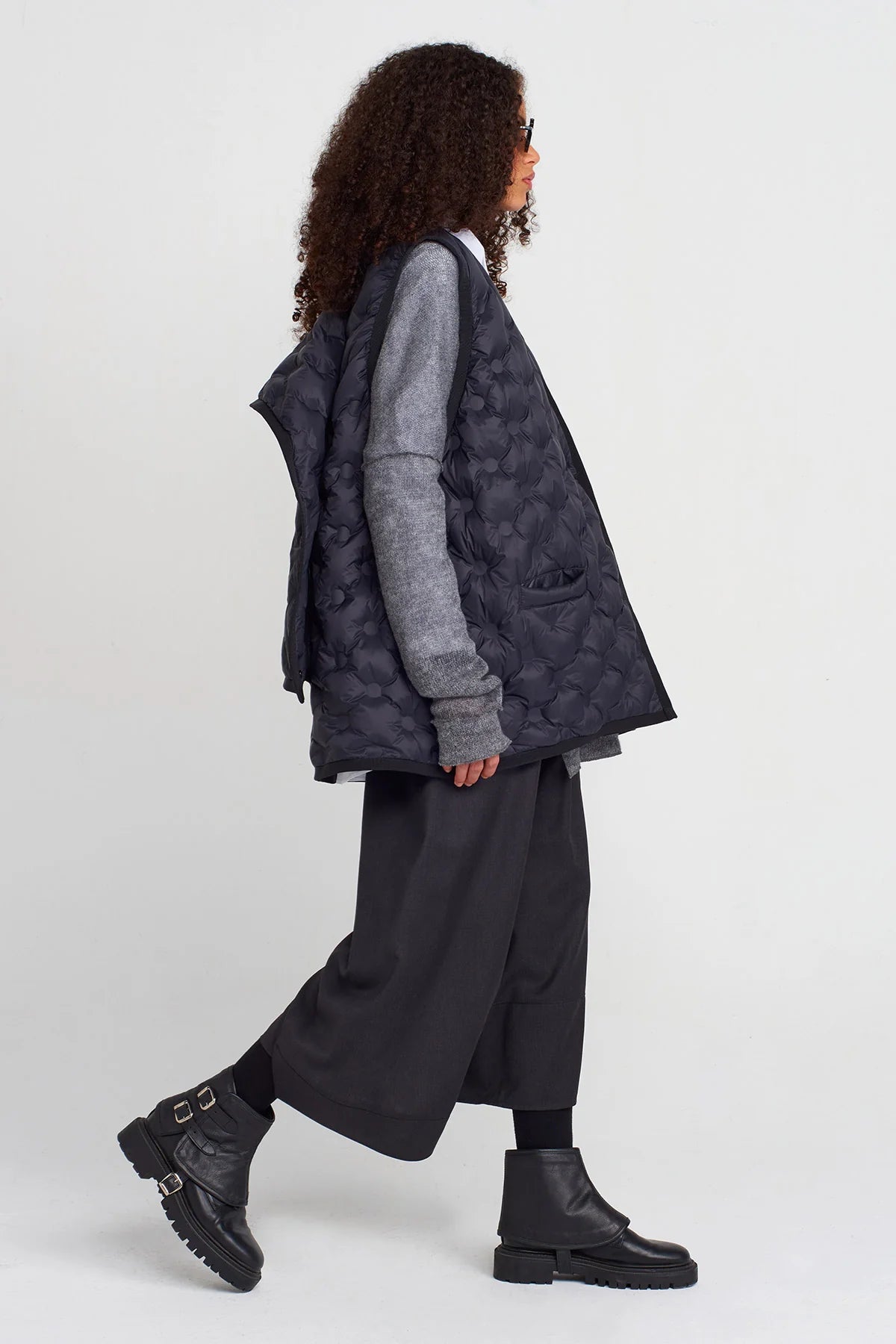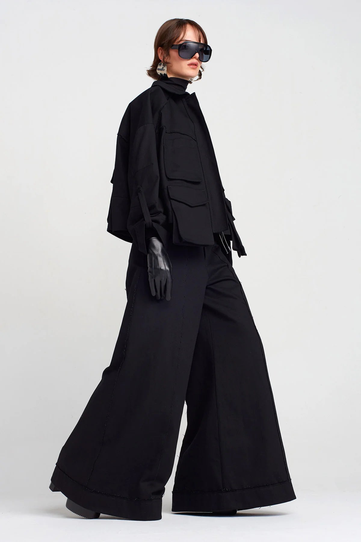 La gamba ampia conferisce volume e movimento, mentre i dettagli materici ne esaltano l’anima sperimentale. Ideali per chi ama distinguersi con capi essenziali ma di forte impatto, da abbinare a camicie minimal o top strutturati per un look sofisticato e unconventional.
