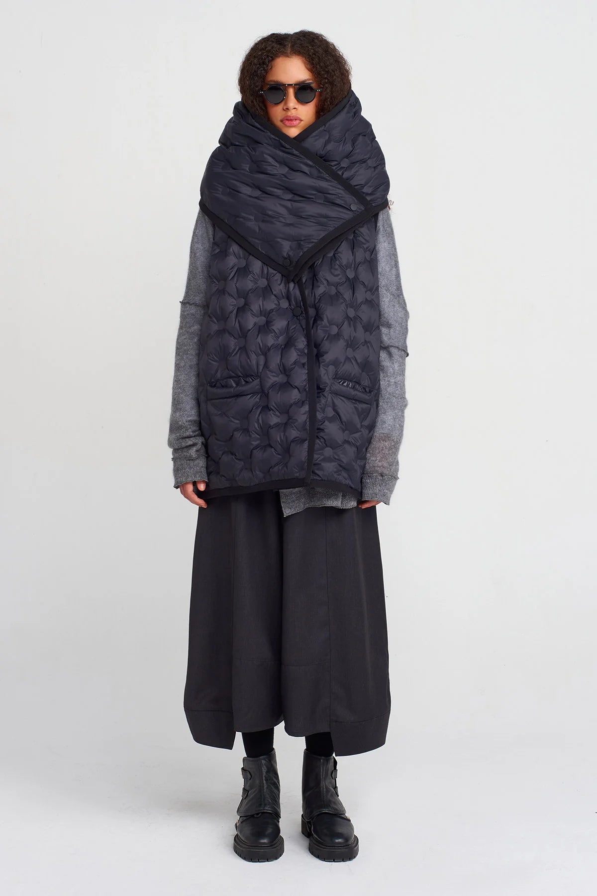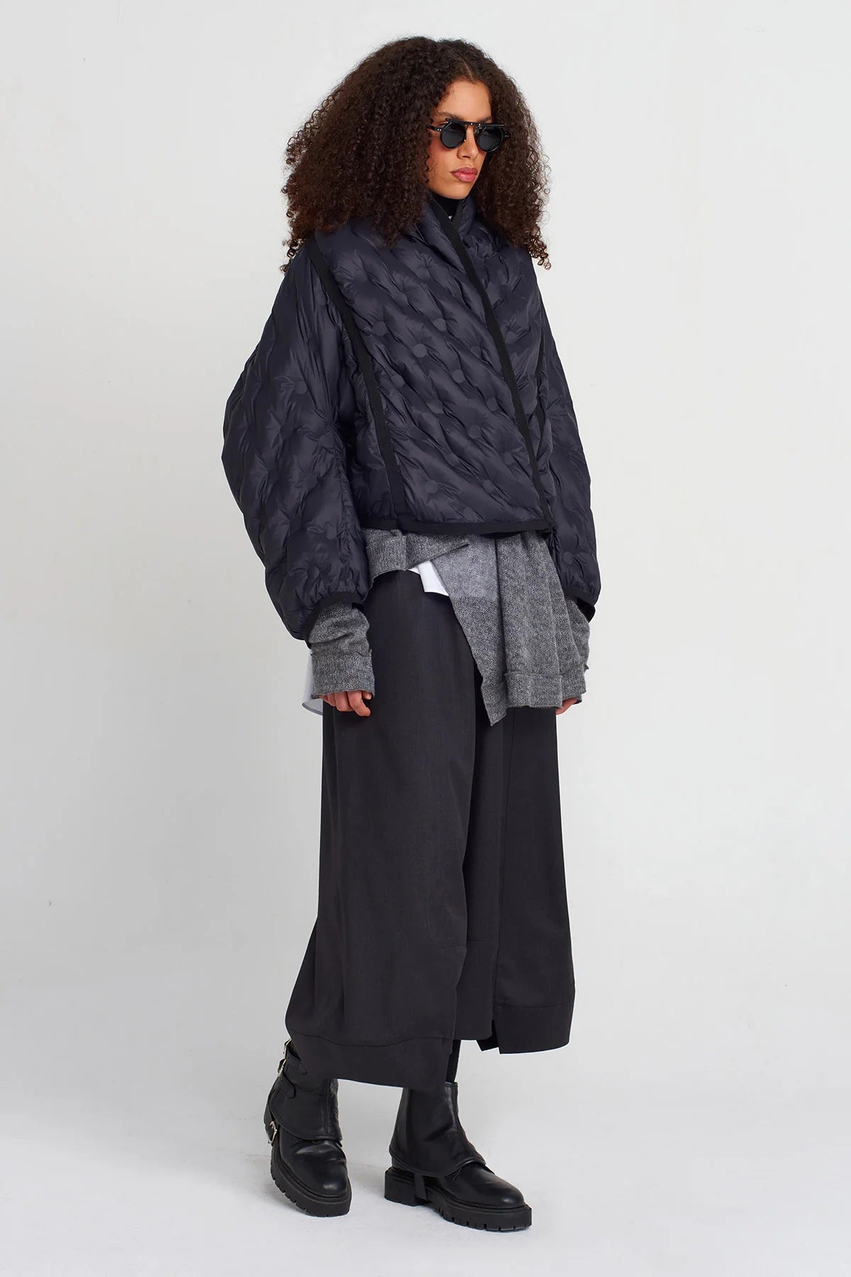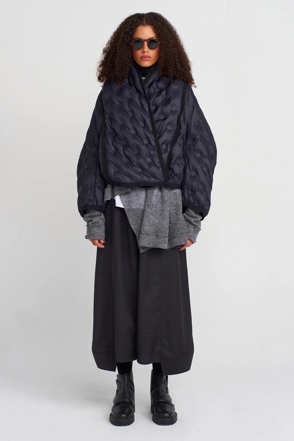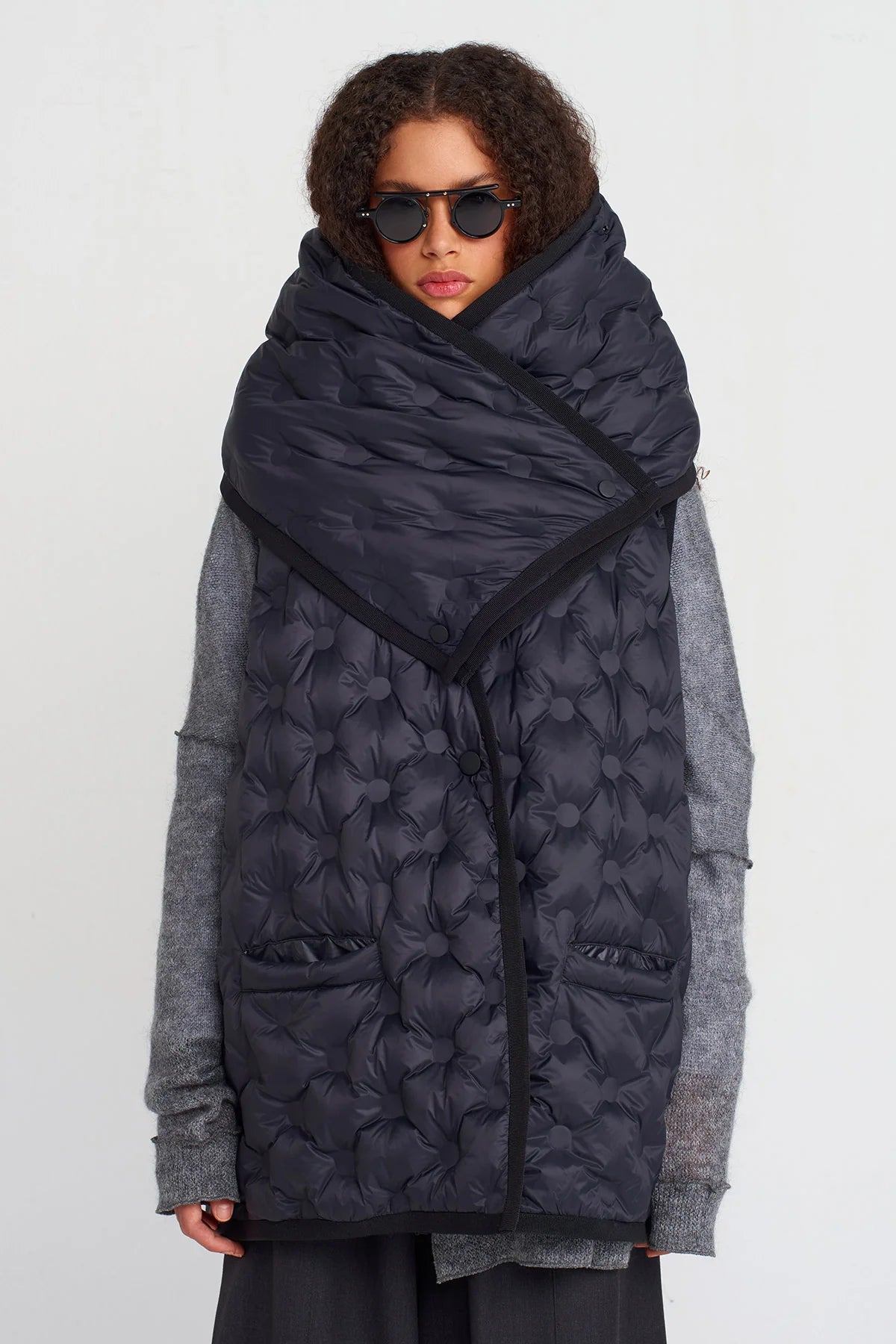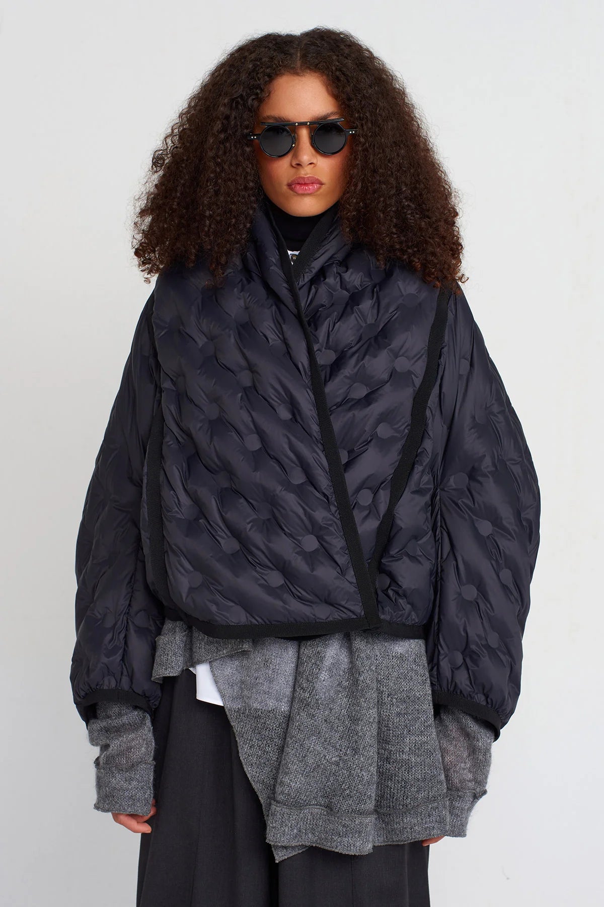 Una giacca imbottita dal design contemporaneo che unisce comfort e stile scultoreo. Caratterizzata da trapuntature tridimensionali con motivo a rilievo, presenta una linea oversize e una chiusura incrociata che ne accentua il carattere avvolgente. I bordi rifiniti in contrasto sottolineano la costruzione del capo, trasformando un classico piumino in un elemento di ricerca. Perfetta per affrontare la stagione fredda con un look deciso e sofisticato, ideale da sovrapporre a maglioni o blazer per un layering dinamico.