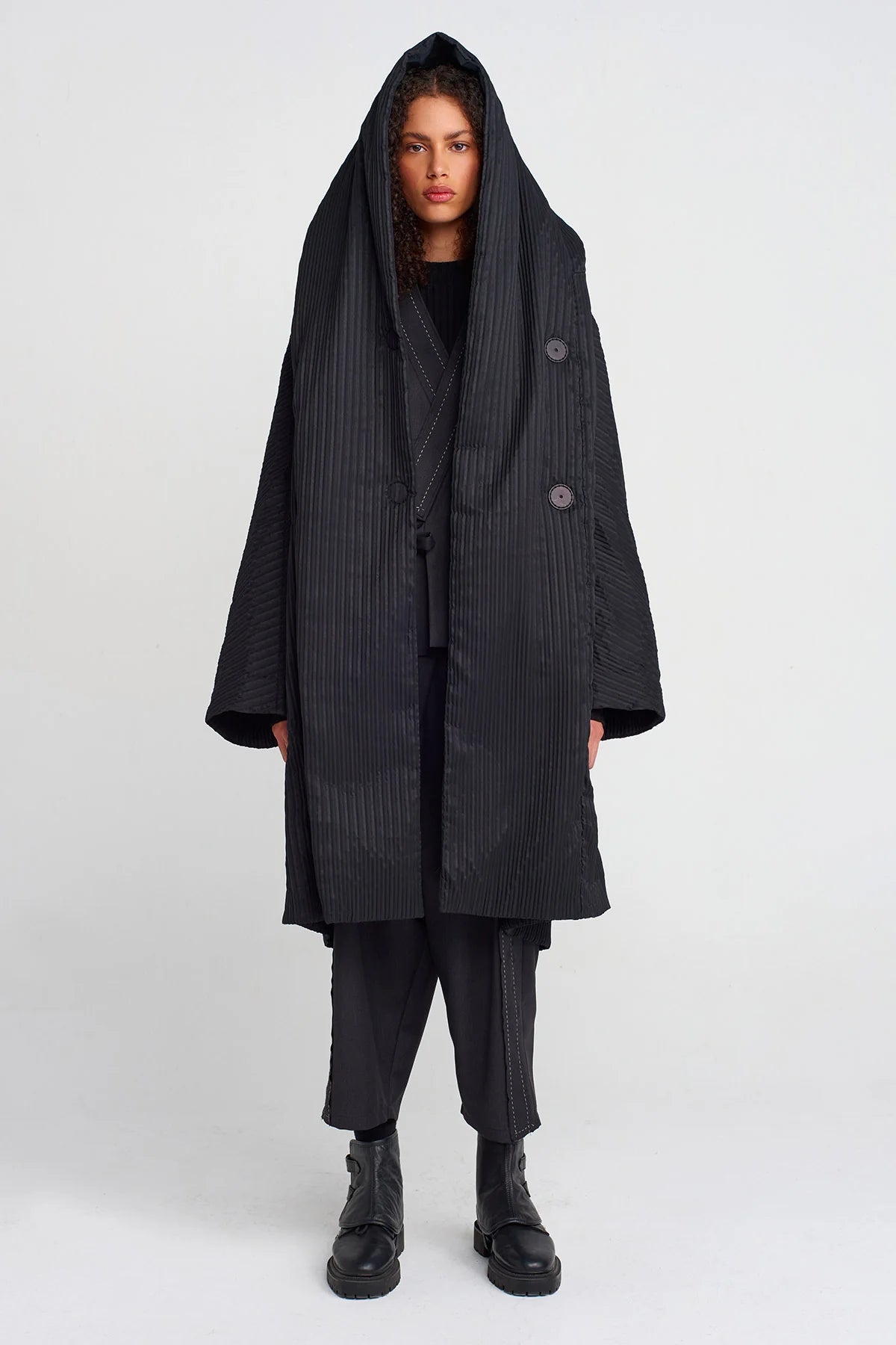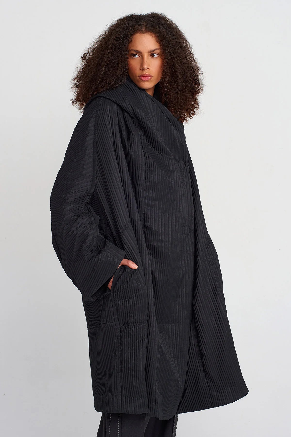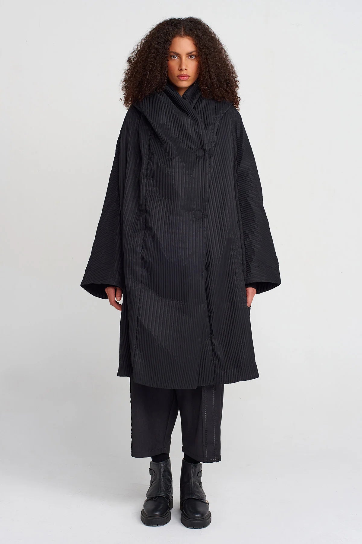 Cappotto oversize in tessuto plissé nero, caratterizzato da un design fluido e avvolgente. La texture a pieghe verticali dona movimento e un’eleganza scultorea, mentre le maniche ampie e la chiusura frontale con bottoni rivestiti completano lo stile essenziale e sofisticato. Un capo statement che unisce comfort e ricercatezza, perfetto per look contemporanei dal forte impatto visivo.