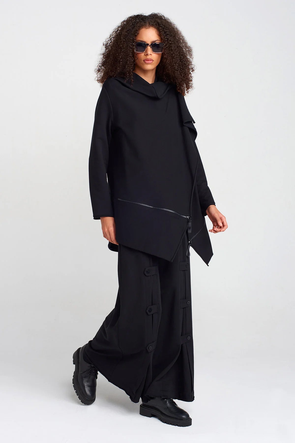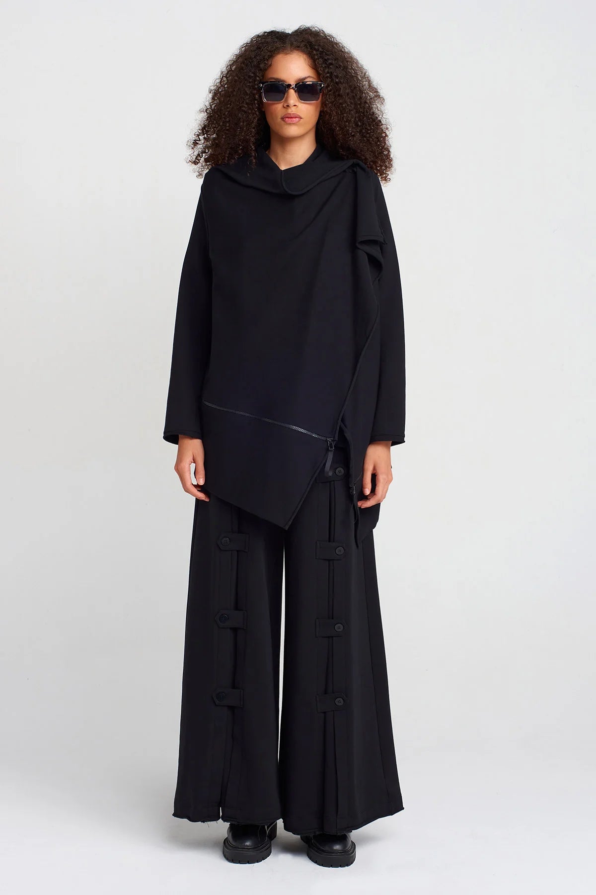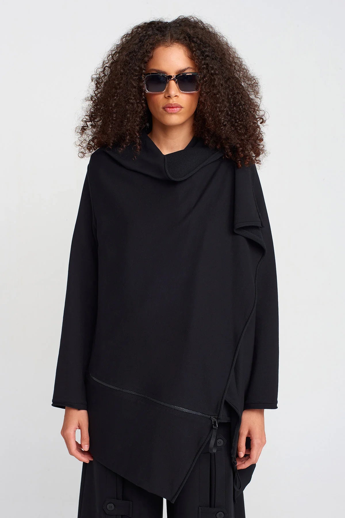 Un capo dal design sperimentale che unisce comfort e avanguardia. Questa felpa nera presenta una costruzione asimmetrica con zip diagonale e collo morbido drappeggiato che ne esalta l’attitudine contemporanea.