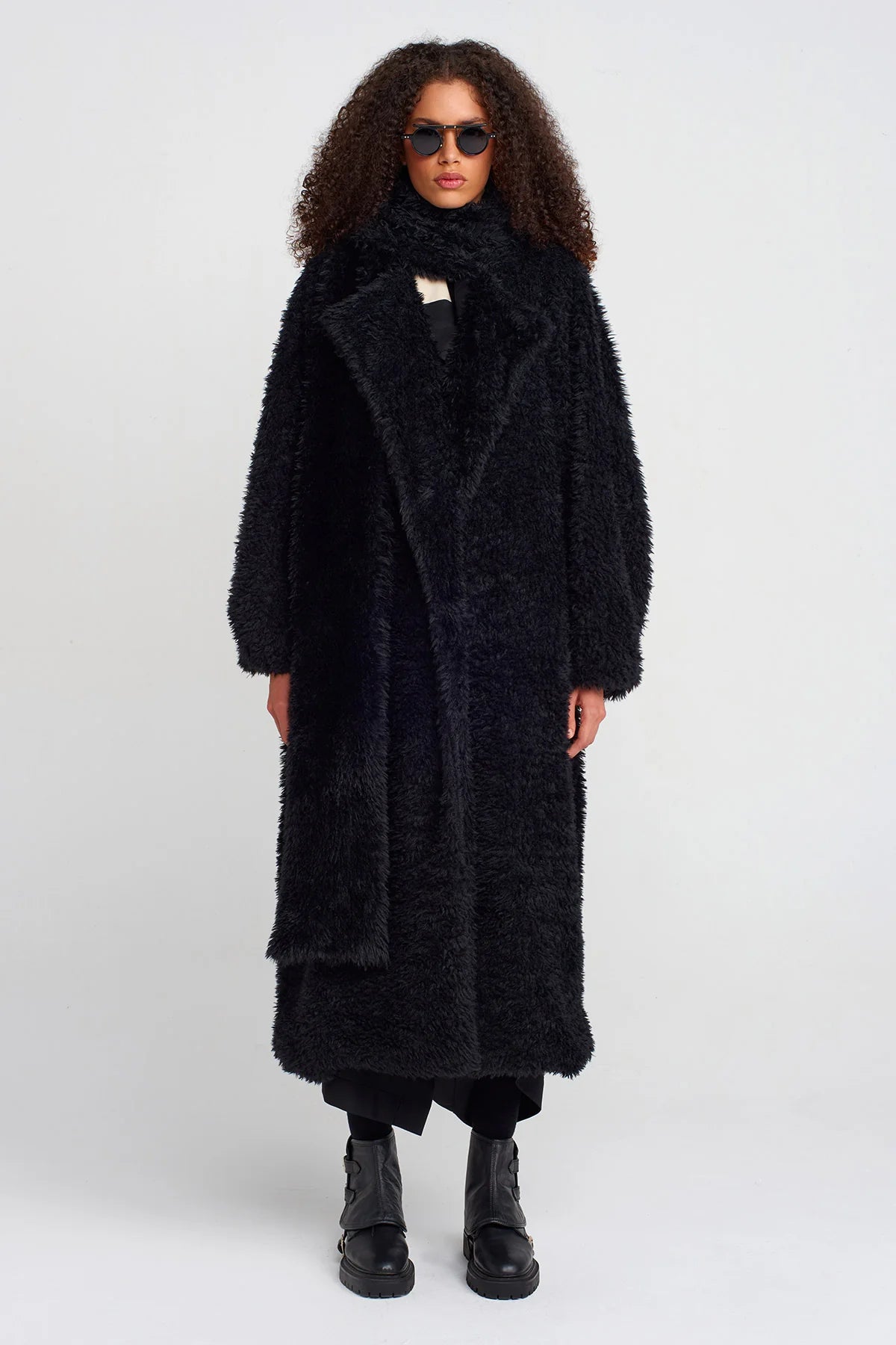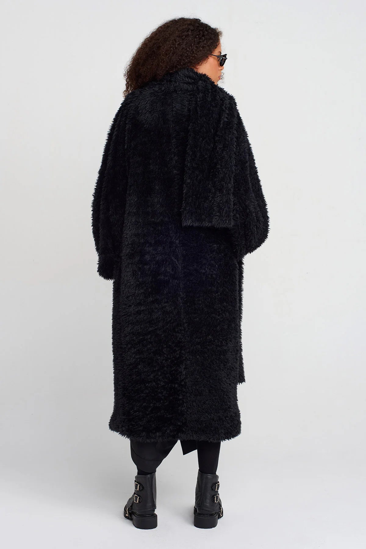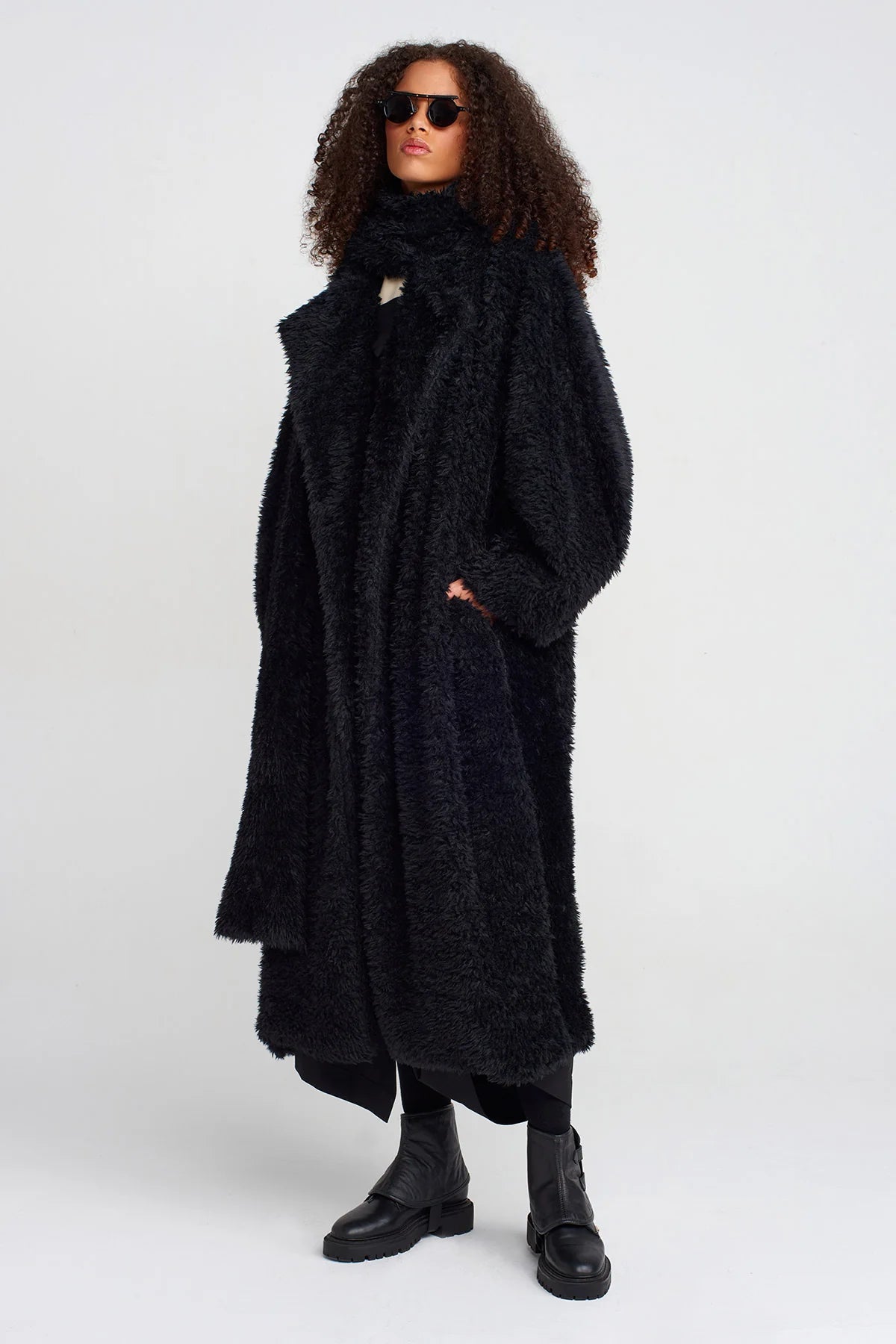 Cappotto over in morbida eco-pelliccia nera, dalla linea avvolgente e sofisticata. Il design presenta un taglio lungo fino alla caviglia, ampi revers e maniche morbide, garantendo comfort e stile nelle giornate più fredde. Elegante ma versatile, può essere indossato su outfit casual o da sera, aggiungendo sempre un tocco di carattere e raffinatezza.