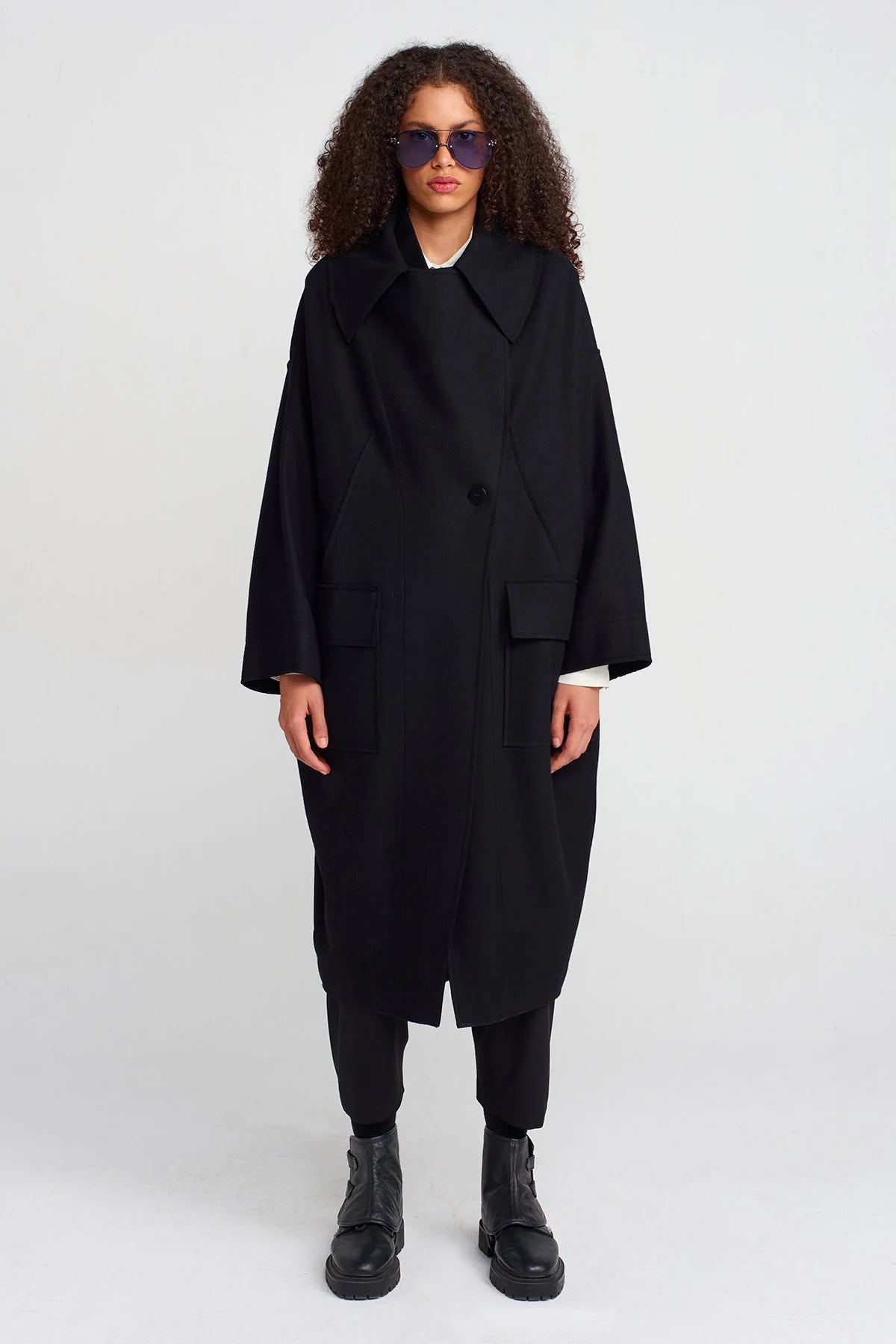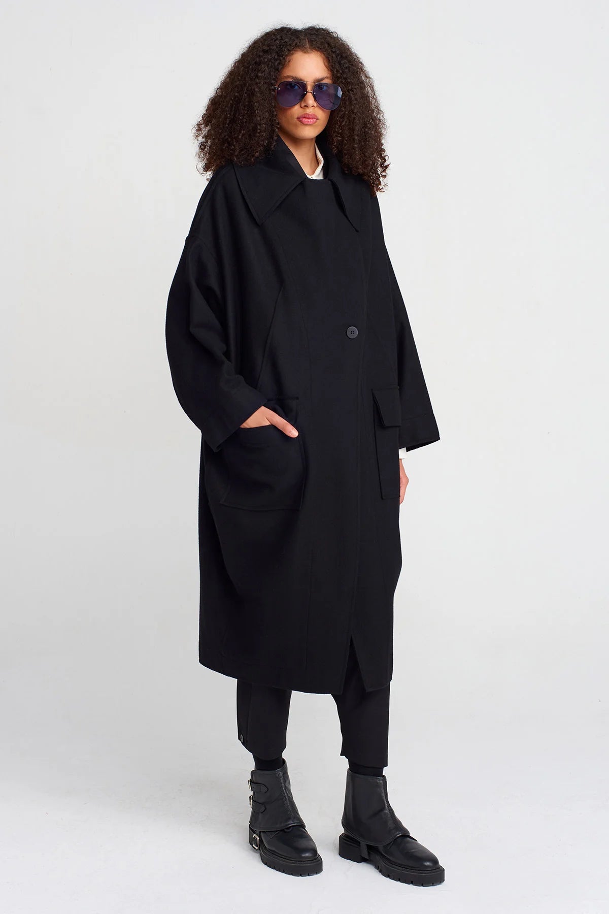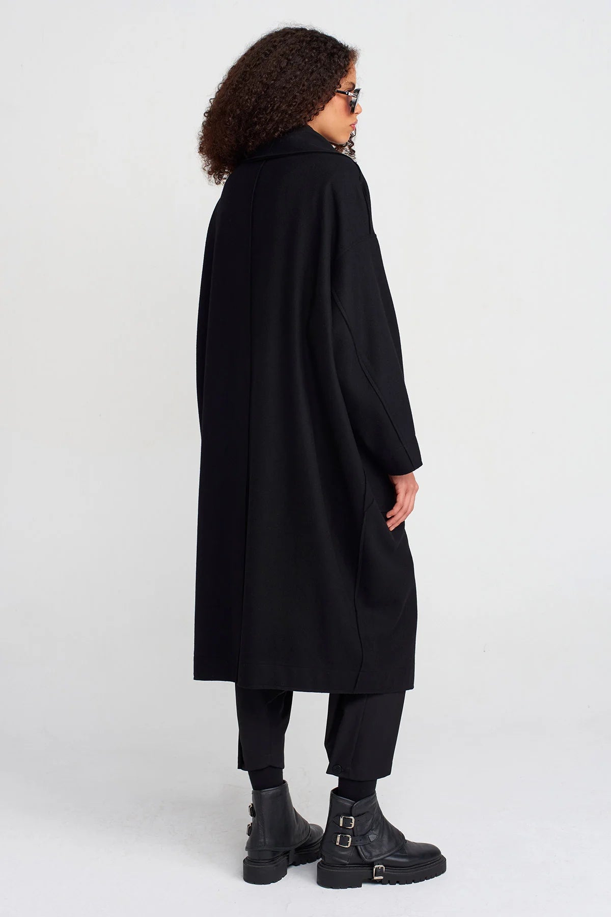Un cappotto dallo stile deciso e senza tempo, perfetto per chi ama l’eleganza essenziale con un tocco contemporaneo. La linea oversize avvolge la silhouette con naturalezza, mentre il maxi colletto dona carattere e struttura al design.