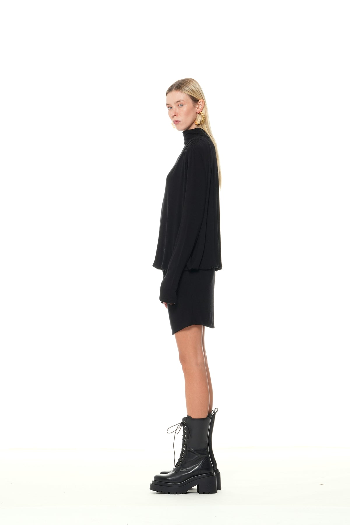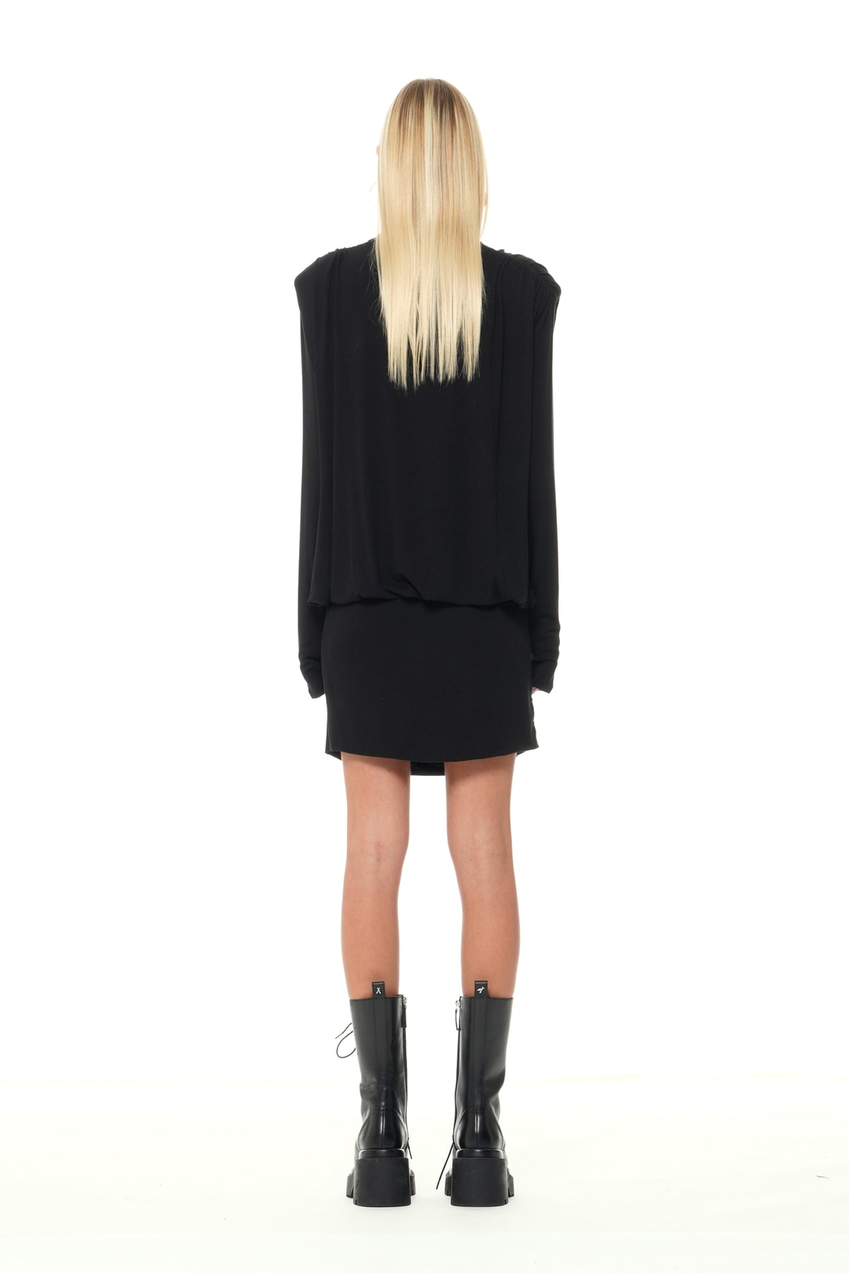 Una gonna che cattura la luce e l’attenzione. E’ realizzata in tulle trasparente ricamato con paillettes nere, disposte in un disegno astratto che crea profondità e movimento. La silhouette è midi, con lunghezza al polpaccio, e la linea dritta esalta la verticalità del corpo. La trasparenza del tulle gioca con i volumi e lascia intravedere le gambe, per un effetto scenico e seducente. Leggera ma intensa, questa gonna è pensata per la sera, da indossare con un body, un top essenziale o in coordinato con il suo top gemello. Perfetta per look da evento, performance o una notte che resta impressa.