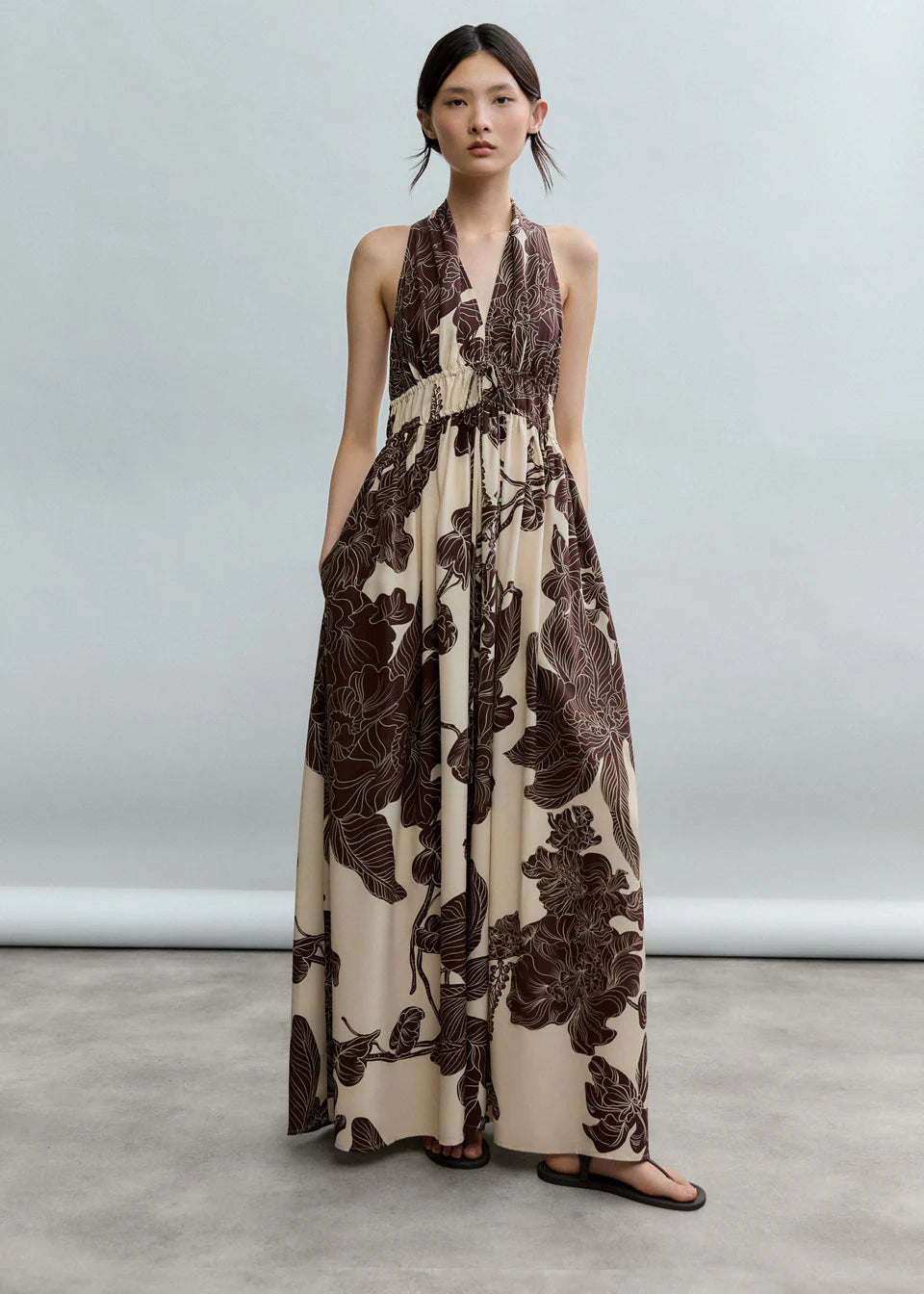 Questo abito halter con scollo profondo, realizzato in preziosa seta CDC, è impreziosito dalla stampa Orient Contour, dove foglie stilizzate e motivi floreali aggiungono profondità e delicatezza al design. Lo scollo halter profondocrea una silhouette elegante e slanciata, mentre il punto vita arricciato definisce delicatamente la figura, valorizzando il naturale drappeggio della seta.