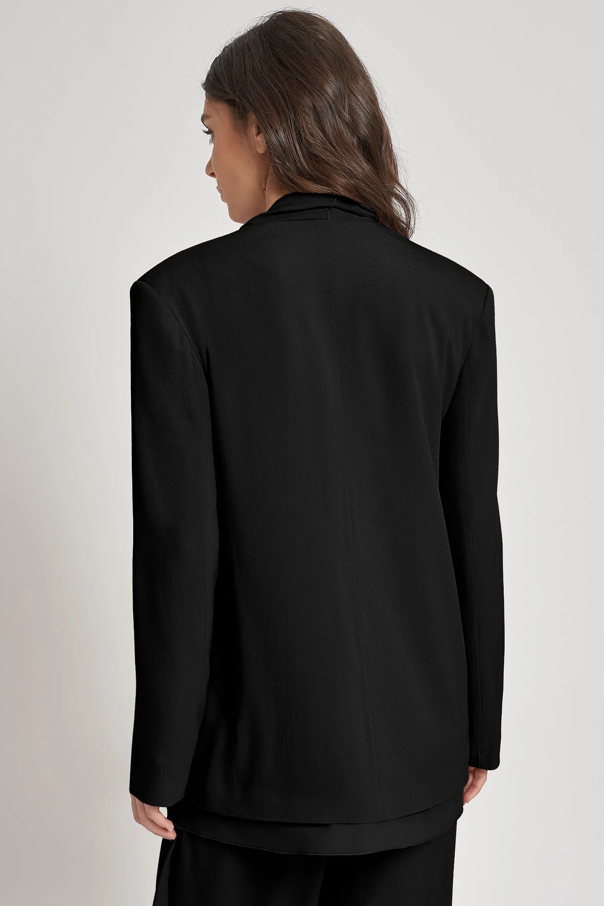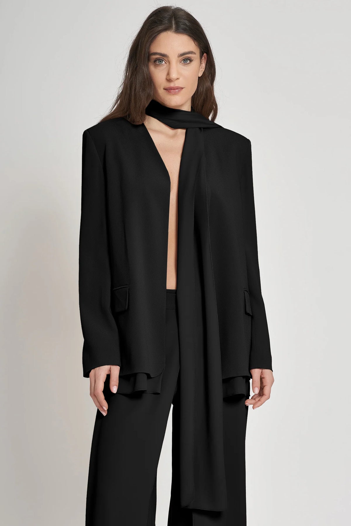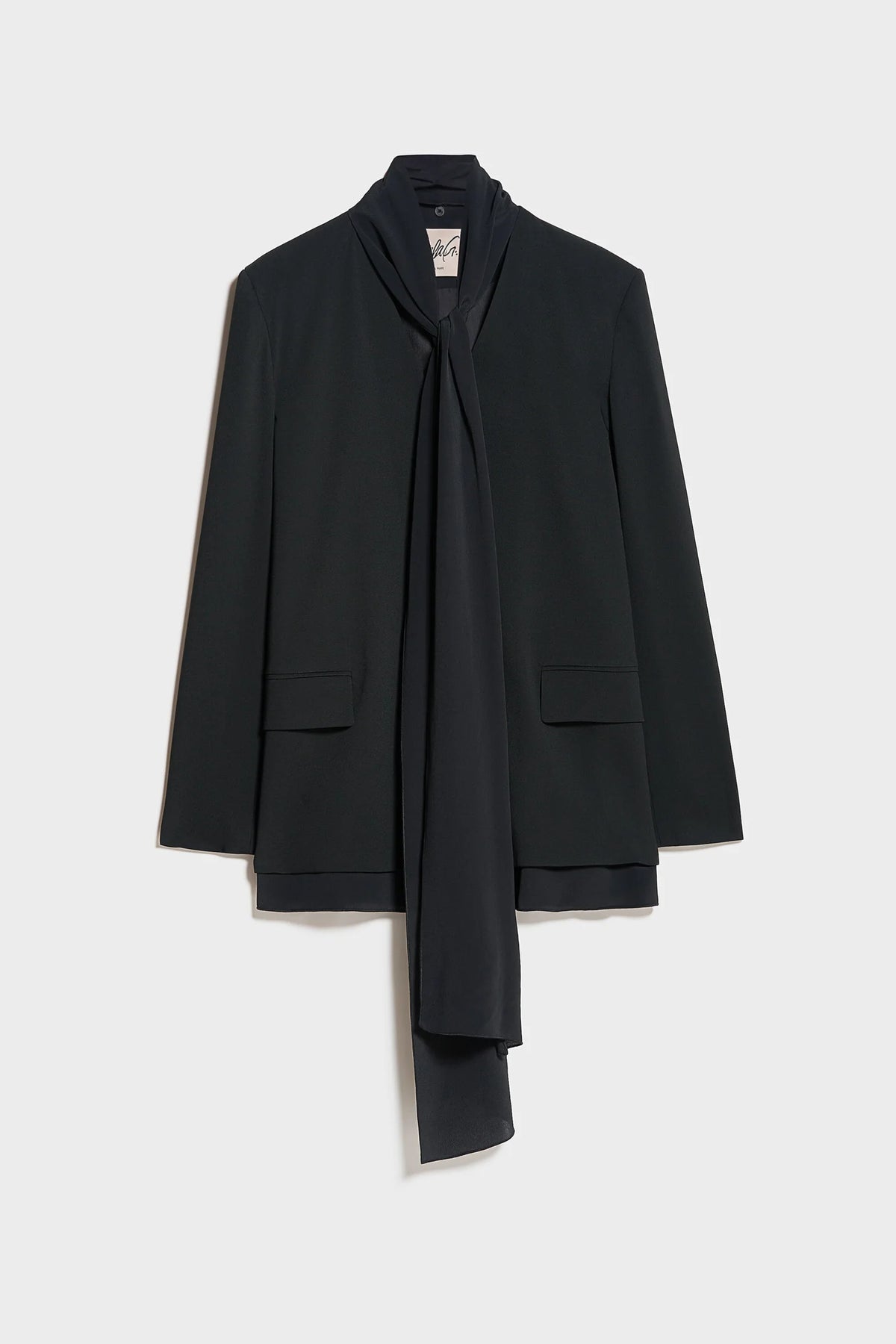 Blazer foderato in crepe di viscosa. Spalline imbottite e allacciatura senza bottoni. Sciarpa removibile con bottoni e fondo in crepe de chine. Tasche con patte applicate. Lunghezza sotto i fianchi.