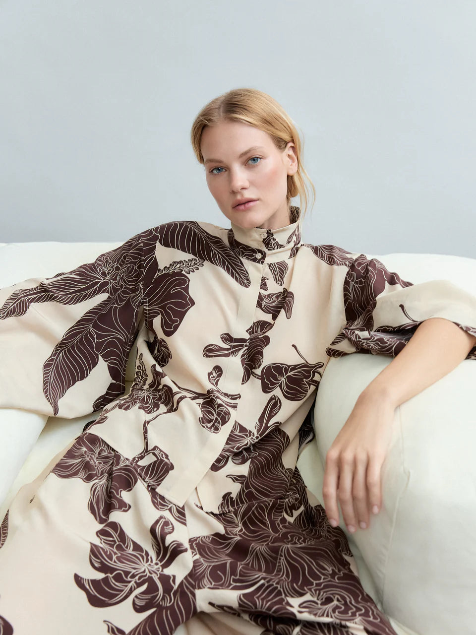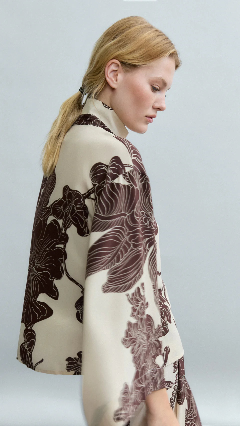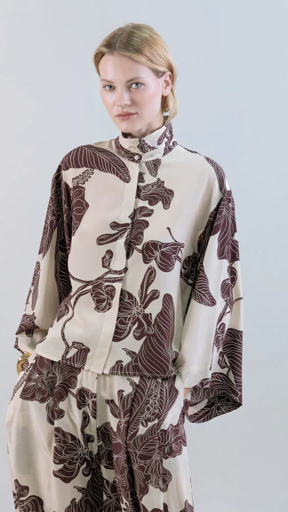 Questa blusa in seta CDC presenta la stampa Orient Contour, in cui foglie stilizzate e motivi floreali sembrano scorrere sul tessuto, donando leggerezza e movimento. Il doppio collo alla coreana incornicia il viso con una sofisticata essenzialità, mentre le ampie maniche kimono creano una silhouette confortevole e avvolgente.
