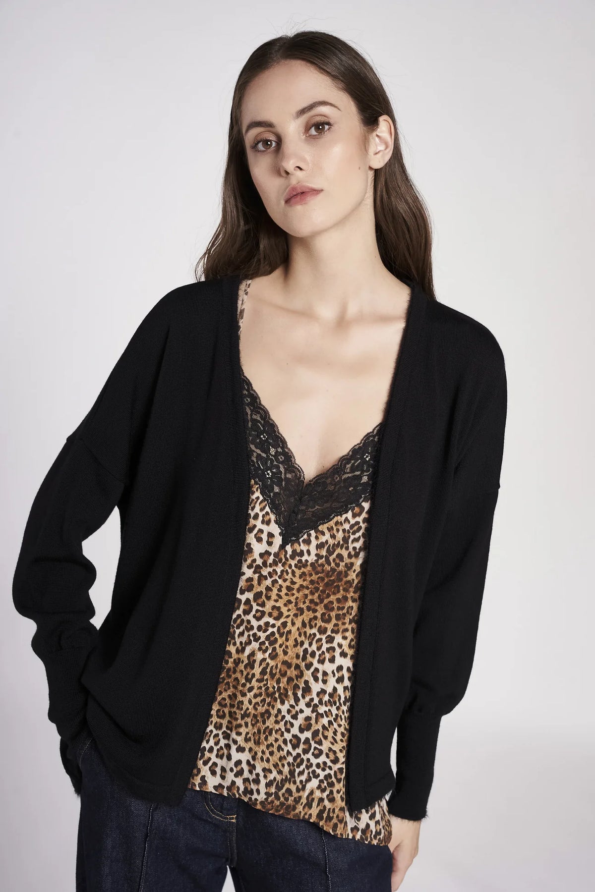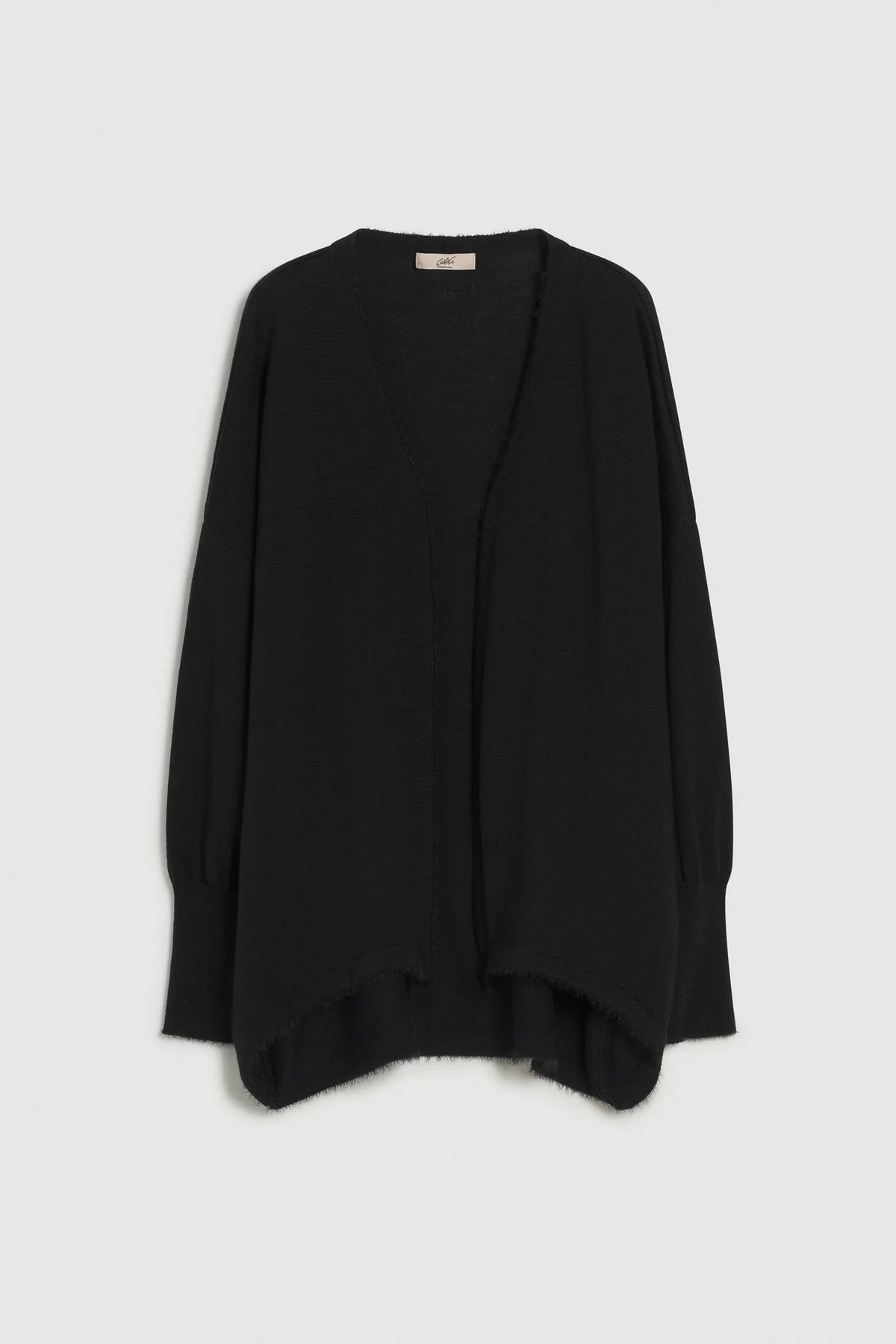 Cardigan asimmetrico in lana merinos. Profili pelosi. Polsini con lavorazione a coste. Linea morbida, lunghezza sotto i fianchi.