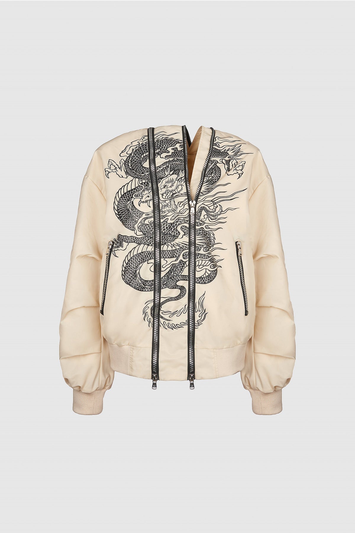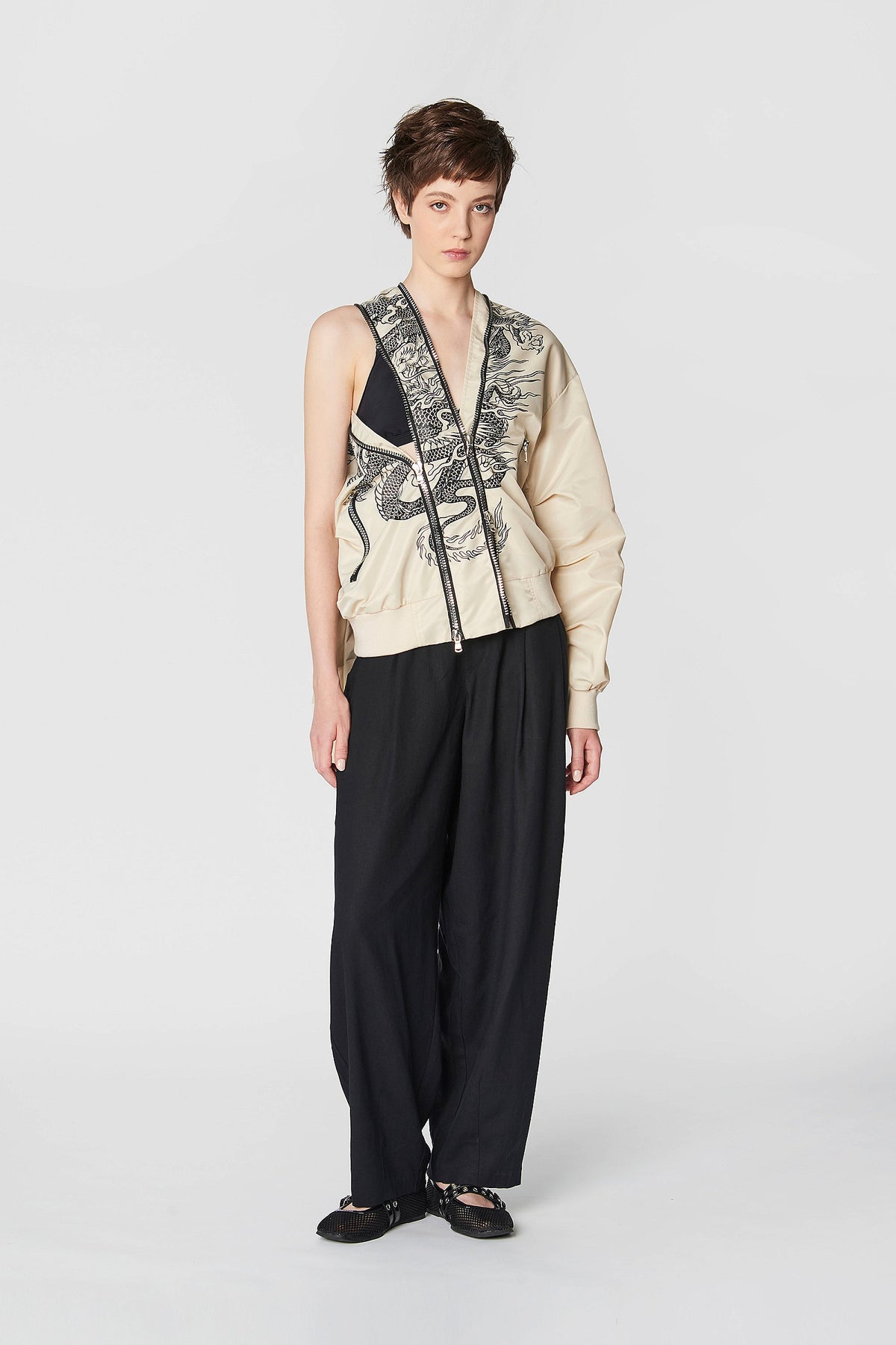 Il bomber Enora in raso con cerniera doppia è un must assoluto di questa stagione. Il disegno frontale di un dragone cinese aggiunge carattere e originalità al capo, perfetto per contrasti audaci con maxi dresses che aggiungono un tocco chic, gonne in pelle, o l'immancabile combo jeans e T-shirt bianca.