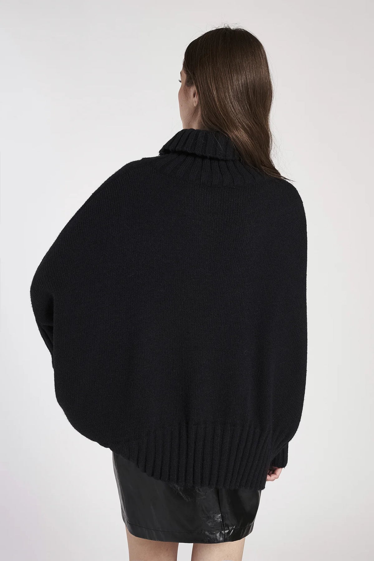 Maglia a collo alto in lana grossa. Maniche e fondo lavorati a coste. Giro manica sceso. Linea ampia. Lunghezza ai fianchi.