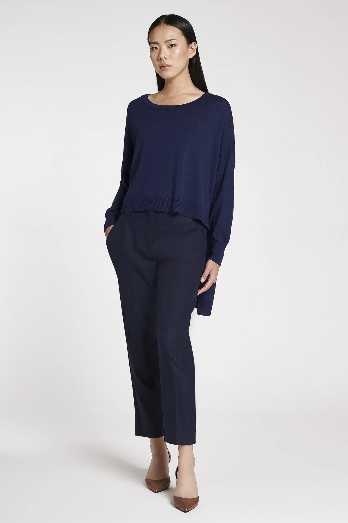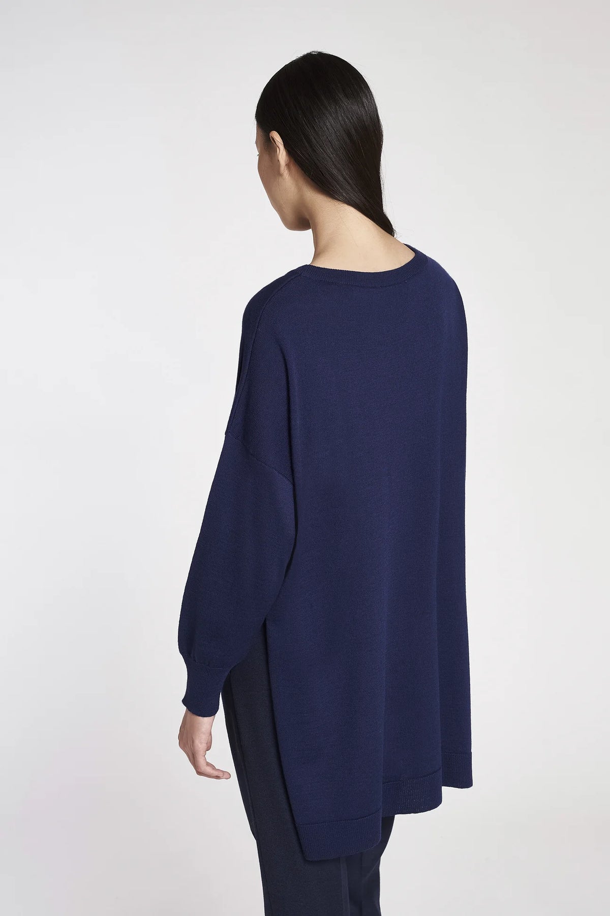 Maglia asimmetrica linea oversize a maniche lunghe in lana merinos con scollo a barchetta.
