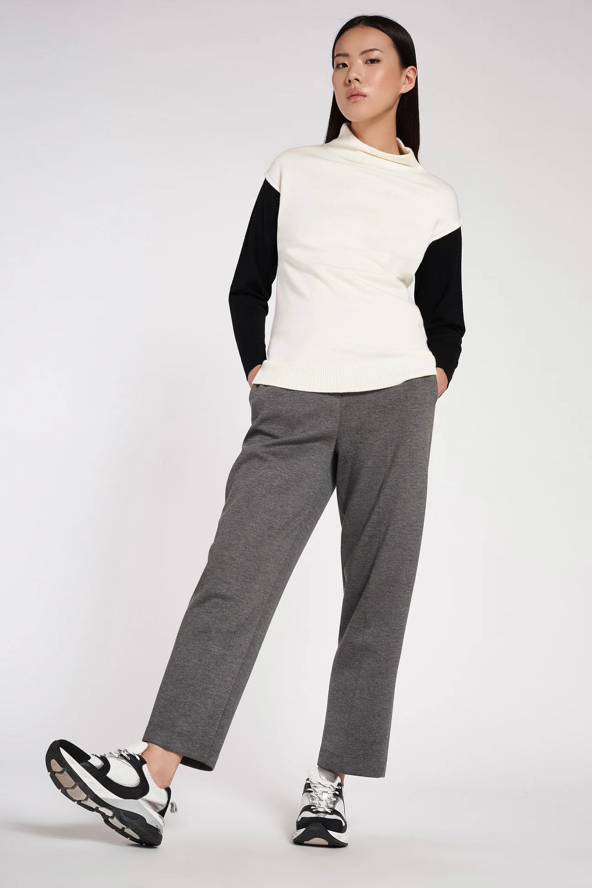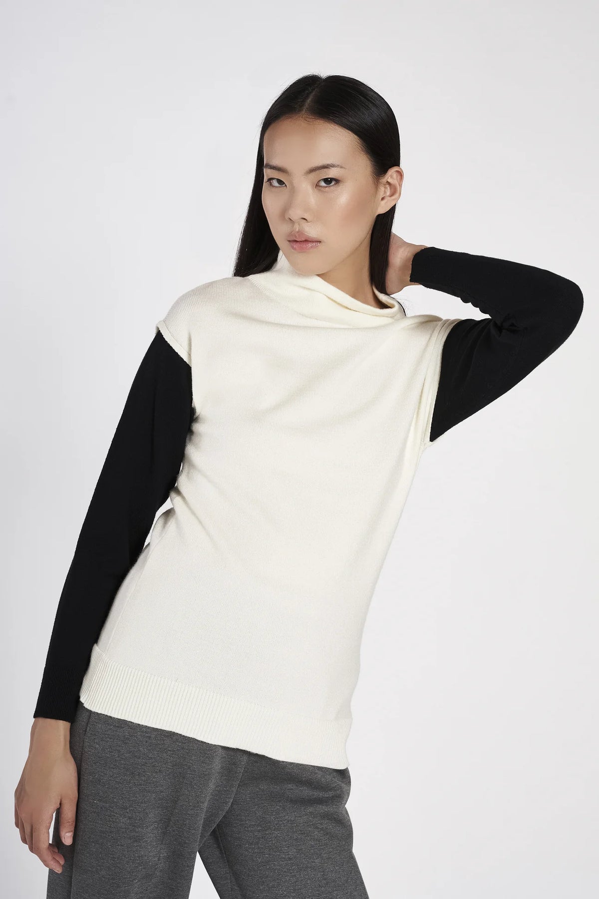 Maglia in viscosa elasticizzata a collo alto con maniche a contrasto. Fondo e polsini con lavorazione a coste. Linea morbida, lunghezza fianchi.