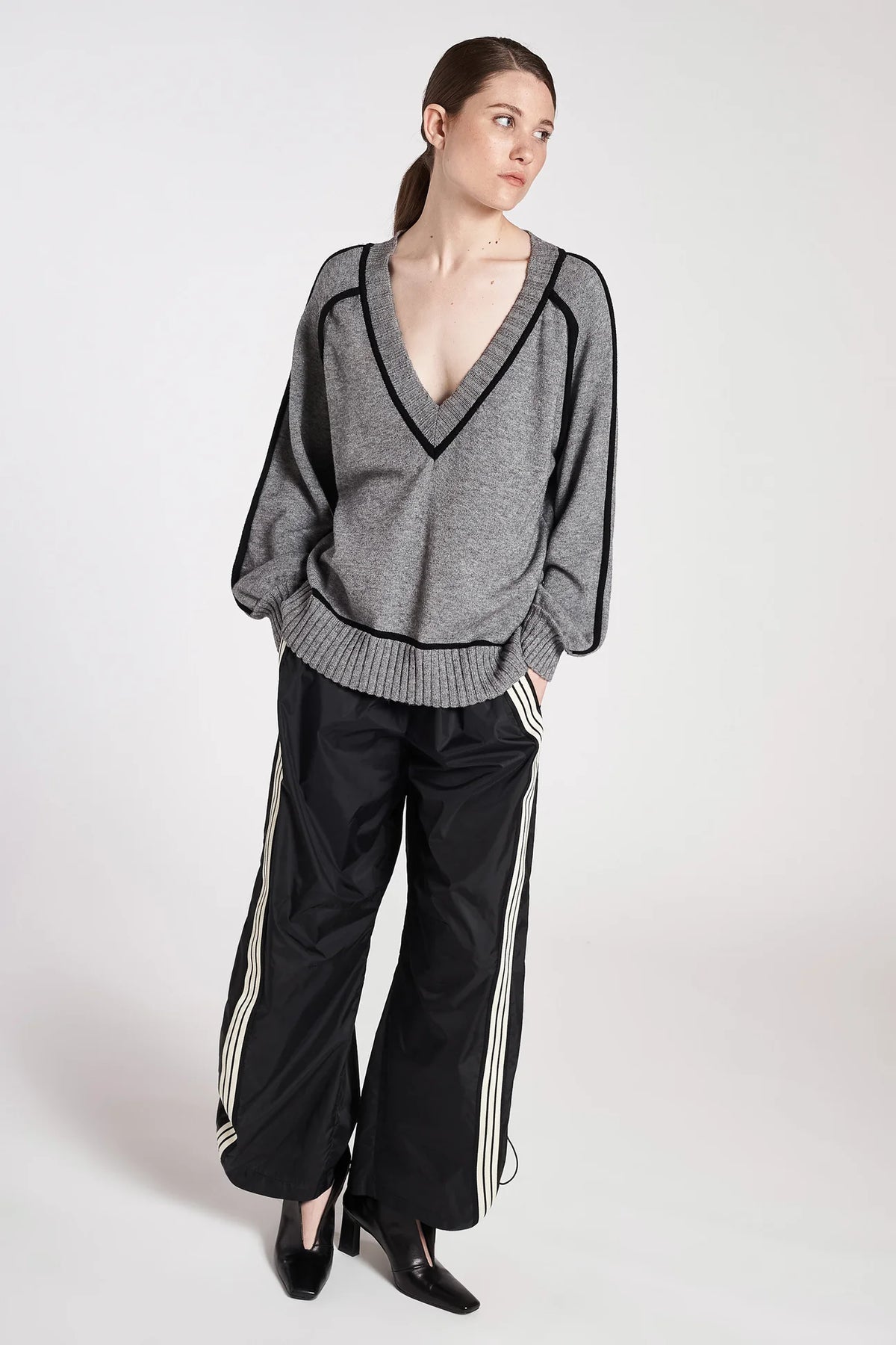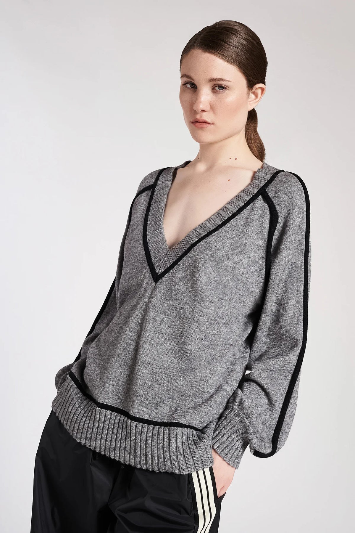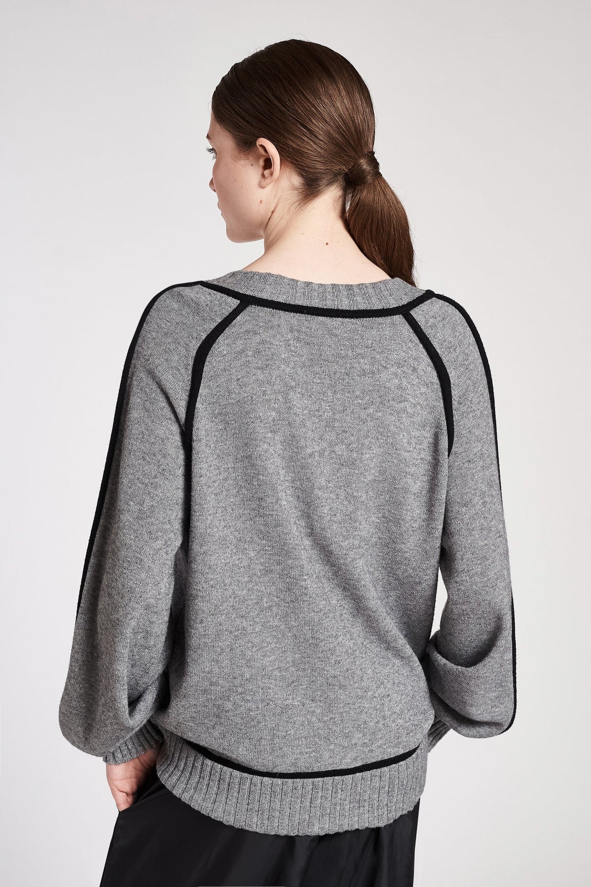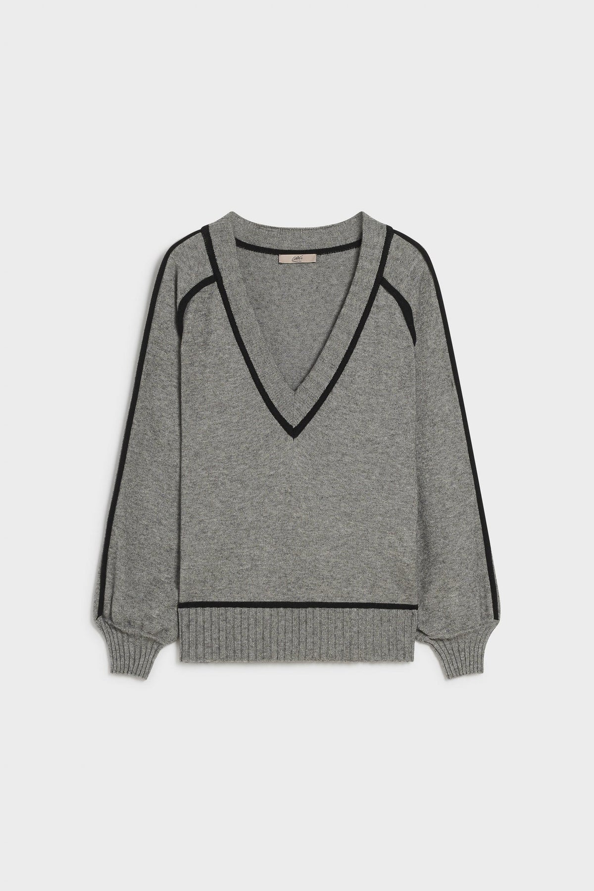 Maglia in viscosa elasticizzata con scollo a V e profili a contrasto. Fondo, polsini e scollo con lavorazione a coste. Linea morbida, lunghezza fianchi.