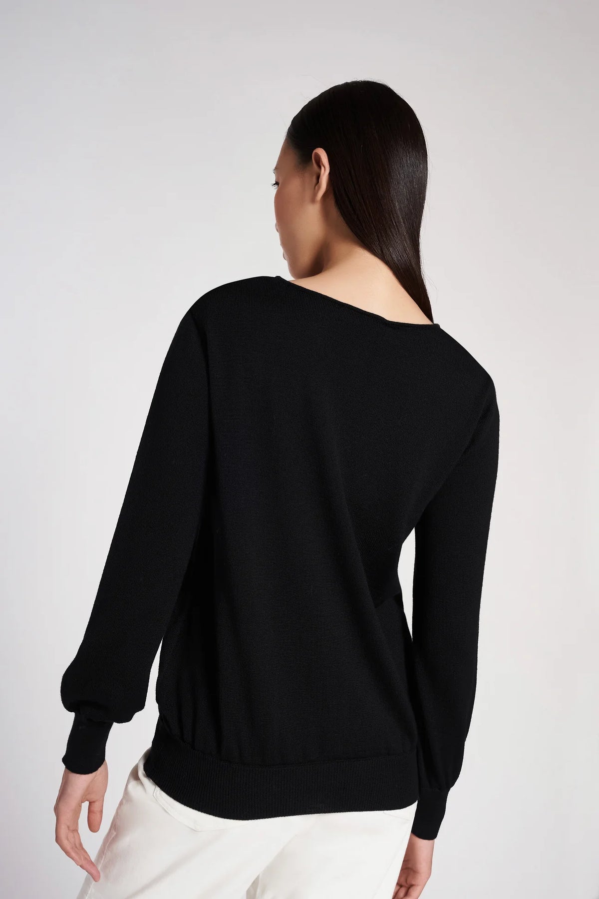Maglia a manica lunga in lana merinos. Cut out nella spalla destra. Fondo e polsini lavorati a coste. Linea morbida, lunghezza ai fianchi.
