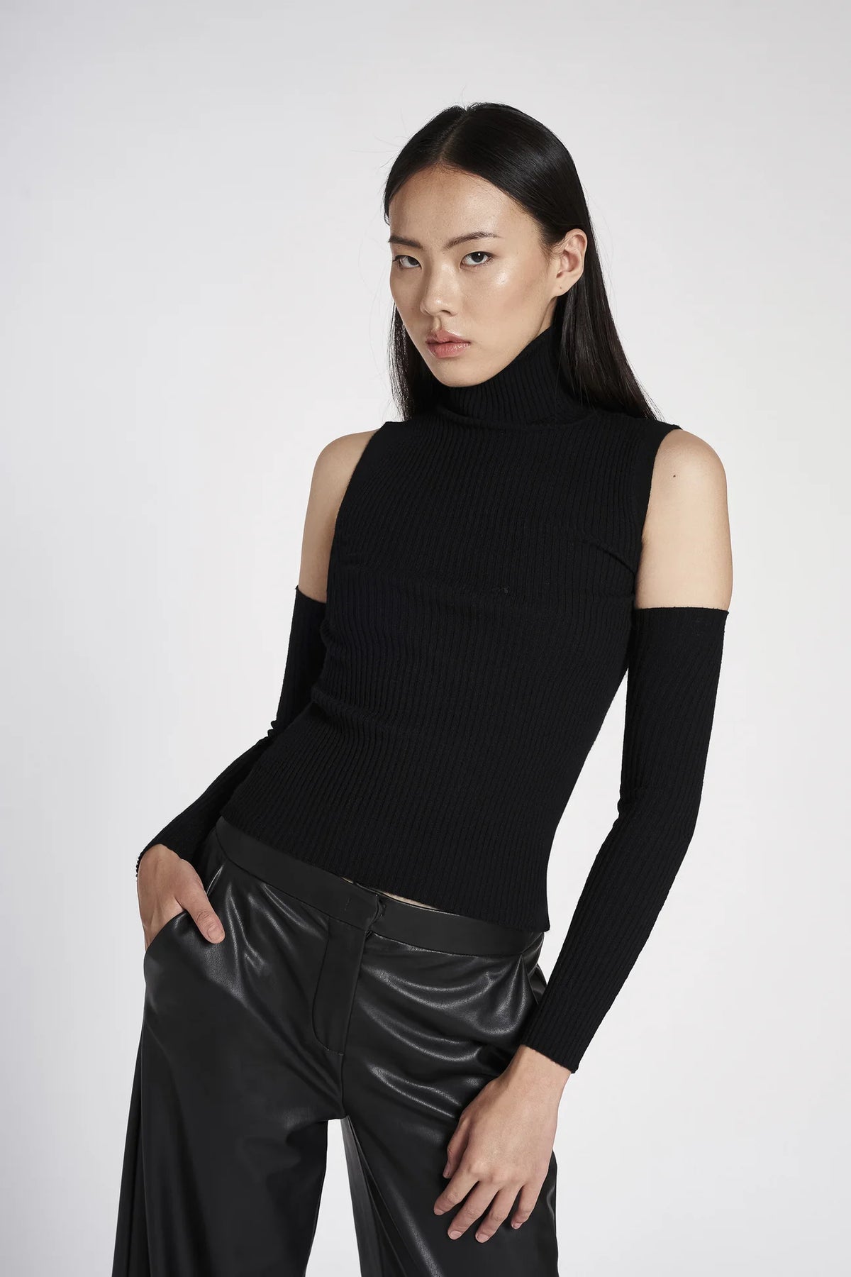 Maglia con spalle cut-out a collo alto risvoltato in viscosa elasticizzata a costine. Linea aderente, lunghezza fianchi.