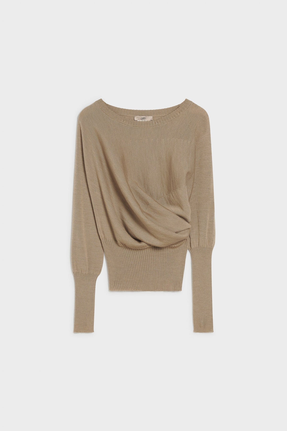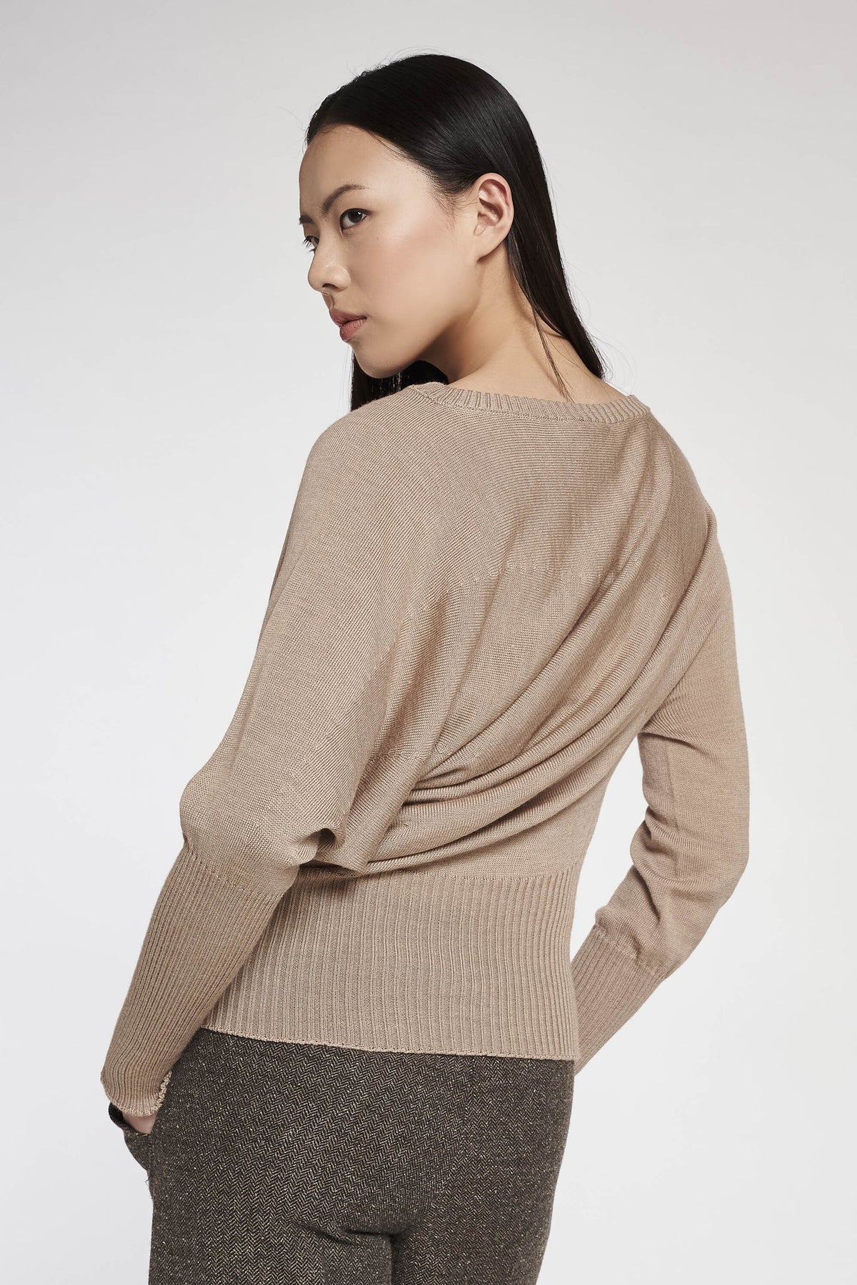 Maglia maniche lunghe con drappeggio nel fondo in lana merinos. Fondo, scollo e polsini lavorati a coste. Linea morbida, lunghezza fianchi