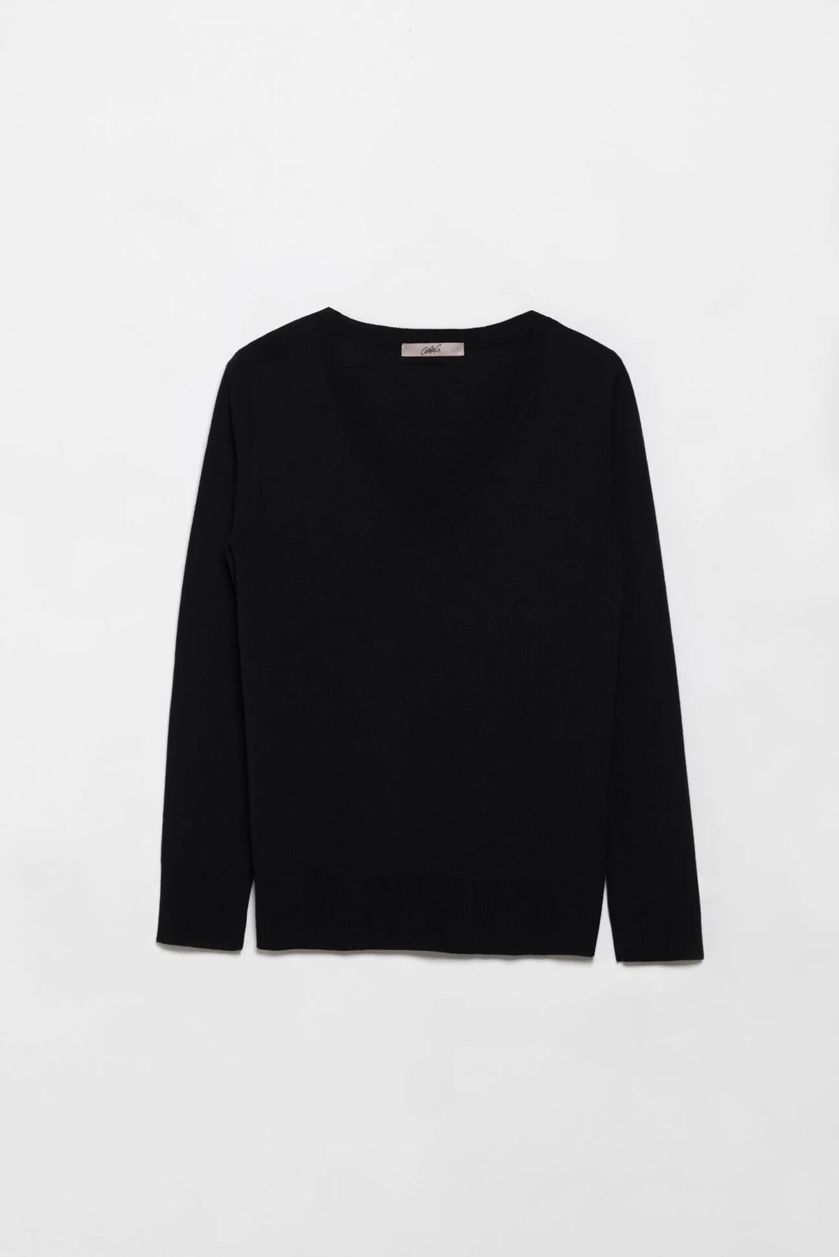 Maglia scollo a V in lana merinos. Bordi a coste. Lunghezza sopra i fianchi.