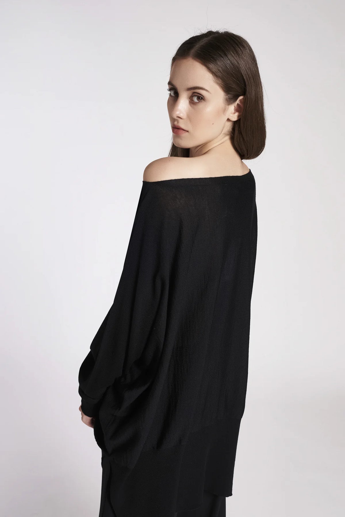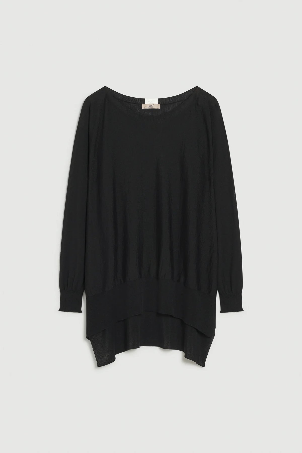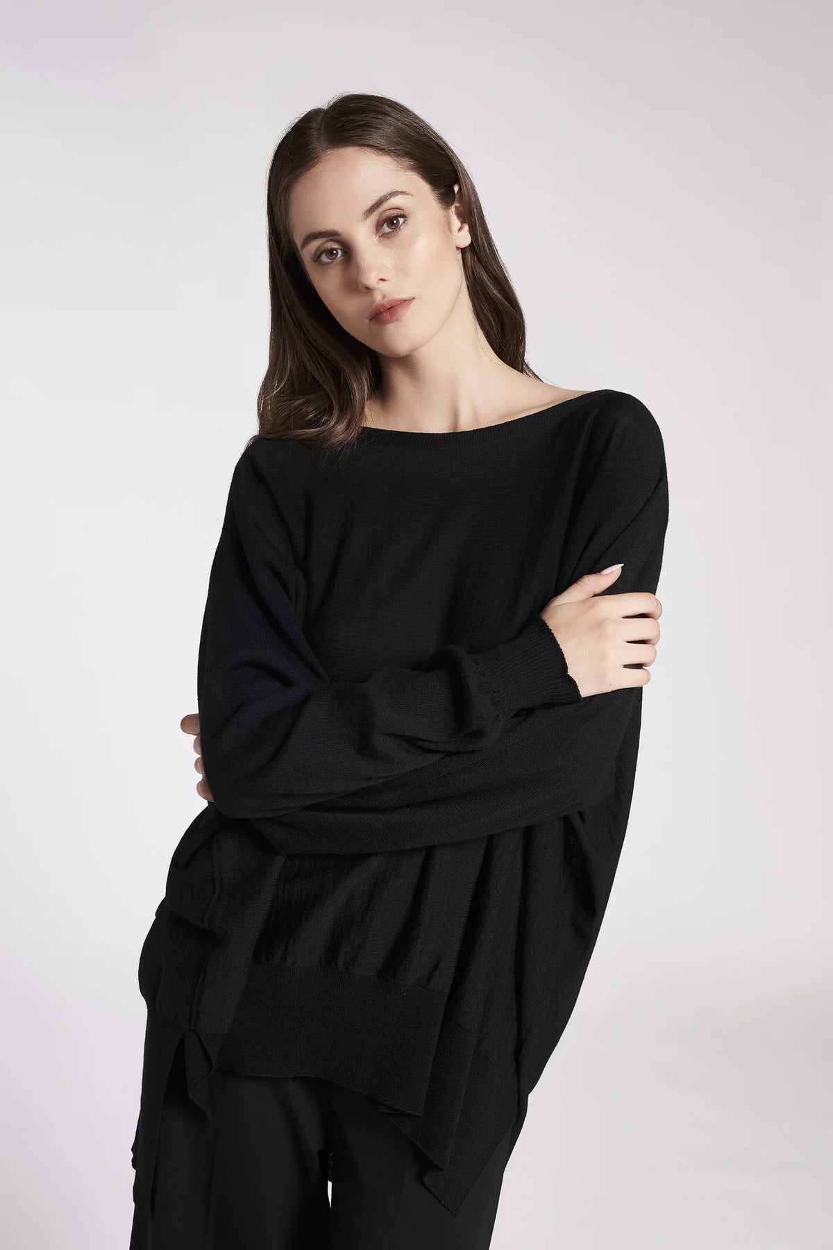 Maglia con scollo a barchetta svasata e asimmetrica. Fondo, polsini e collo con lavorazione a coste. Linea ampia e morbida, lunghezza sotto i fianchi.